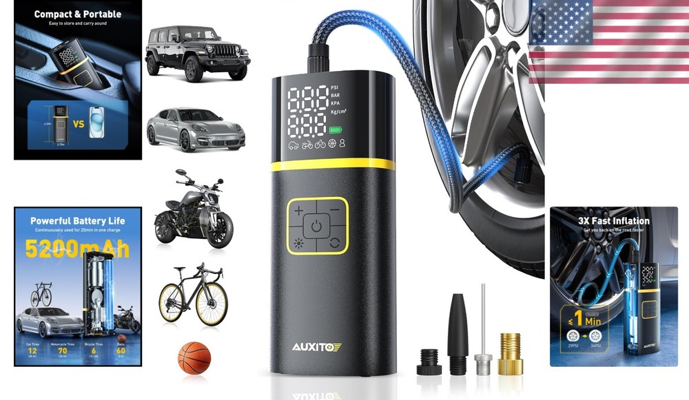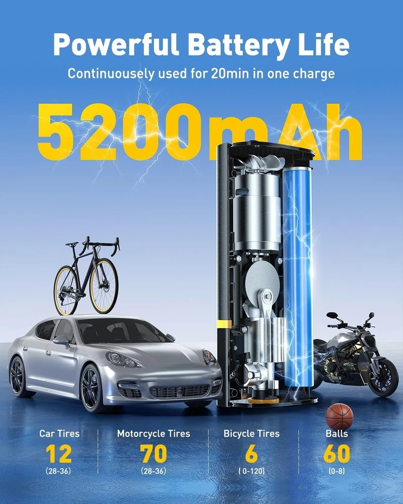 This tire pump is a game-changer for road trips! It inflates tires super fast, even from flat, and the rechargeable battery lasts forever. The LED light is super handy for nighttime emergencies, and it’s so compact it fits anywhere. No more struggling with bulky pumps—this one’s a must-have for every car!