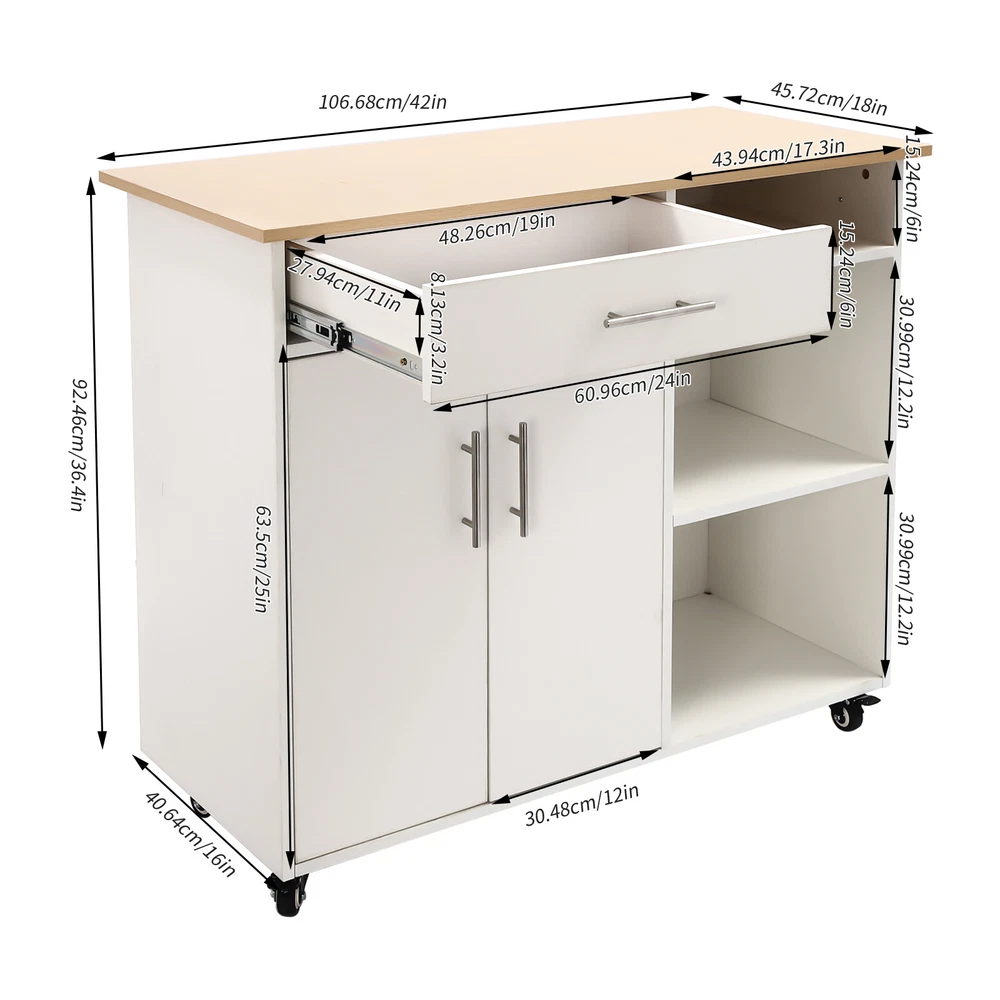 Specification Material: Ecological Boards, Hardware Color: White Style: Modern Assembly Required: Yes Mounting Type: Free Standing Number of Wheels: 4 (2 with Brakes) First Compartment Height: 15cm/6in Second and Third Compartment Height: 31cm/12.2in Table Size: 106.68*45.72cm/42*18in Cabinet Door Size: 63.5*30.48cm/25*12in Drawer External Size: 61*28*15cm/24*11*6in Drawer Internal Size: 48*28*8cm/19*11*3.2in Product Height: 92.46cm/36.4in Package Size: 110*48*16cm/43.31*18.9*6.3in Each Layer Load Capacity: 25kg/55.12lbs Gross Weight: 16kg/35.27lbs Net Weight: 15kg/33.07lbs Rolling Kitchen Island Side Table, Rolling Trolley Cart with Drawer Welcome to haohaofacai~ Description If you want to keep your kitchen organized or increase your kitchen storage space, then please take a look at this kitchen island cart from us. Our product is made of high-quality materials, durable, and structurally stable. Open compartments, large capacity cabinets and drawers increase your storage space. The contemporary exterior design makes it blend in with the most modern home decor. Four silent universal wheels provide you with the convenience to move this product. It will be an ideal assistant in your kitchen. Key Features Made to Last: Made of high-quality ecological board and hardware, this product is sturdy and wear-resistant , not easy to corrode and deform, ensuring a long service life. Multi-functional: The kitchen island cart makes the kitchen more than just a place to cook, but also a space for relaxation and emotional interaction. It's also super functional: countertops, storage cabinets, a dining area, and an additional side table for drinks and supplies during gatherings. Large Capacity: One drawer, three open compartments and a two-story cabinet provide ample storage space, where you can put small appliances, pots and pans, etc. for storage. Easy to Move: The 4 silent universal wheels make it easy to move it to where you need it. Two of the wheels with brakes can hold it in place. Strong Load-bearing Capacity: Each layer of the compartment can bear up to 55.12 lbs, so you don't need to worry about even placing heavy objects such as household appliances. Modern Appearance: The simple rectangular construction and classic white color scheme allow it to blend in with most modern home decor styles. Excellent Storage Assistant: The combination of drawers, open compartments, and cabinets allows you to categorize and organize napkins, utensils, small appliances, and other various kitchen items to keep your kitchen neat and organized. Effortless Cleaning: It has a smooth surface and an open structure, so you only need to wipe the dust or residue with a towel. Ideal Gift: With good performance and a modern appearance, it can be used as an ideal housewarming gift for parents, friends, and lovers so that they can also enjoy a more exquisite life. Details Practical Handles: The handles on the cabinet doors and the drawer are easy for you to open and close, providing easy access to your items. Towel Rack: It not only provides you with space to store your towels but also serves as a handle to easily move your cart. Application This product is suitable for home kitchens, restaurants, hotels, etc. Specification Material: Ecological Boards, Hardware Color: White Style: Modern Assembly Required: Yes Mounting Type: Free Standing Number of Wheels: 4 (2 with Brakes) First Compartment Height: 15cm/6in Second and Third Compartment Height: 31cm/12.2in Table Size: 106.68*45.72cm/42*18in Cabinet Door Size: 63.5*30.48cm/25*12in Drawer External Size: 61*28*15cm/24*11*6in Drawer Internal Size: 48*28*8cm/19*11*3.2in Product Height: 92.46cm/36.4in Package Size: 110*48*16cm/43.31*18.9*6.3in Each Layer Load Capacity: 25kg/55.12lbs Gross Weight: 16kg/35.27lbs Net Weight: 15kg/33.07lbs Package Included 1* Kitchen Island Cart 4* Wheels Other Accessories for Assembly Notes Please confirm whether the size of our product meets your requirements before you buy it. Please allow the slight color difference caused by the shooting light and 1-3cm error due to manual measurement, and make sure you do not mind before ordering. Payment Delivery details Terms of sales About us Contact us Payment We accept ebay payment 。 Fees such as import duties, taxes are not included in the item price or shipping costs. These charges are the buyer's responsibility. Delivery details Shipping: 2-9 working days to: USA Terms of sales We maintain high standards of excellence and strive for hundred percent customer satisfaction. Feedback is very important to us. We hope that you contact us immediately before you give neutral or negative feedback, so that we can address your concerns. It is impossible to address issues if we do not know about them! About us Your satis faction is our ultimate goal. We work hard to earn your trust and future business. Our certified technicians have tested each item before shipping. The unit comes with 1 year limited warranty on all manufacturing defects. a) If you receive a defective item, you may return it or ask for a discount. Please contact us within 14 days after you receive the package. b) What you returned must be intact and in its original packaging as re? u. Customer is responsible for shipping costs of the returned item. c) We will cover the cost of shipping back t with the shipping rate indicated in the registration page. We will send you a new unit or refund the full payment you paid. Thank you. Contact us Business Hour Business Hour: Monday To Friday: 8:30 AM to 5:00 PM (Beijing China time) Due to time zones, our reply to your questions may not be immediately. But within above working time, we will reply your email within 24 hours. If it's non-workdays, please kindly be patient and wait till Monday. Please contact us with ebay message. Please feel free to contact us if you have any questions. Monday To Friday: 8:30 AM to 5:00 PM (Beijing China time) Due to time zones, our reply to your questions may not be immediately