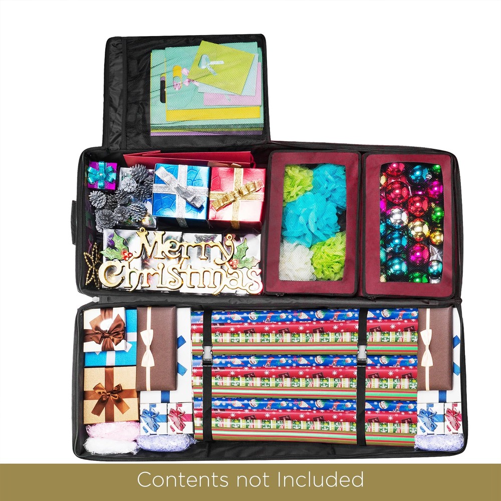 , organize, and transport wrapping paper for every occasion inside this Rolling Wrapping Paper Organizer and Gift Wrap Station by . Designed to prevent gift wrap supplies from flattening and wrinkling, this paper organizer holds 30 to 40-inch wrapping paper rolls securely with a strap that keeps them in place and includes removable storage bags and four mesh pockets for seamless storage of gift bags, ribbons, bows, and tissue paper alongside your gift wrap. Rollerblade wheels on the base make this paper organizer simple to move, even if you use the wrapping paper holder for stowing Christmas decorations. IMPORTANT: is committed to providing the consumer with the absolute best price and value on our entire line of products. NOTE: This is an exclusive product of and ONLY Christmas Gift Wrap Storage Organizers by are GUARANTEED to be genuine. Avoid buying counterfeit products and transacting with unauthorized sellers. HOLDS UP TO 40” ROLLS - At 42” long, this innovative storage bag is long enough to hold 40” rolls of paper and has a strap to secure them in place during transit. Pulling out flattened, wrinkled, or torn left over gift wrap will be a thing of the past! ROLLING ORGANIZER -The 3 built-in roller blade style wheels and nylon handles make transporting this organizer a breeze! Its durable oxford canvas construction ensures this wrapping paper storage box will be ready for duty year after year. REMOVABLE BINS - Along with 4 mesh pockets that hold small items and a dual sided compartment ideal for gift bags, tissue paper and flat wrap, the tote also has 2 removable storage bags to keep bows and accessories within reach while wrapping gifts. CONVENIENT STORAGE - Keeping your unused Christmas, holiday, birthday, or wedding gift wrap neat, organized and all in place has never been easier! The reinforced sides of this storage bag will keep your gift wrap fresh for the next season. PRODUCT DETAILS - Material: 600d Oxford Canvas, Mesh, Nylon & Polyurethane Wheels. Dimensions: (L) 42” x (W) 16” x (H) 13”, Removable Bins: (L) 16” x (W) 10” x (H) 7”. Zipper Closure. Some Assembly Required. Color: Burgundy Red.