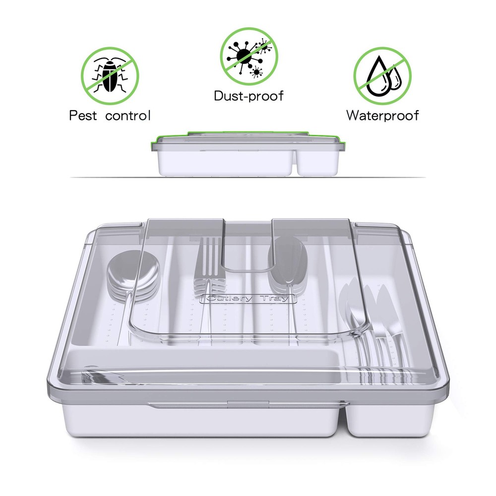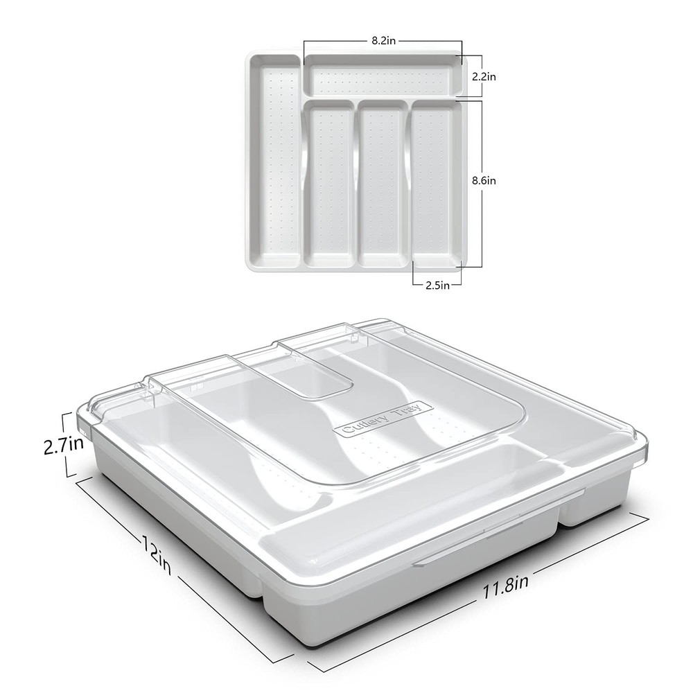 Tray features 5 dividers that help in organizing different cutlery pieces Dusty-Proof: Tableware organizer with lid is dust-proof to keep your Utensil clean while put them in the countertop and drawer. No need to clean again when you use Silverware. 5 Compartments : Cutlery Organizer with 5 rectangular compartments allow you to safely store and organize forks, knives, spoons, chopsticks, wine openers, spatulas, tongs and other cooking tools. Easy To Carry: Our covered utensil organizer fits in most kitchen drawers. The clear lid allows you to quickly see the contents inside. Perfect for college dorm rooms, summer houses, picnic and RV's. Organize Well In Most Drawers: 12*12*2.7 inchs Silverware tray with clear cover made you easily locate all of your tableware without having to search around in various containers, is great store in the drawer or table. High Quality Material: The Lid is BPA-free food-grade PP and the tray is made of bamboo, which is fine workmanship, beautiful and practical. We recommend not to soak it with water, you can wipe it with a damp cloth..