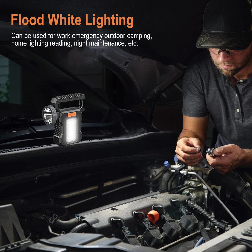 Simplified description of selling points: Efficient lighting: 200 lumens of front light XTE, 90 lumens of white light with 18 2835 lamp beads on the side lights, meeting different lighting needs. Long battery life: 5 hours of use in front light strong light mode, 7 hours in side light mode. Quick charging: Fully charged in 3 hours, supports Type-C interface charging. Multi-function mode: including front light strong light, front light weak light, side light on, red and blue flash and off functions. Portable and durable: 191g lightweight design, ABS material, waterproof in daily life, suitable for outdoor use. Specifications: Product name: K8801 solar work light-EBW2293 Lamp brand and model: Front light XTE (200 lumens) Side light 18 2835 lamp beads (white light 90 lumens) Sales power: 20W Light color: white light Color temperature: 6000K Switch position and method: Press switch Real lumen and wattage: 200LM (front light), side light 90LM Battery model and parameters: Built-in 1200 mAh 18650 battery Full set configuration: 1 work light, 1 Type-C data cable