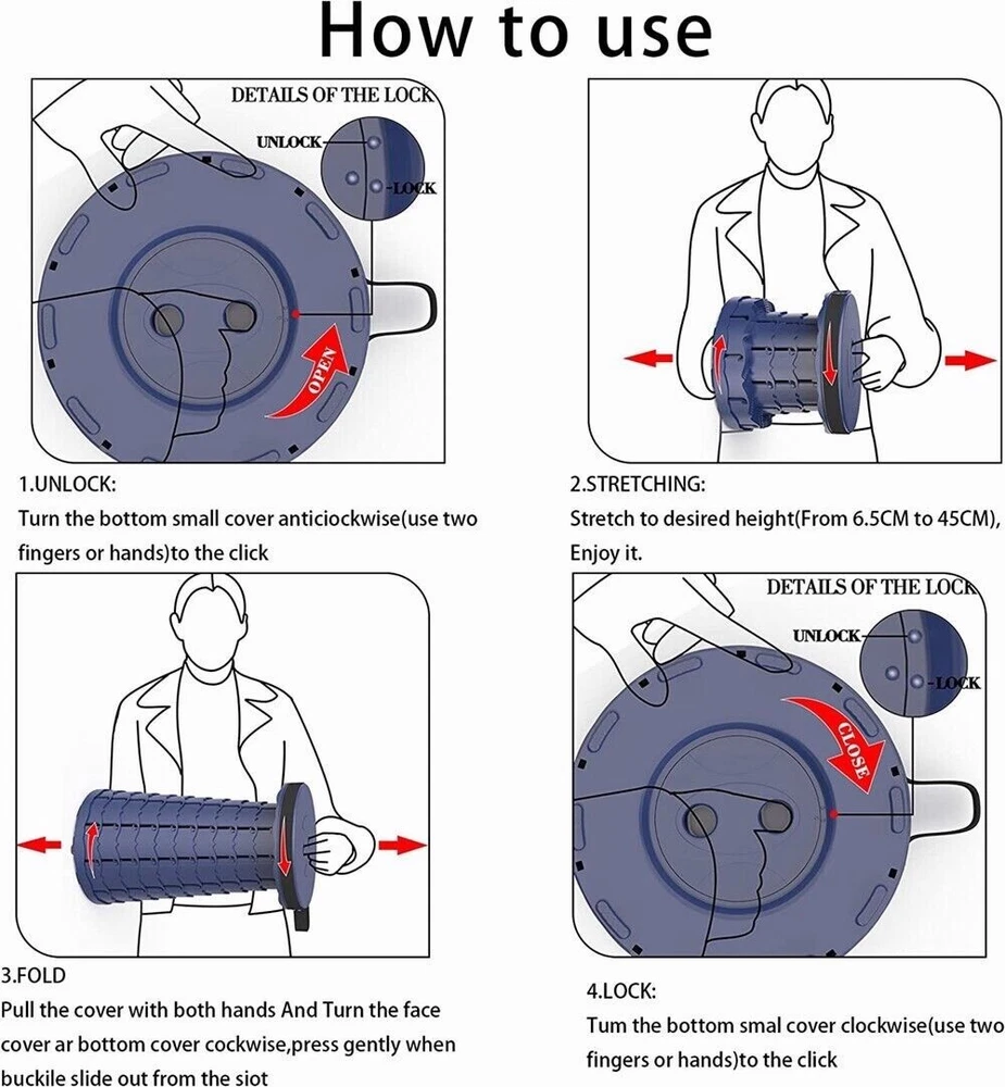 Features: Made of high-strength nylon and PA66 material, the body consists of 120 locking clasps. Support takes on fish scale design, the structure is more stable and the load capacity is larger, which can reach 440lb. UNIQUE DESIGN: There are two buckles on the top and bottom of the portable telescoping stool. You can also hold the two buckles to stretch them and turn them clockwise / counterclockwise, making them easy to open and close. HEIGHT ADJUSTABLE/RETRACTABLE: The telescoping stool adjustment range: 2.5inch - 17.7inch, this adjustability makes it suitable for both adults and children. PORTABLE LIGHT-WEIGHTED DESIGN: Portable telescoping stool is equipped with an adjustable nylon strap that is not easy to break and deform. You can carry it by hand. The diameter of the product is 9.7inch and the weight is 2lb. WIDE APPLICATION & SATISFACTION GUARANTEE: Portable telescoping stool is very suitable for indoor and outdoor, such as living room, bedroom, office, camping, travel, fishing, leisure, grilling, gardening, etc. The beauty, functionality, durability and portability of telescoping stool make it a best choice for friends and family for holidays or any occasions Package Includes: 1Pcs