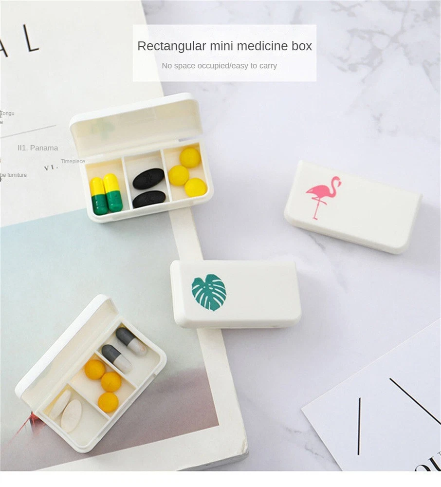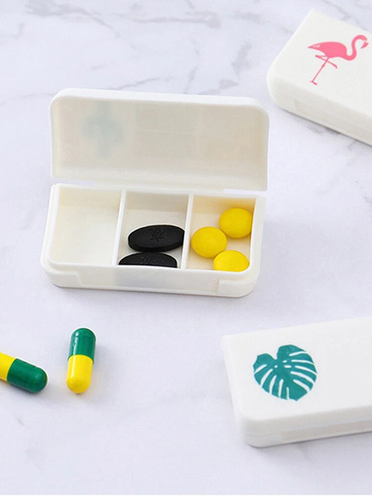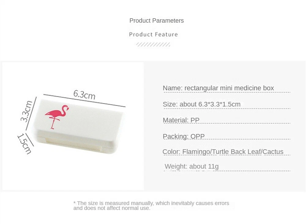 Description: Name: rectangular mini medicine storage basket Size: 6.3*3.3 * 1.5cm Material: PP Packing: OPP Color: flamingo, turtle leaf, cactus Weight: about 11g Specifications: 1. Fresh pattern, beautiful and fashionable 2.PPT material, wear-resistant and durable 3. Buckle design, convenient opening and closing, sealing and moisture-proof 4. Three independent cometred, convenient and hygienic, easy to find 5. Lightweight and compact, easy to carry, about 6-7 pills can be placed Package Included: 1*medicine storage basket