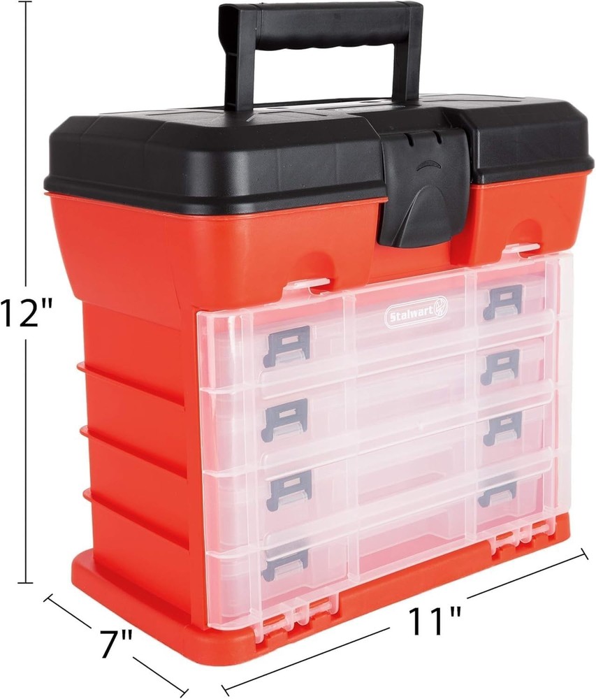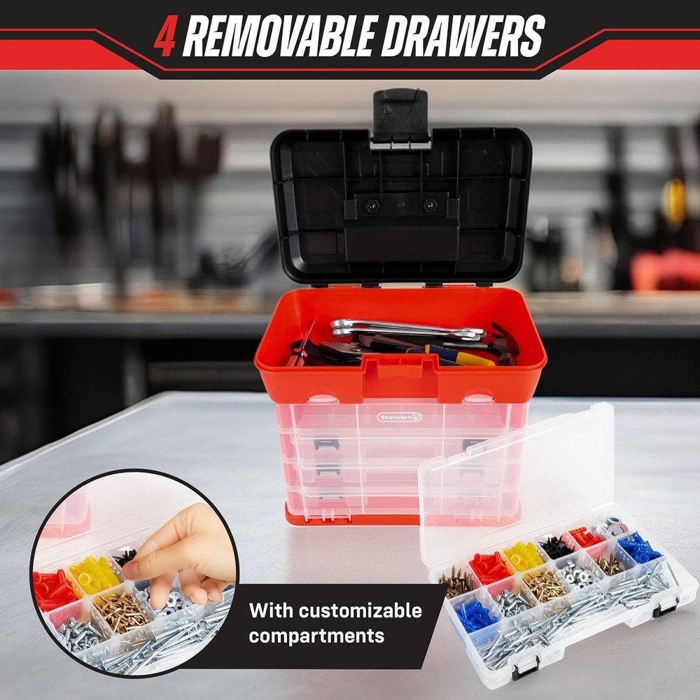 Portable Tool Storage Box - Small Parts Organizer with 4 Multi-Compartment Trays for Fishing Tackle, Hand Tools, or Craft Supplies by Red COMPACT MULTI-TIER ORGANIZER BOX - This portable tool box organizer takes up minimal space at home on your workbench or craft table and has a convenient carry handle for securely transporting your tools and supplies in your travel luggage or vehicle. FOUR REMOVABLE TRAYS WITH LIDS - Each removable 13-slot tray in the tool organizer has 12 sections for sorting different small parts and a full-length area for bigger or longer pieces, such as extra-long needles, hardware nails, and fuzzy pipe cleaners. SECURE LATCH CLOSURE FOR EACH SECTION - In addition to dedicated flip lids on all storage sections, this parts organizer box keeps all your important supplies sorted inside with a secure front lid that keeps all four removable compartments in place. VERSATILE STORAGE WITH SIZABLE CAPACITY - Use this multipurpose storage solution as a traditional tool and screw organizer, handy tackle box for fishing, or sorting and storage box for jewelry beads, school or office supplies, or crafting materials. PRODUCT DETAILS - Materials: Polypropylene. Dimensions: (L) 11" x (W) 7" x (H) 12"; Top Tray: (L) " x (W) " x (H) "; Removable Tray: (L) " x (W) 5" x (H) ". Keep all your hobby tools and small supplies neatly sorted and easy to carry with this multi-compartment Storage Tool Box by . The top section of the portable organizer box lets you store and quickly access your most-used tools, while the four multi-compartment trays hold a sizable collection of small mechanical parts, hardware, jewelry components, fishing tackles, or crafting supplies and can be used separately to suit your specific storage needs. Constructed from durable, high-impact polypropylene plastic, this versatile small tool box organizer holds up to its full space capacity. , for storage solutions that are SMART, STRONG, and SECURE. IMPORTANT: is committed to providing the consumer with the absolute best price and value on our entire line of products. NOTE: This is an exclusive product of and ONLY Tool Box Organizers and Storage by are SATISFACTION GUARANTEED to be genuine. Avoid buying counterfeit products and transacting with unauthorized sellers. ..