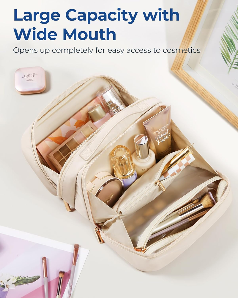 This makeup bag is a game-changer for travel! The wide-open design makes it super easy to organize all my essentials—bottles, brushes, and even travel-size toiletries fit perfectly. The beige color is chic, and the quality feels durable. Love how everything stays in place, and the multiple compartments are a lifesaver. Highly recommend for anyone who wants a stylish, functional cosmetic bag!