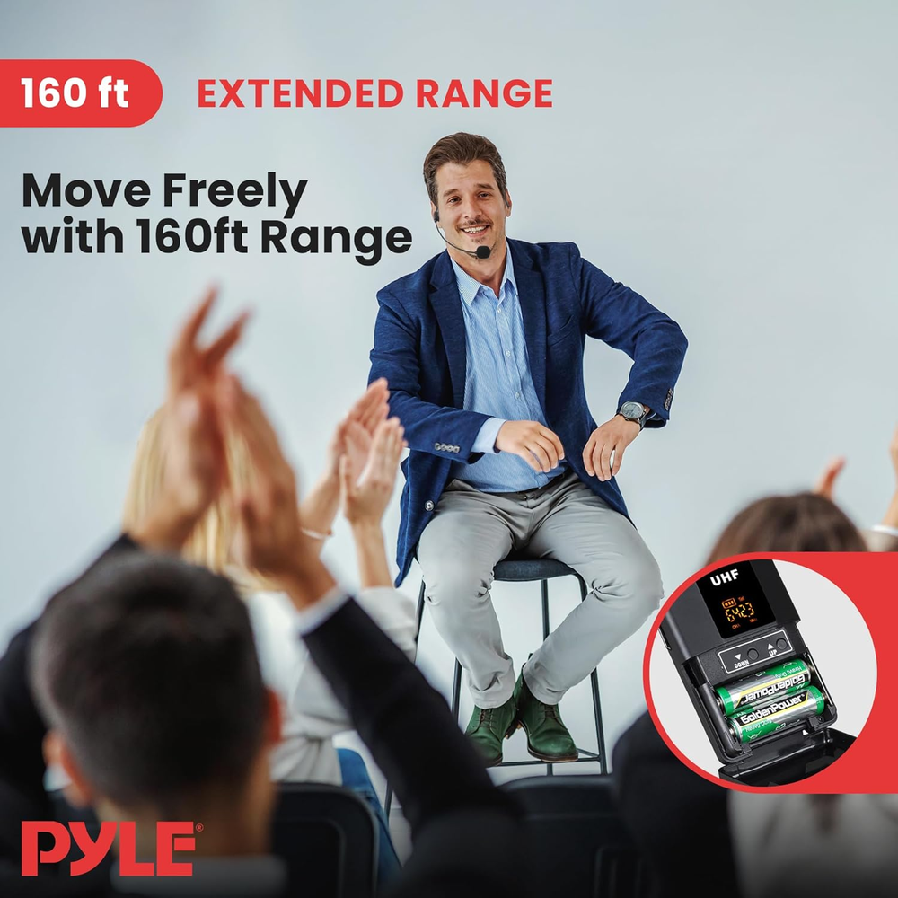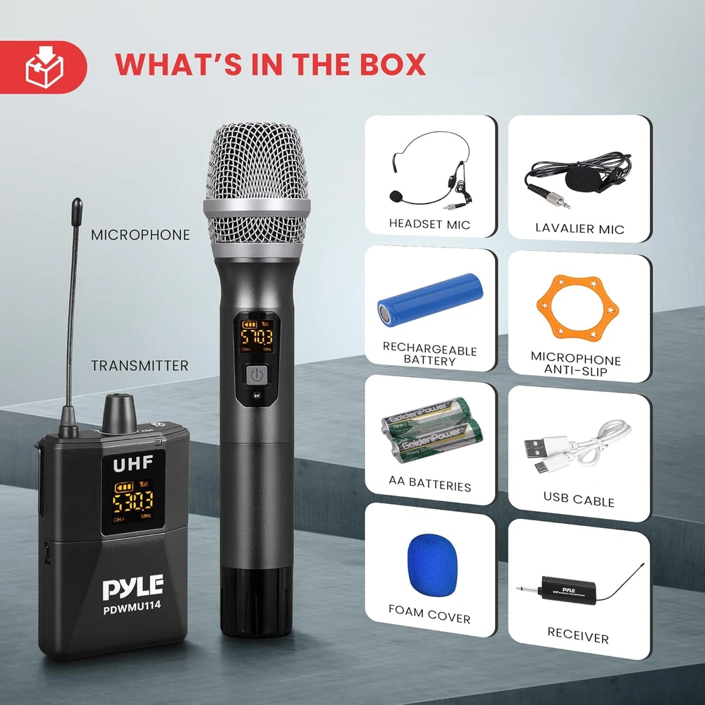 UHF NARROW BAND: These cordless microphones for singing feature UHF audio transmission for unsurpassed performance w/ high signal over noise ratio for clear, distortion-free, crisp vocal & excellent sound reproduction unlike low-grade VHF unit SELECTABLE FREQUENCY RANGE: This wireless professional microphone features digital display w/ 8 channel selectable mic frequency range w/ low distortion. Enjoy cordless singing to karaoke music & mobility for energetic on-stage performance AUDIO RECEIVER: Pyle wireless microphone system includes a plug-in audio adapter receiver with ¼” (6.3mm) jack. Features integrated antenna for extended wireless range. It directly connects to amplifier, stereos, audio processors, and DJ mixer 160' FT OPERATION RANGE: The wireless microphone set features up to 160'+ ft. operation range & lets you move w/ ease without those annoying cords. Used for karaoke, classroom, office/business applications. Perfect for public audio & studio use EASY TO OPERATE: This microphone system is battery-operated & easy to control. Features independent & adjustable channel volume control, convenient power ON/OFF switch, LED indicator lights, & LCD digital display screen for frequency read-out System Features: - UHF Band Microphone System - Operation Range: Up to 160'+ ft. - LED Digital Display Readout Screens - Simple Setup & Hassle-Free Operation - AF & RF Audio Transmission Signal Strength Indicators - Independent & Adjustable Channel Volume Controls - Selectable Frequency Range: Up to (8) Channels - 1/4" Audio Output Jack - XLR Balanced Output Jack What’s in the Box: - Receiver Base - Beltpack Transmitter - Handheld Microphone - Headset Microphone - Lavalier Microphone - Power Cable Transmitter Specs: - RF Output: >10 dBm - Modulation Type: FM - Max Deviation: ± 40 KHz - Spurious Emission: > 55 dBc - Nominal Current Drain: Receiver Specs: - Signal / Noise Ratio: -105dB - Border Upon Channel Rejection: >70dB - T.H.D.: <1% - Audio Output Level: 0-300 mV - Dimensions 6.8 x 5.3 x 1.7 in - Power Supply: 110/220V (12-15V Power Adapter)