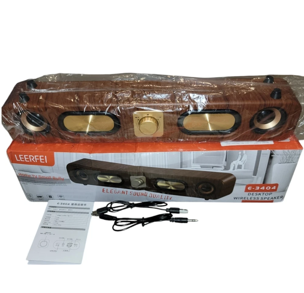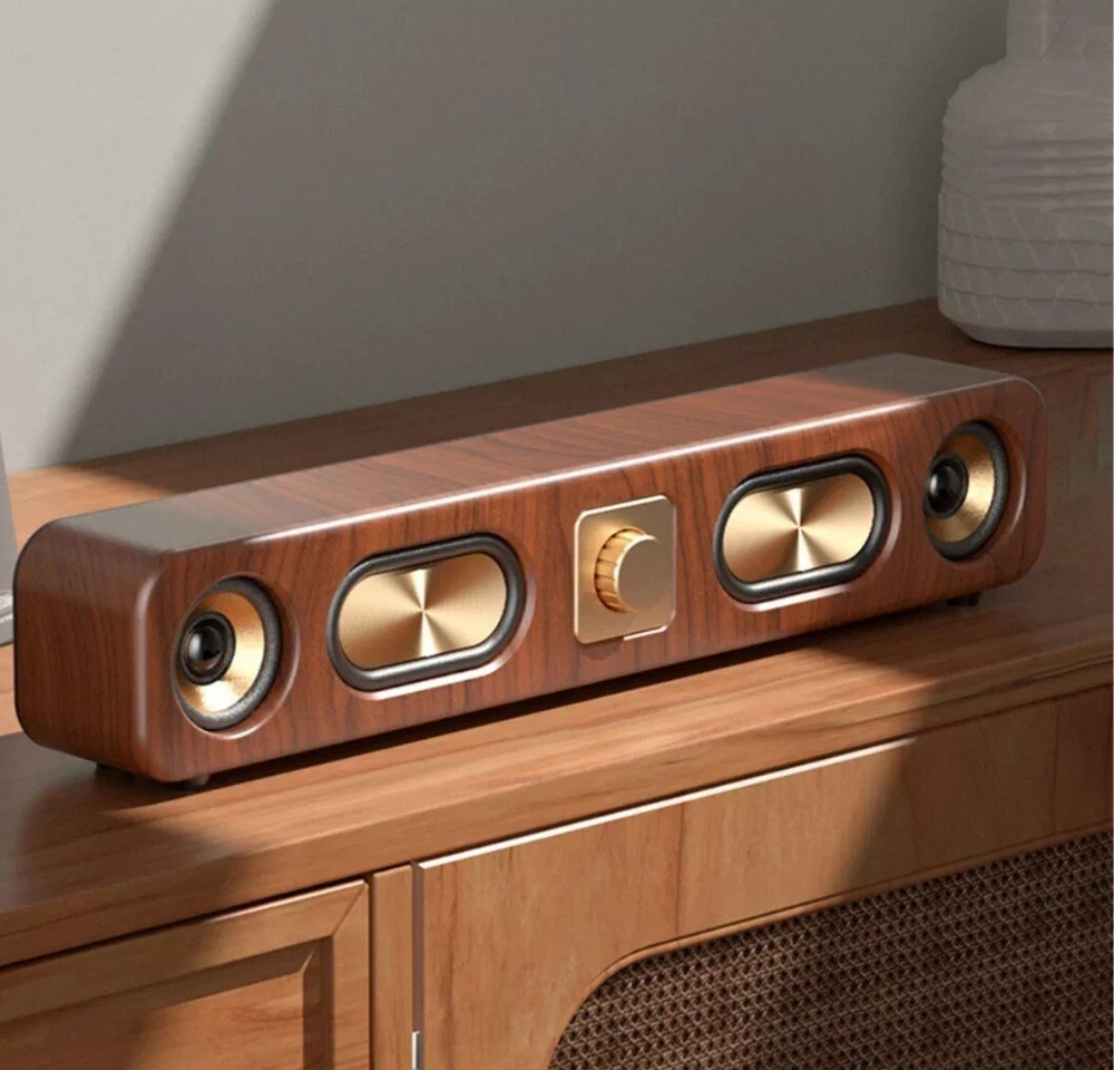 Open box/brand new The Portable Vintage Soundbar 10W Wireless Bluetooth Speakers feature a retro design with wood grain finish and dual HiFi stereo bass for high-quality sound.