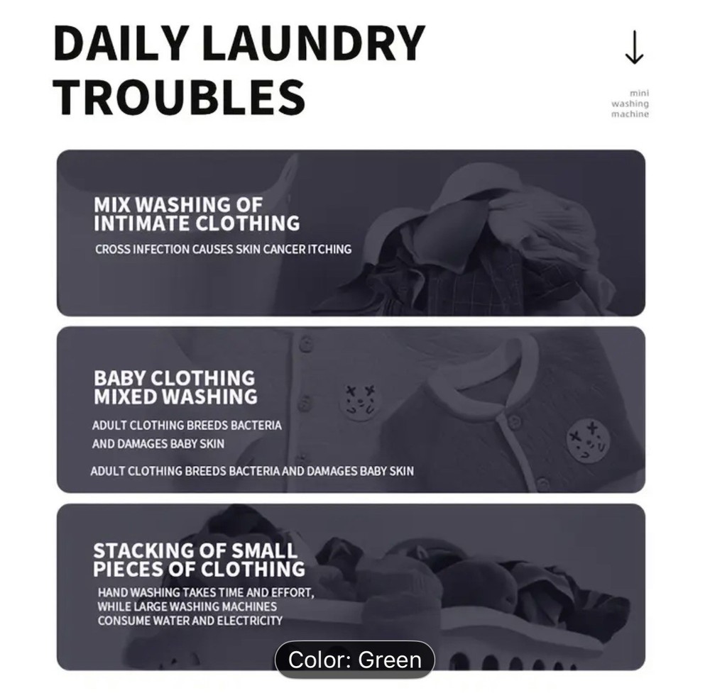 MPN:Does not applyInstallation:PortableSize Category:Compact/MiniEnergy Star:A+++Model:MLSC-01Washer Capacity:8 lbLoad Type:Top-LoadingPower Source:ElectricItem Depth:Less Than 20 inColor:GreenOperating Sound Rating:40 dB or LessBrand:UnbrandedPower:400 W or lessCountry/Region of Manufacture:ChinaWash Programs:Quick Wash