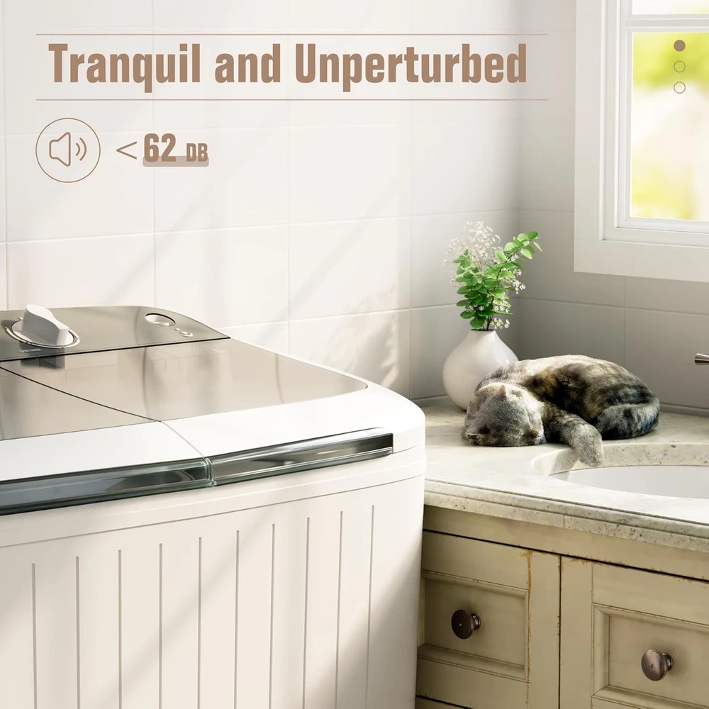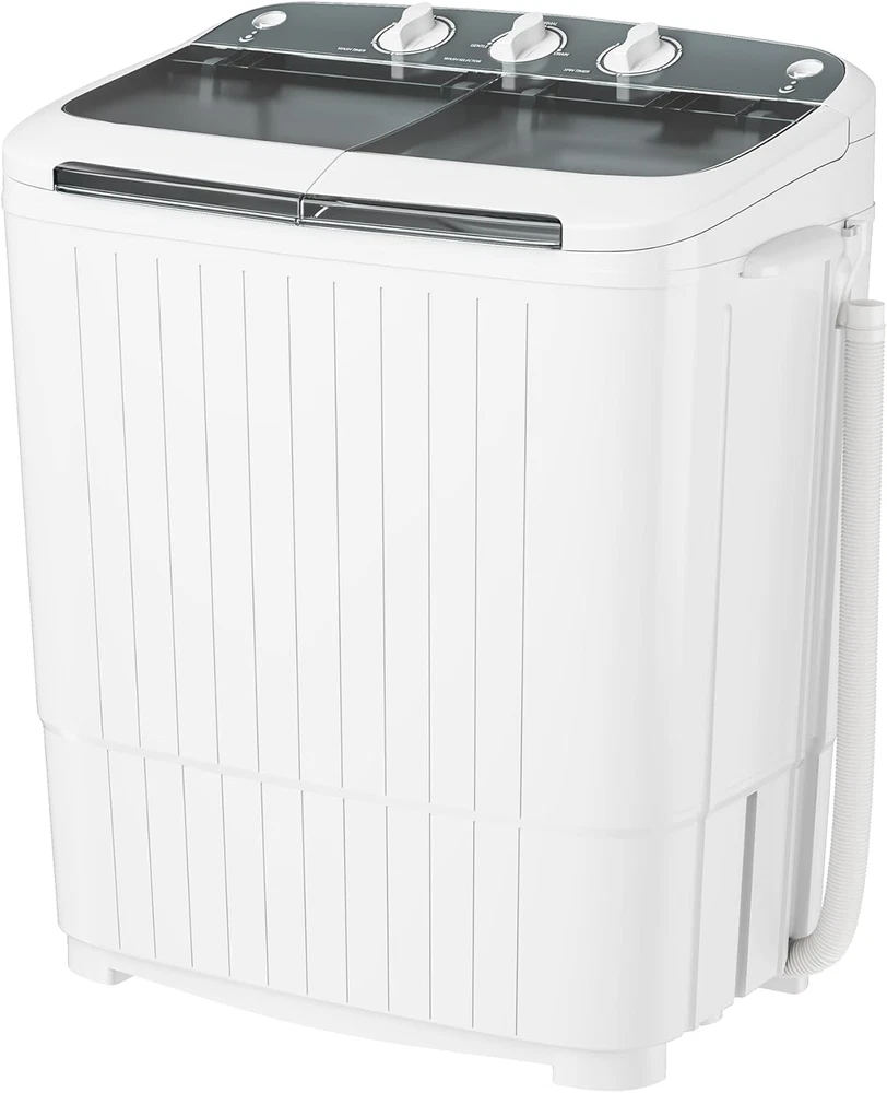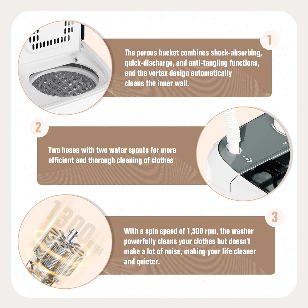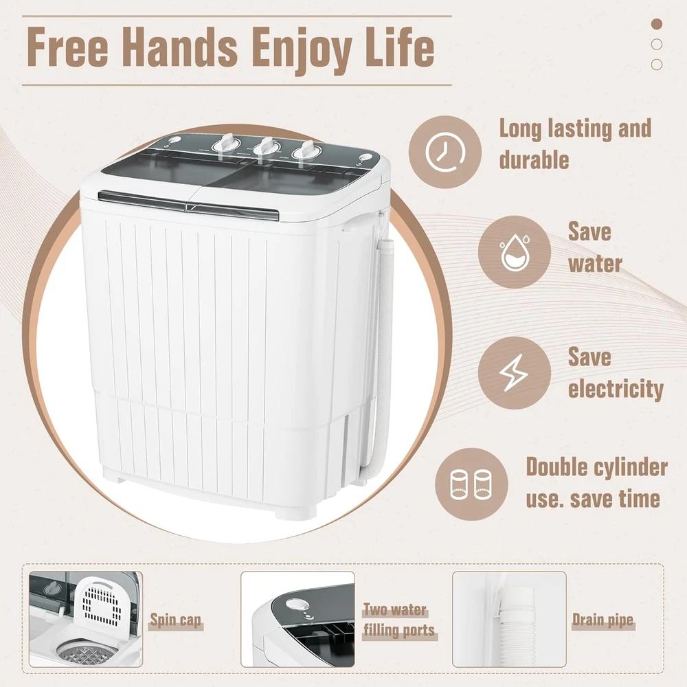 【Easy to Operate】: Portable mini washing machine saves you 30 times to go to the laundry, relax your hand and say goodbye to laundry expense. Based on washer button, put your clothes in - fill with water - set time - rotate start button - Go and Have rest. Simply enjoy fragrance of laundry detergent 【Powerful Performance】: The portable washer features a 1300RPM powerful motor with a max frequency of 60Hz,250W washing power and 140W spinner power, saving much effort on washing. Also, small washing machine combo has a drain pump, which allows you to easily drain out dirty water 【Twin Tub Design】:Twin tub washer machine is designed with washing tub and spin tub. A filter net on the side of washer tub for quick filtering. After washing, just take them out and put them into spin side of mini washer, let spin cover above the clothes to avoid the shaking and spinning 【Separate Time Control】:The apartment washing machine controls washing cycle is up to 15 minutes and the spinning cycle is up to 5 minutes each load, finish fast washing and saving you valuable time and. Washing modes: Gentle/Norma/Drain, which is free to set your timer and mode 【A gift and Assistant】: Lightweight and space-saving design of clothe washing machine is easy to move and portable, ideal for bathroom, camping trips, dormitories, or anywhere with limited space. By the way, such a beautiful and practical washing machine can be a gift for your family or friends Product Description