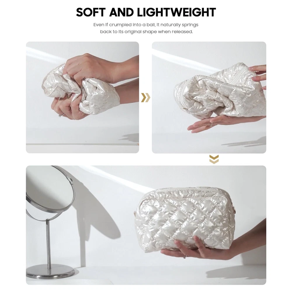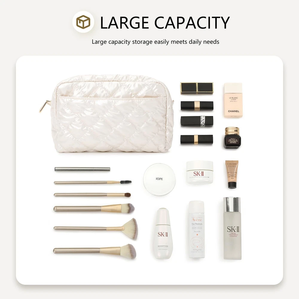 This makeup bag is a game-changer! The soft quilted material feels luxurious, and it fits all my essentials without bulk. The waterproof lining saved me from spills, and the multiple pockets keep everything organized—perfect for travel or daily use. The zippers glide smoothly, and the compact size makes it easy to toss in my purse. A must-have for anyone who loves staying neat on the go!