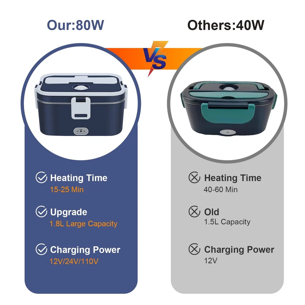 lunch box food electric warmer heated car portable fast heater 3 In 1 Electric lunch box: Do you often stand in line to heat up your meals or eat fast food? Come here! Our upgraded electric lunch box will solve this problem and let you enjoy hot meals anytime, anywhere! This electric heated lunch box supports 110V-220V home/office + 12V car and 24V truck use. Perfect for truck drivers, workers, office workers, etc. Make you enjoy hot and healthy meals 100W Faster heating: To shorten the heating time, we specially use the latest design of PTC thermostatic heating. Heat up your lunch as fast as possible, in just 15-35 minutes, you can have fresh and warm home-cooked food in the shortest time at office. This electric food heating lunch box is designed with circulating heat to keep your food nutritious and fresh. Keeping you eating healthy 1.8L+0.45L large capacity: The previous 1.5L capacity food warmer lunch box was not enough to meet the needs of some adults. That's why we designed this 1.8L capacity specifically for adult men or people who eat larger amounts of food. In addition, we offer a 0.45L plastic compartment where you can place different kinds of food individually. They are easy to clean and dishwasher safe Double layer leak-proof design: Sealing and leak-proof are the key points of our good food heater lunch box. We designed four side snaps, plus a built-in rubber seal, you no longer have to worry about soup leaking during transport, or a mess in the car.Comes with an insulated carrying bag to protect the box in heavy rain and dust Perfect for you: You will be surprised to find a small compartment on the lid to store your spoon and fork, you can also use it as a phone stand to enjoy your food while watching a movie. If you receive our electric lunch box food warmer is broken and there is a quality problem after using it for a period of time, please contact us and we will provide a satisfactory solution for you Heating Time: Summer: 25-30 minutes Shipping We offer FREE shipping on all orders! We ship within Three business days of payment, usually sooner. We use a selection of shipping services such as UPS, FedEx, USPS etc. We only ship to the lower 48 states, no APO/FPO addresses or PO Boxes allowed. Local pickups and combined shipping options are not provided at this time. Return You can return a product for up to 30 days from the date you purchased it. Any product you return must be in the same condition you received it and in the original packaging. Please keep the receipt. Payment We accept payment by any of the following methods: PayPal Please pay as soon as possible after winning an auction, as that will allow us to post your item to you sooner! Feedback Customer satisfaction is very important to us. If you have any problem with your order, please contact us and we will do our best to make you satisfied. Contact Us If you have any queries, please contact us via ebay. We usually respond within 24 hours on weekdays. Please visit our eBay store to check out other items for sale! Thank you for shopping at our store.