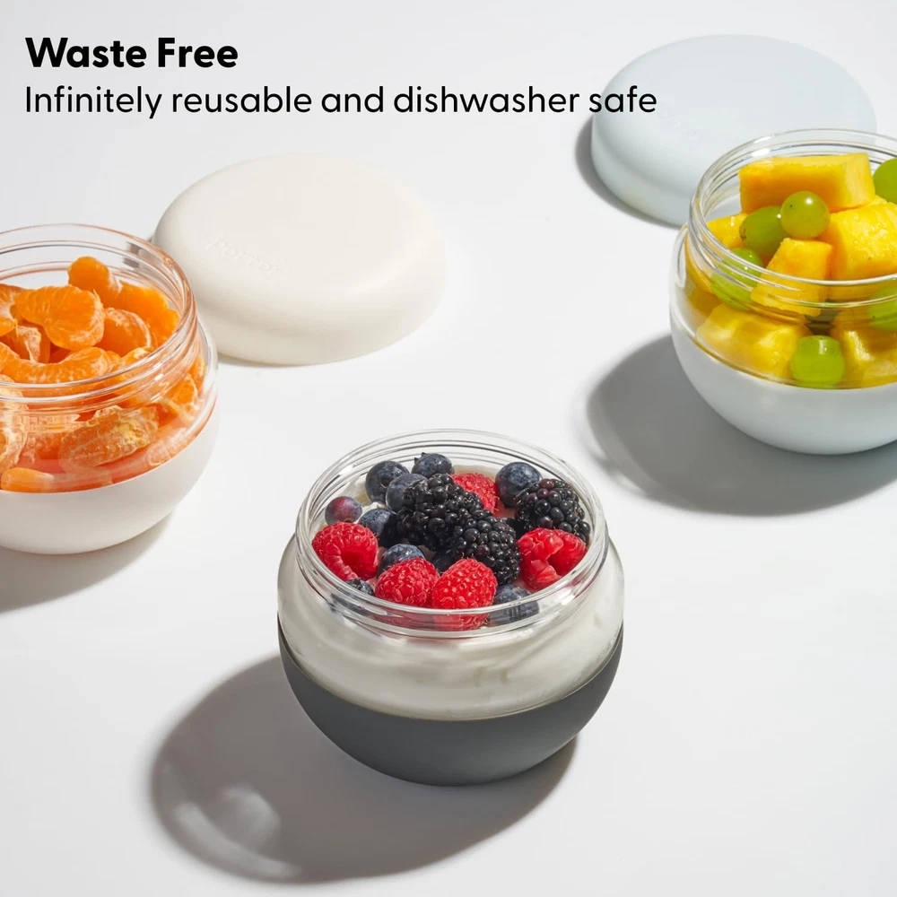 PREMIUM, FOOD GRADE MATERIALS: Crafted from durable borosilicate glass, the bowl is wrapped in the highest quality protective silicone while the screw-top lid prevents leaks and spills; Dimensions: 4.33 x 3.47”, Capacity: 16 oz. SUSTAINABLE: From soups to snacks, leak-proof your leftovers with the reusable Porter Seal-Tight Bowl; Designed to encourage healthier everyday habits, this eco-friendly bowl is the perfect alternative to plastic takeout containers MODERN DESIGN: Packed lunches have never looked so good. Available in pretty pastel hues, the Porter Seal-Tight Bowl’s sleek design elevates the everyday so you can enjoy a civilized meal wherever you go LEAK-PROOF YOUR LUNCH: Designed for on-the-go dining, the glass bowl seals tight with a screw-top lid & the double-walled glass construction keeps meals warm. The compact size fits easily into most bags, so toss it in your bag with peace of mind SAFE & CLEAN: Made from BPA-free, food-grade glass, the Porter Seal-Tight Bowl is microwave-safe and dishwasher-safe (but not oven-safe)