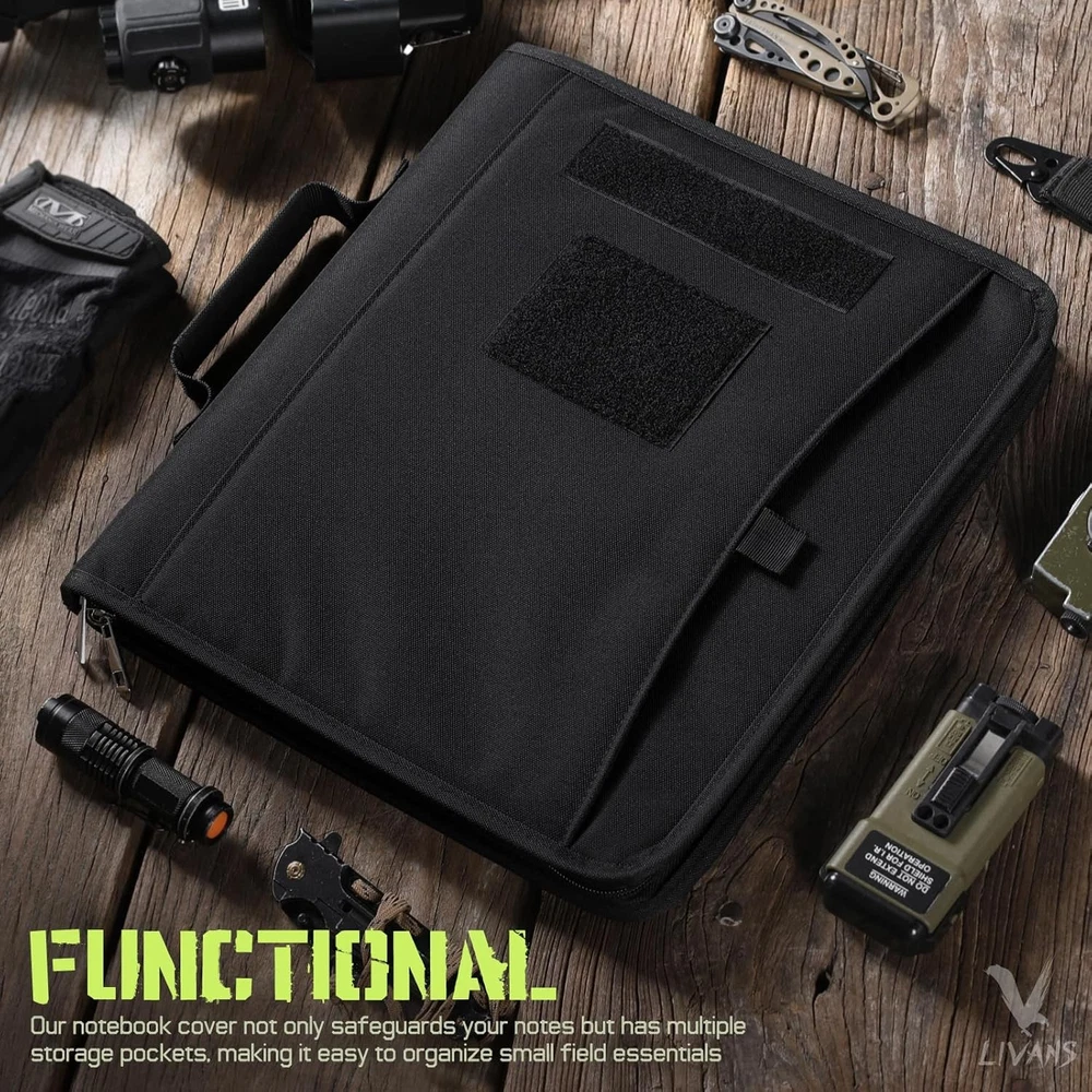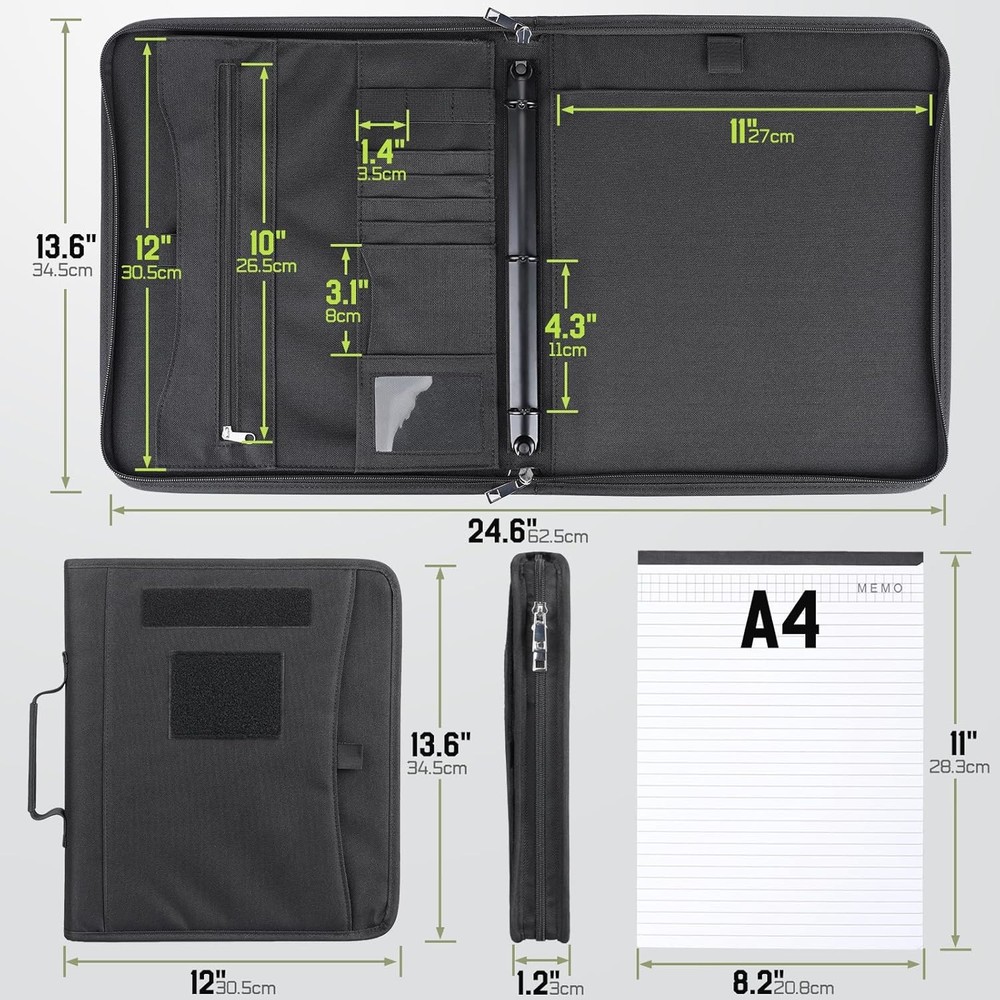 About this item Easy To Carry : Larger than A4 size (12 x 13.6 x 1.2 inches), Padfolio ring binder built with multi-functional pockets and a strong handle. Easy to carry all your necessary items, like a portfolio handbag without any mess, ideal for outdoor enthusiasts, field work, office professionals, and college. All-in-One Storage : Portfolio organizer offers ample storage space for essentials. Hoop-N-Loop-type exterior pocket for easy access to loose papers. Multiple interior pockets, card slots, and pen loops to keep pens, driver's license, cards, iPad, notepad, and cash neatly organized. Customize & Expand Papers : The planner binder comes with a detachable 3-ring metal binder, easily customize and expand. Refill 3–ring loose-leaf paper, like budget /calendar planner, blank / lined /grids paper, or as a notepad, file folder organizer and clear game card binder. Secure & Durable Protection : Zip 3-ring binder crafted from durable 1000D fabric tactical notebook cover offers rugged durability and 2 zipper closures, safeguarding your important documents from rain and dust damage. Personalized Decoration (Include a US flag patch) : Binder notebook with patches to reflect your personality. Express your uniqueness by decorating the binder according to your preferences, and embrace the spirit of adventure and patriotism. Ready-to-Gift Notebook (includes 25 sheets of A4 letter paper) : Portable handle, zipper closure, multifunctional pocket, detachable binder - carefully designed for personalized paper configuration. A truly thoughtful present that helps organize thoughts and safeguard every story. Color: Black Material: 1000D Fabric, Polyester Capacity: 1.98 Pounds Brand: Sheet Size: A4 letter paper(8.2" x 11" // 20.8 x 28.3 cm) Inches