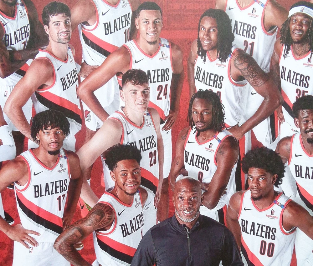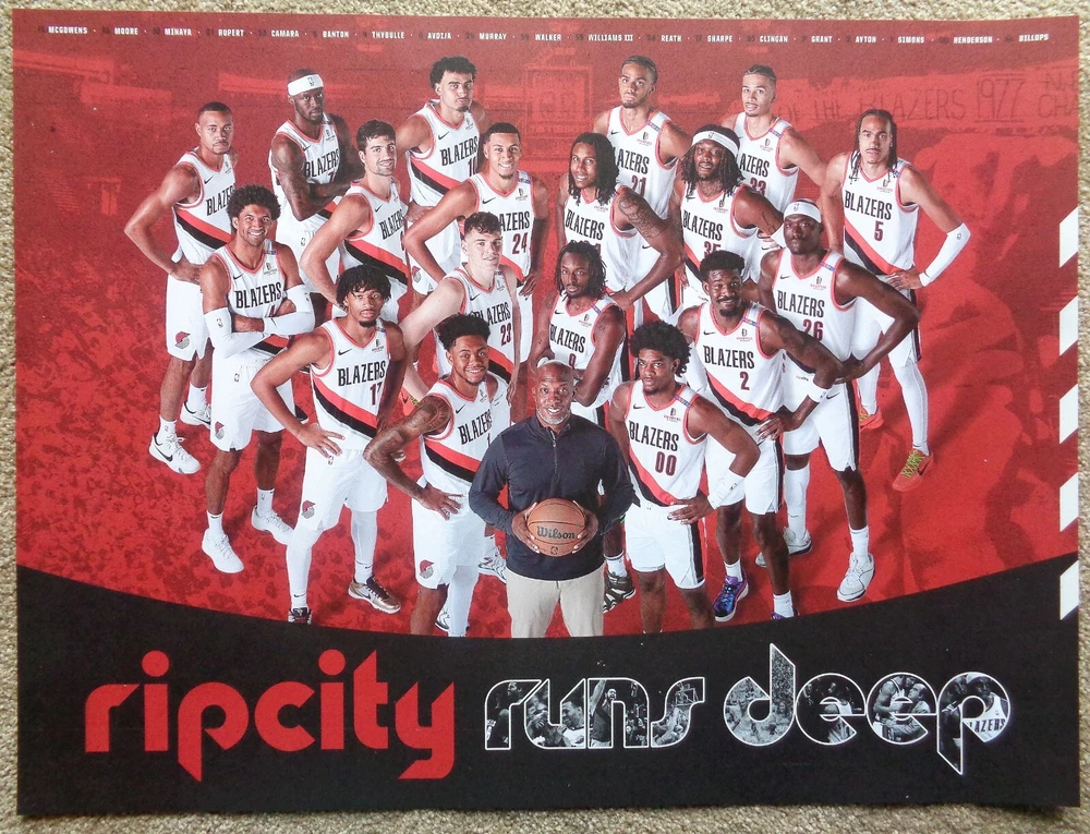 This new Portland Trailblazers poster is the official 2024-25 TEAM one. Each year the Blazers issue a team poster and this one pictures the Blazers of 2024-25 with 18 players shown plus coach Chauncey Billups. Each player’s last name is listed at the poster's top. Among those pictured are Donovan Clingan / Shaedon Sharpe / Deni Avdija / Anfernee Simons / Scoot Henderson / Jerami Grant / Toumani Camara / etc. Size is 24” by 18”. It is in great condition for display, at least Mint/Near-Mint. It will shipped rolled in a sturdy tube. See my EBAY Store and current listings to save shipping on multiple items. Shipping includes private insurance.