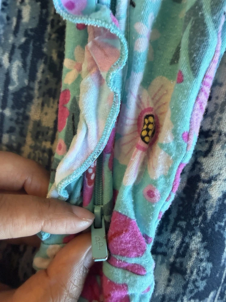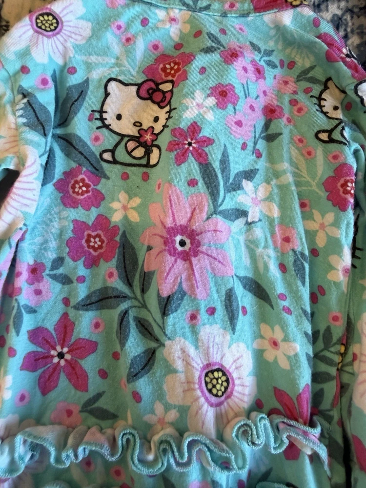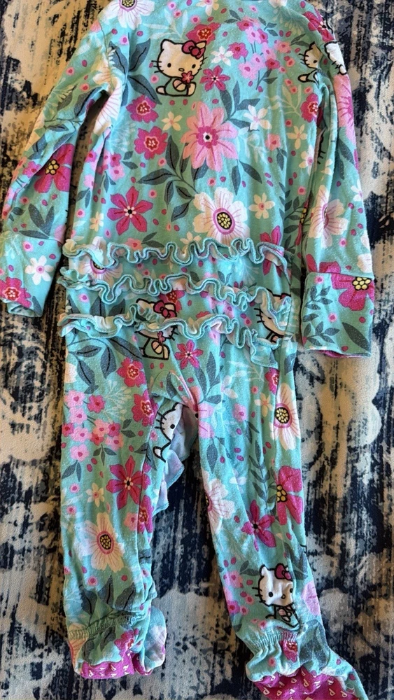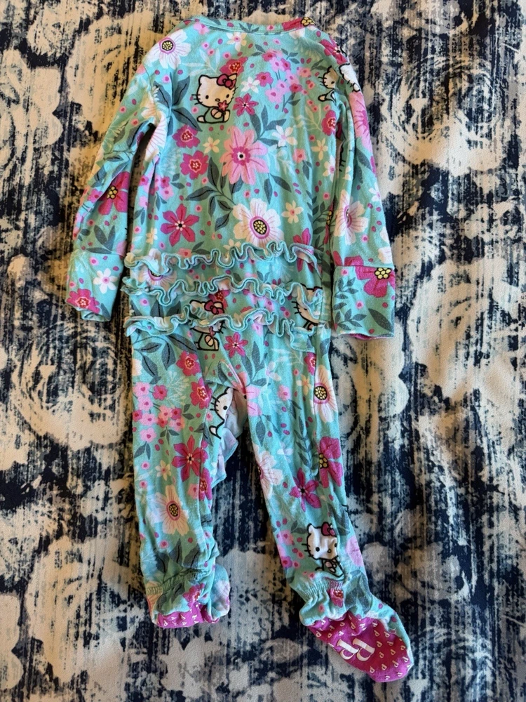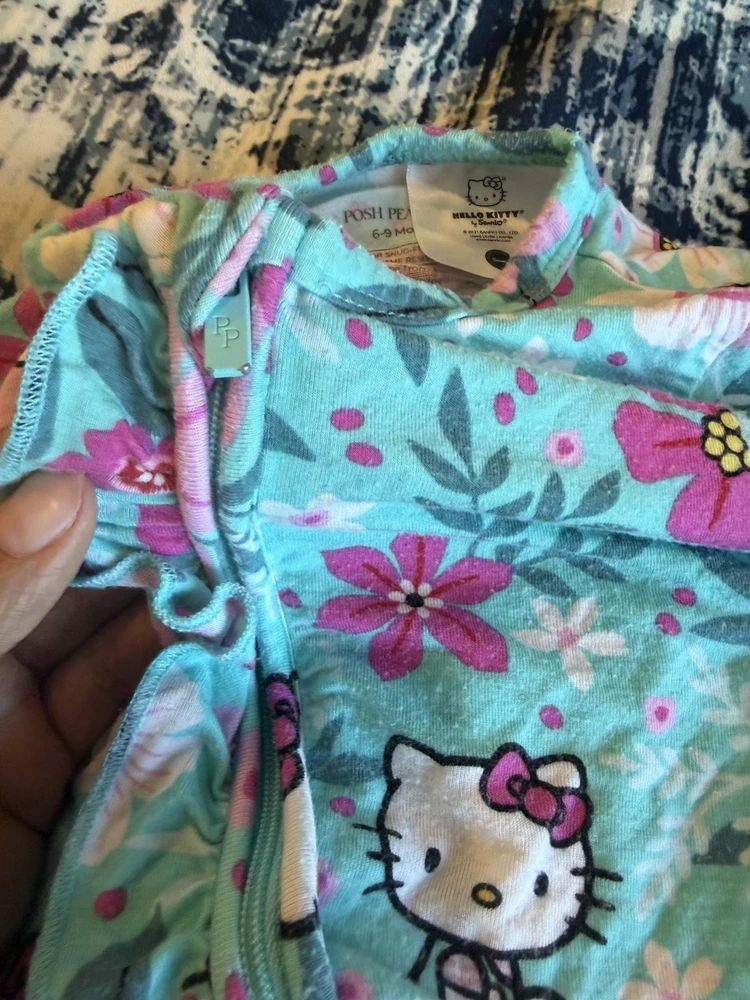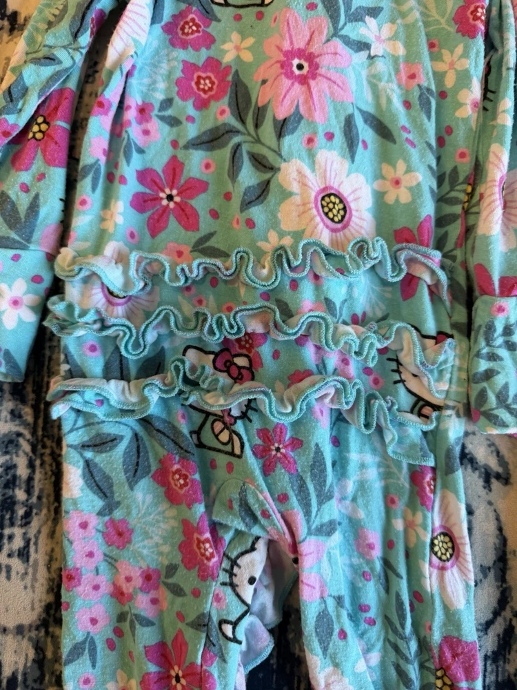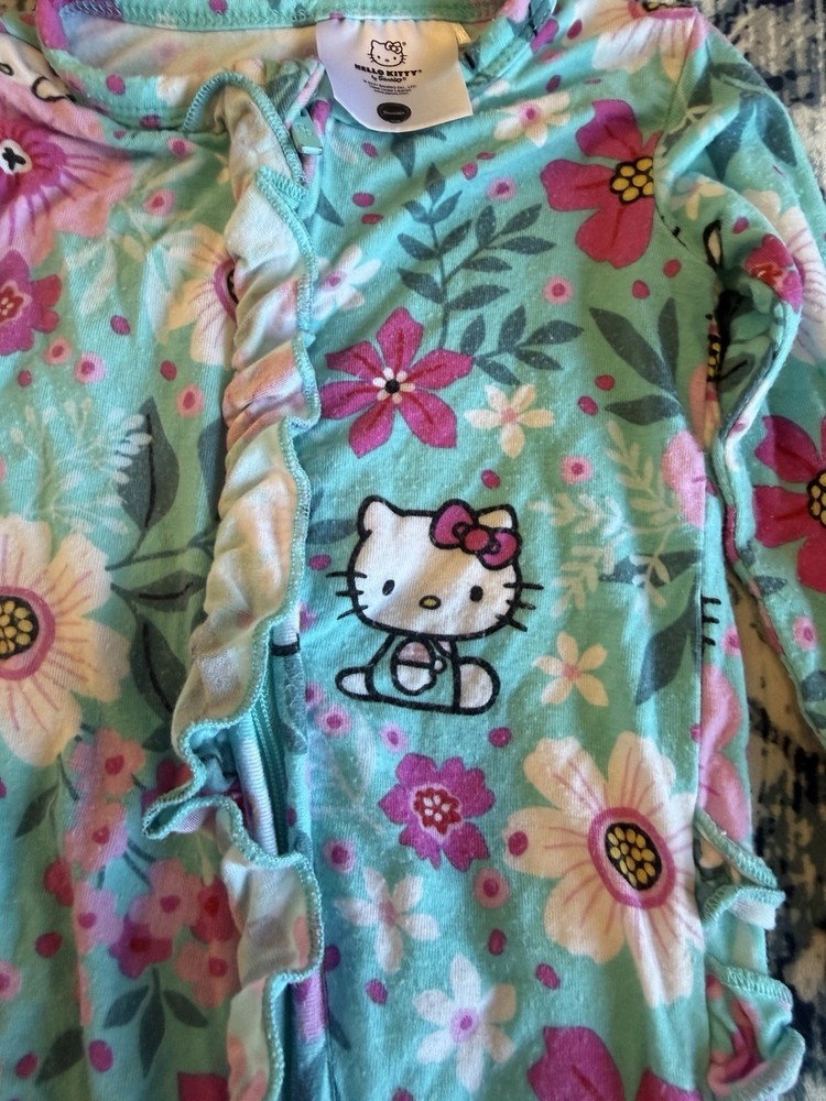 The Posh Peanut X Sanrio Hello Kitty Turquoise Pink Floral Ruffled Bamboo One Piece is a stylish and colorful outfit for babies, featuring a floral pattern with Hello Kitty character design. Made from machine washable bamboo material, this one-piece footie is perfect for casual occasions in all seasons. The ruffled accents add a touch of cuteness, while the long sleeves and zip closure provide comfort and convenience. This versatile outfit is a must-have for any little one who loves Hello Kitty and flowers. •Preloved in Good Condition. Normal signs of wash wear. Normal signs of ware on the zippers. Still in good shape. •Super Cute. •Pet Free/Smoke Free Home •Fast Shipping