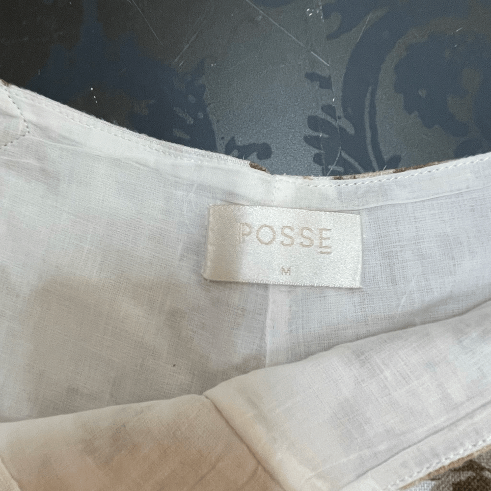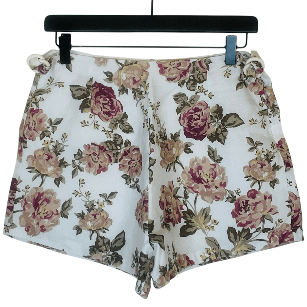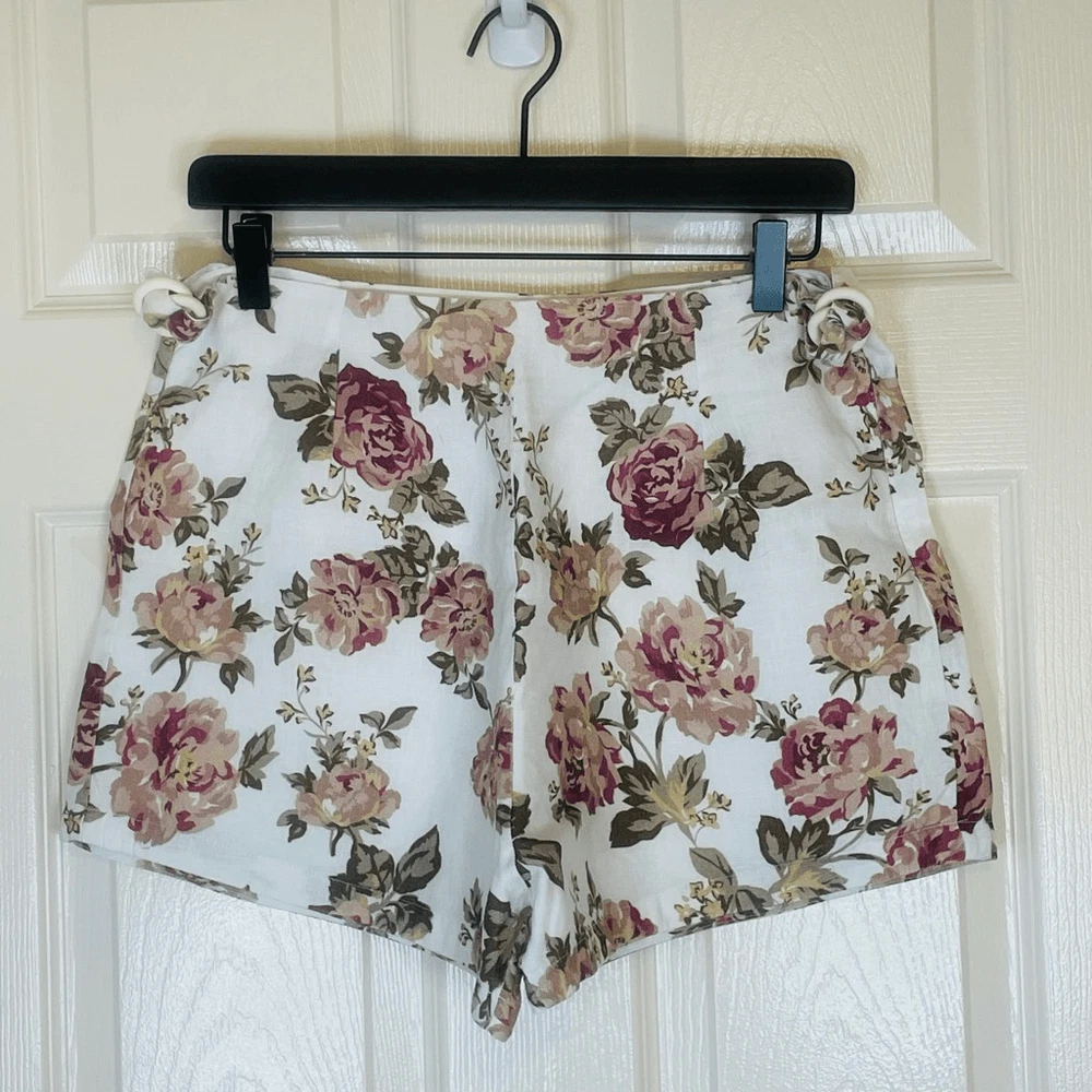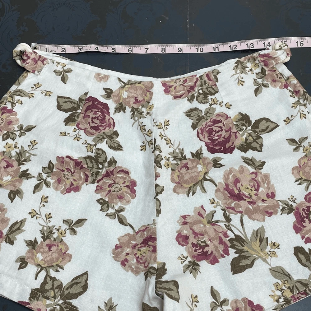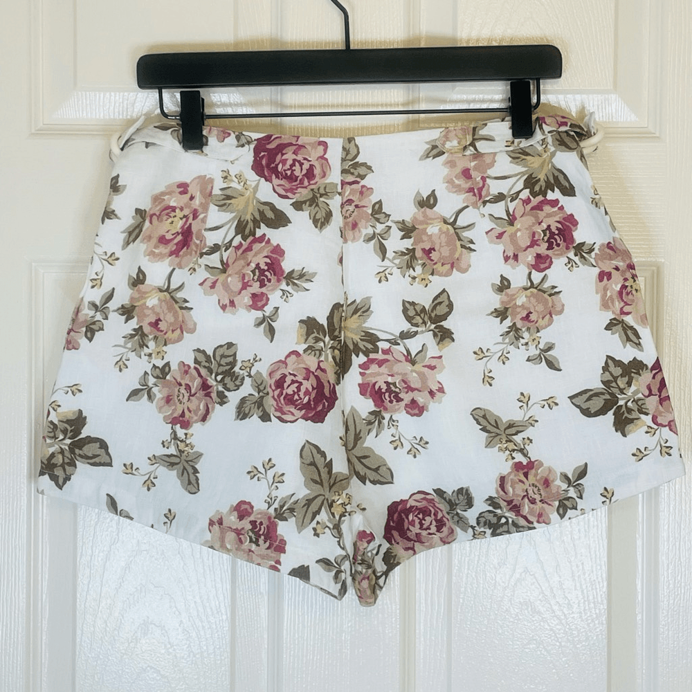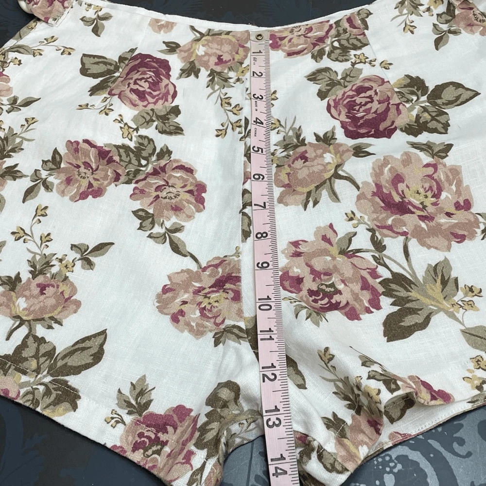 Posse Linen Pink Floral Shorts Size Medium Approximate measurements while lying flat are Waist: 14” Rise: 13” Inseam: 2.5” Material: 100% linen, lining is cotton High waist linen shirts with side buckles. Natural fibers