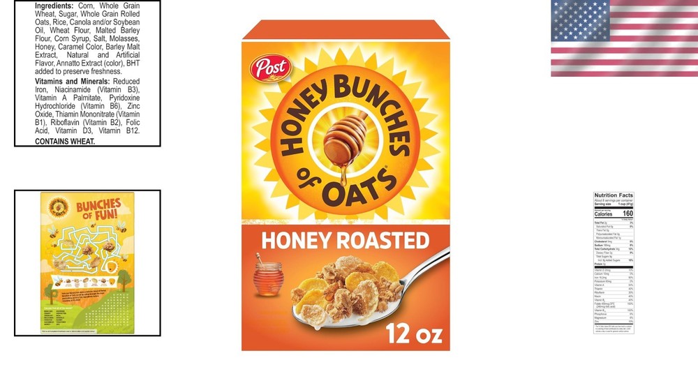 Post Honey Roasted Cereal 12oz - Low Fat, Whole Grain with 10 Vital Nutrients ‹ › ‹ › ‹ › ‹ › ‹ › ‹ › ‹ › ‹ › ‹ › ‹ › ‹ › ‹ › Post Honey Roasted Cereal - 12 oz Start your mornings with a delightful crunch and a touch of sweetness! Our Honey Roasted Breakfast Cereal is the perfect blend of flavor and nutrition, designed to kickstart your day with energy. Key Features: Whole Grain Goodness: Contains 14 grams of whole grains per serving. Nutrient-Rich: Packed with 10 essential vitamins and minerals to elevate your breakfast. Crispy & Crunchy: A delightful mix of crispy corn flakes and crunchy oat granola clusters. Touch of Honey: Enhanced natural sweetness from honey to make your mornings brighter. Versatile Use: Perfect as a standalone cereal, an addition to smoothies, or ingredient in no-bake treat bars and cereal breakfast muffins. Benefits: Provides the essential nutrients needed to fuel your day. Makes breakfast more enjoyable with its unique combination of flavors and textures. Supports a healthy lifestyle with its low-fat formulation. Encourages creative meal ideas—perfect for adding freshness to yogurt or snacks. Why Choose Post ? This cereal is more than just breakfast; it's a cherished morning ritual. With its combination of crispy corn flakes and crunchy oat clusters, it provides that satisfying crunch you crave. The touch of honey not only enhances the flavor but adds an extra layer of enjoyment to your morning routine. Elevate your breakfast experience and nourish your body with the goodness of whole grains. Make your mornings whole bunch better with Post Honey Roasted Cereal! Order your 12 oz box today and discover the difference. Shipping Free & Fast Shipping - We offer free shipping to most of the USA with a normal delivery time of 3-7 days. However, due to the current situation, additional delivery time (up to 3 weeks) may be required for some items. Alternative Carriers - We may use alternative carriers (e.g. USPS, FedEx, UPS, etc.) to ensure your package arrives safely and on time. Due to the use of multiple carriers, we are unable to provide a tracking number automatically. Handling Time - Orders are processed and shipped within 1-2 business days of receiving cleared payment. Shipping Restrictions - Shipping to Alaska, Hawaii, Puerto Rico, Guam, and other US territories may incur shipping charges or delivery restrictions. Please contact us before ordering, or your order can be refunded/cancelled. State Restrictions - There may be restrictions based on your state of purchase. For example, certain items may not be shipped to California due to state regulations. Contact for Tracking Updates - If you require tracking updates or have any concerns about the delivery of your order, please feel free to contact us, and we will be happy to assist you. Return 30-Day Hassle-Free Returns - We want you to be completely satisfied with your purchase. If you are not, you can return the item within 30 days of receiving it for a full refund or exchange. Easy Return Process - To start a return, simply contact us and we will provide you with a prepaid return shipping label and detailed instructions. Restocking Fee - There are no restocking fees for returns. However, the buyer is responsible for return shipping costs if the return is not due to a seller's error. Refund Processing Time - Refunds will be processed within 5 business days of receiving the returned item in its condition. Payment We accept all major credit cards, PayPal, and Apple Pay for your convenience. Your payment information is secure and encrypted to ensure a safe and seamless transaction. Please complete your payment within 3 days of purchase to avoid any delays in shipping. Feedback Your feedback is extremely important to us. We strive to provide the best products and customer service possible. If you are satisfied with your purchase, please take a moment to leave us a positive review. If you have any concerns or issues with your order, please contact us before leaving negative feedback. We are committed to resolving any problems and ensuring your satisfaction. Contact Us If you have any questions or concerns, please feel free to out to our customer support team. You can contact us through the eBay messaging system. We are available Monday to Friday, 9:00 am to 5:00 pm EST, and we will do our best to respond to your inquiry within 24 hours. Buy it now and enjoy a pleasant shopping experience! Expiration Date: Honey Bunches of Oats Calories per 100 g/mL: 405 Course: Breakfast Number in Pack: 1 Style: Honey Roasted Unit Quantity: 12 Ounce Food Specifications: Low Fat,Heart Healthy,Whole Grain Allergens: Corn Flavor: Honey Product: Breakfast Cereal, Muesli & Oat Product Name: Honey Bunches of Oats Type: Oats Calories per Serving: 120 Number of Servings: 3 Serving Size: 1 Cup Item Weight: 12 Ounce