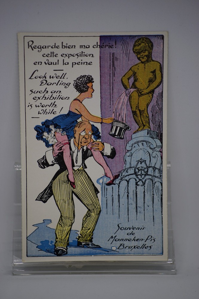 Postcard Belgium Comic Art Manneken-Pis Brussels Drunk Party Girl Pissing Statue " Regarde bien ma chérie! cette exposition en vaul la peine. Look well. Darling Such an exhibition is worth while! " One of a series of comic postcards on the subject of the Manneken-Pis statue in Brussels, early 20th century. Souvenir de Manneken-Pis Bruxelles Series No 17 Unposted. Good vintage condition. No visible damage to any of the edges. All corners slightly bent. Dirt spots, discoloration, creasing, scratches, missing paint and stains marks may be visible on single or both sides of the postcard. Good condition for its age. Please look at the photos for condition details. Additional details : This postcard is quite far from what we know as English humour, marked by fine irony. What do we mean by saucy seaside postcards? The name was coined for cards featuring risqué images and innuendo. These often include images of figures scantily clad and in precarious positions. Many of these designs would not be deemed appropriate today and even at the time, as we will discover, people questioned their impact on the morality of their audience. Pedro, Fitzpatrick, Chas, Quip, L.B. Martin, Ajw, Trow, Donald McGill were all an English graphic artists for seaside, risqué, comic satire, humour whose names has become synonymous with the genre of saucy postcards, particularly associated with the seaside (though they were sold throughout the UK). This cards mostly featured an array of attractive young women, fat old ladies, drunken middle-aged men, honeymoon couples and vicars. Many artists behind the designs were influenced by the one who has been called 'the king of the saucy postcard', Donald Fraser Gould McGill (28 January 1875 - 13 October 1962) 'Saucy Postcards' are often collected and appreciated for artistic skill, its power of social observation and earthy sense of humour. Even at the height of fame top artists only earned three guineas a design, but by the 2000s original artwork could fetch thousands of pounds. Keywords: Artist drawn illustration ; Edwardian ; Victorian ; Antique ; Early colour ; Double entendre ; Humorous ; Amusing ; Entertaining ; Innuendo ; Toilet humour ; Dirty jokes ; Rude joke ; Cheeky ; Funny situations ; Novelty ; Big boobs ; Buxom ; Plump ; Thicc ; Busty ; R andy ; Bawdy ; Foreplay ; Courting ; Pretty girl ; Sexy lady ; Sex ; Nude ; Nudes ; Nudist club ; Naturist club ; Naked women ; Naked man ; Naked couple ; Topless ; Nylons ; Stockings ; Love ; Romance ; Wedding ; Marriage ; Wife ; Husband ; Hubby ; Breezybums ; Koolbums ; Fabric ; Cloth ; Rag ; Towel Roller ; Blind garden fence ; Neighbour ; On bed ; On spoon ; Erectile dysfunction ; Bikini ; Holiday ; Beach ; Bathing beauty ; Mouse trap ; Hole ; Plumber ; Engineer ; Deckchair ; Pub Inn ; Boomers ; Bronze statue ; Fountain ; Foldout ; Brussels ; Le Petit Homme ; Qui Pisse ; Burxelles Menneke Pis ; Urinal ; Urinating ; Peeing ; Pissing ; Little boy ; Baby ; Penis ; Symbol ; City ; Umbrella ; Car ; Ladder ; Tourists