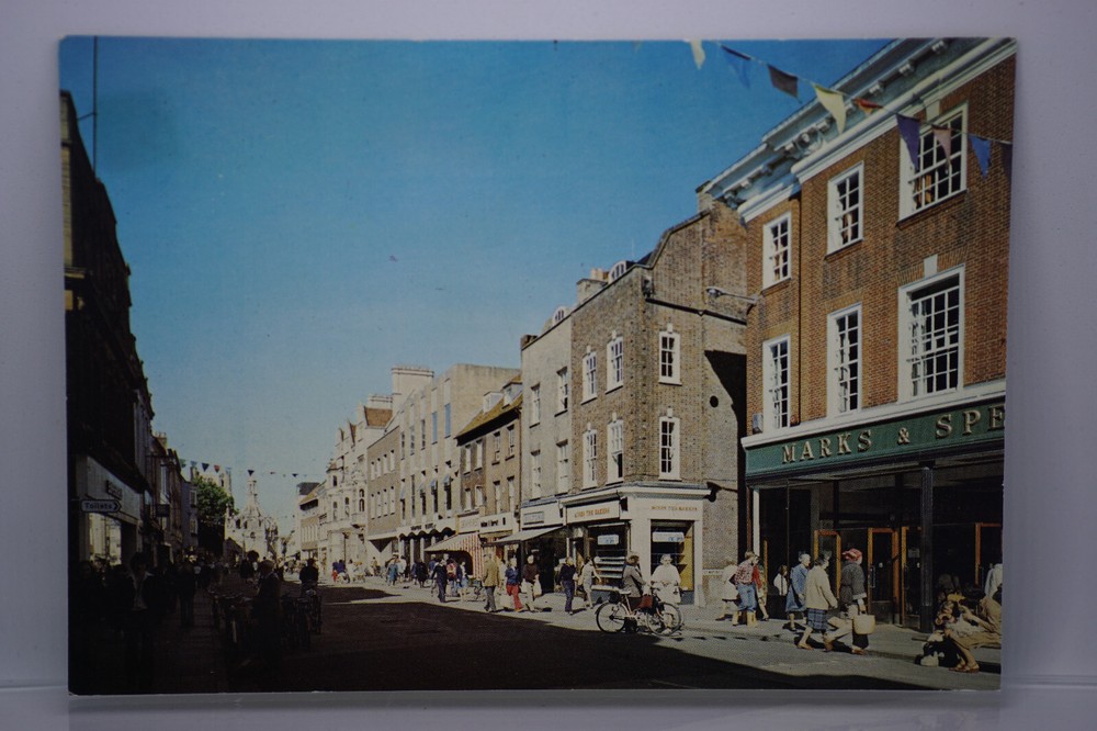 Postcard Chichester West Sussex Busy Pederastian People Shopping High Street Unposted. Good vintage condition. At the back 4 pieces of glue-tape reminiscent of card being stuck to the wall / board/ fridge / desk unit / etc - on top of that one of the square shaped glue-tape bits did make a stain in front of the postcard due to long exposure to some kind of direct light / sunlight. No visible damage to any of the edges. All corners slightly bent. Dirt spots, discoloration, creasing, scratches, missing paint and stains marks may be visible on single or both sides of the postcard. Good condition for its age. Please look at the photos for condition details. Additional details : Chichester is a cathedral city and civil parish in West Sussex, England. It is the only city in West Sussex and is its county town. It was a Roman and Anglo-Saxon settlement and a major market town from those times through Norman and medieval times to the present day.