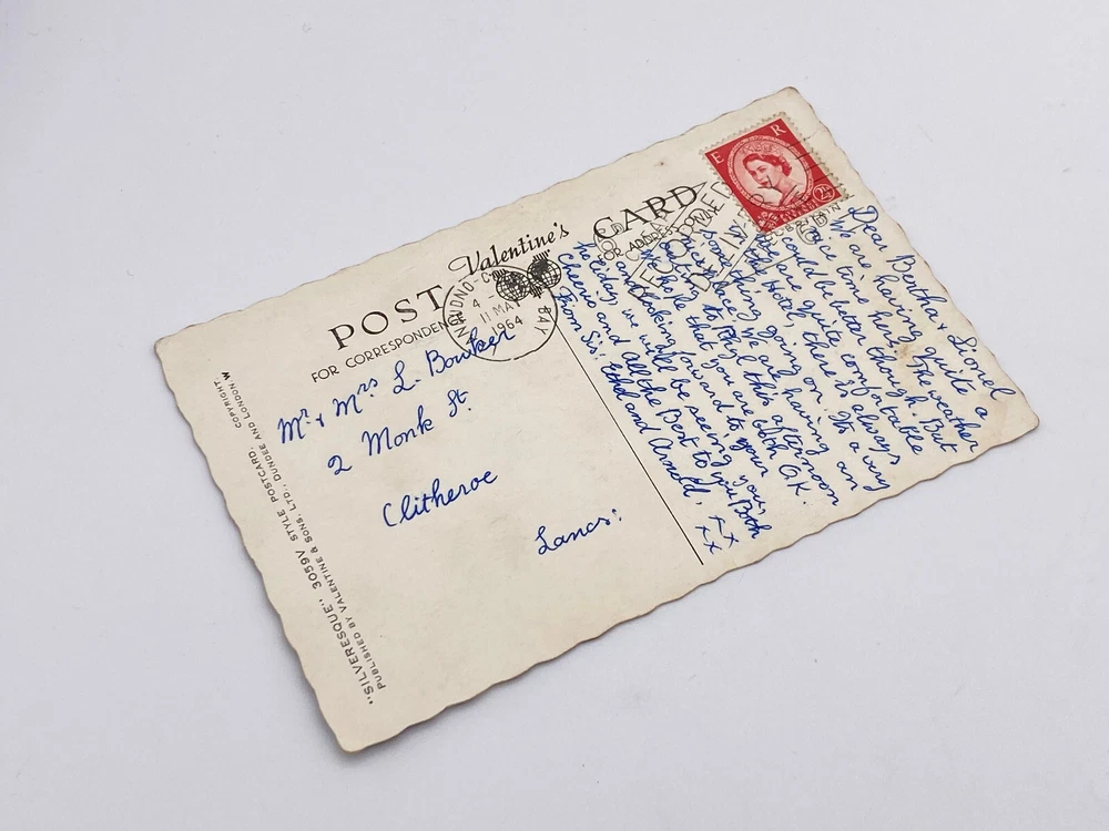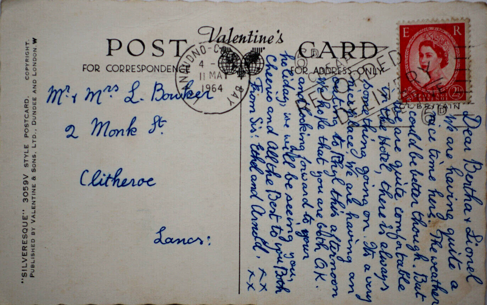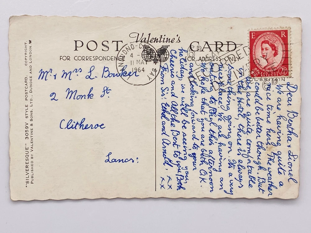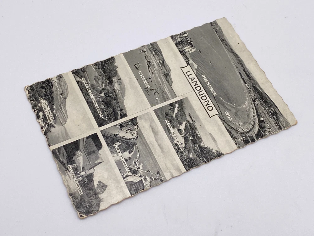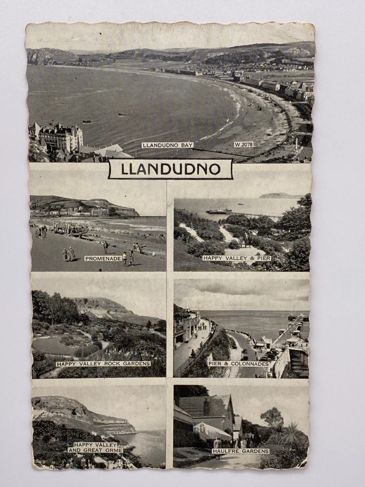 Postcard Collage Wales Gwynedd Llandudno Bay North Shore Beach Pier Great Orme Llandudno is a coastal town in north Wales. It’s known for North Shore Beach and 19th-century Llandudno Pier, with shops and a games arcade. Northwest of town, the cliffs of Great Orme headland jut into the sea. Ancient tunnels lead to a cavern at Great Orme Mines. A 1902 tramway has an upper and lower section, and travels to the headland’s summit. o the east, smaller headland Little Orme is a nature reserve LLANDUDNO BAY W.2078 LLANDUDNO PROMENADE HAPPY VALLEY & PIER HAPPY VALLEY ROCK GARDENS PIER & COLONNADES HAPPY VALLEY AND GREAT ORME HAULFRE GARDENS E R Valentine's POSTNO-C FOR CORRESPONDENCE 4 11 MA 1964 Mr & Mrs L. Bowker 2 Monk St Clitheroe Lancs: BAY CARD ROMED Z AGT VENUE 21 STAIN Dear Bertha & Lionel We are having having quite on. Its a a ice time here. The weather could be better though. But are quite comfortable in the Hotel, there is always & some thing going nierfilace. We are having gouting to Rhyl this afternoon We hope that you are both GK. ICE and looking forward to your holiday, & & very an we will be seeing you, Cheerio and All the Best to you Both From Sis: Ethel and Arnold, FX xx M'NOGNO ONE BE A 'SNOS 8 BE A CHI A .. Posted. Good vintage condition. No visible damage to the edges. Top right corners have haevy neding and paint ripples, other corner smaller but significant visually bending. Discoloration, dirt spots and stains marks on both sides of the postcard. Good condition for it's age . Please look at the photos for condition details.