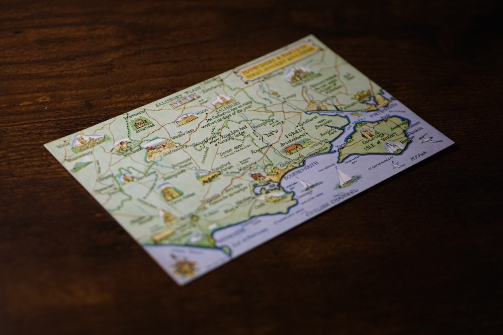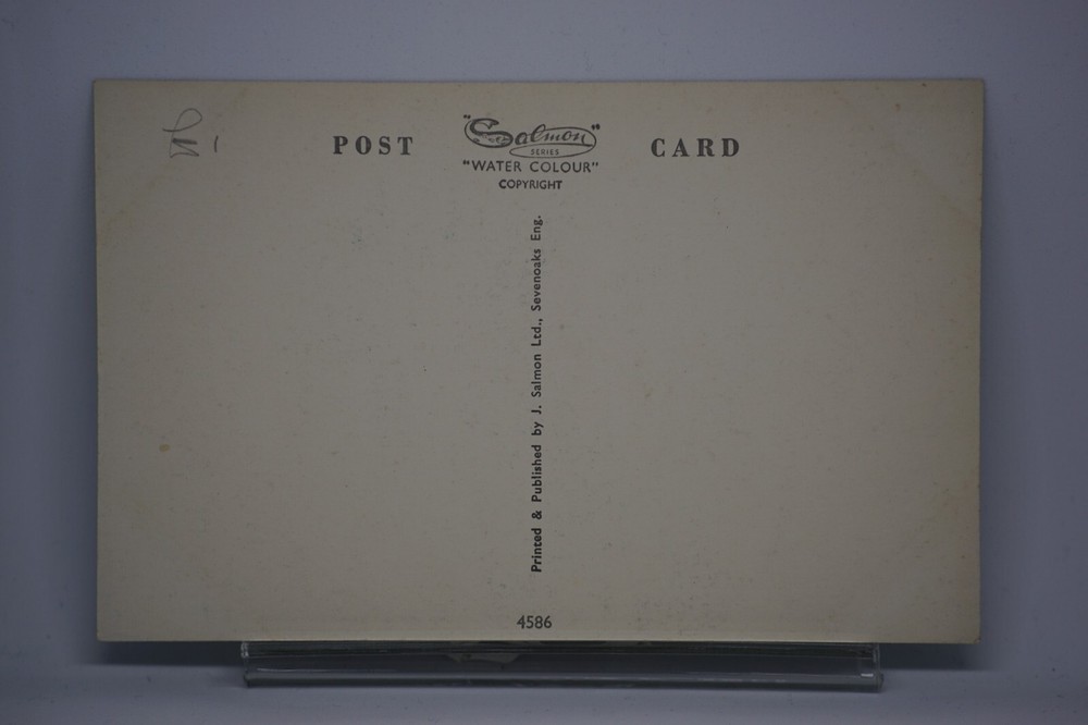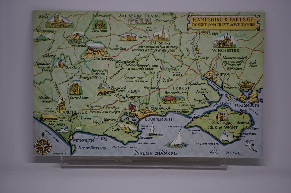 Postcard Comic Map Hampshire Dorset Somerset Wiltshire England M. F. Peck Salmon © J Salmon Limited Water Colour Series No. 4586 Unposted. Good vintage condition. Bending and creasing in multiple places across postcard. No visible damage to any of the edges. All corners slightly bent. Dirt spots, discoloration, creasing, scratches, missing paint and stains marks may be visible on single or both sides of the postcard. Good condition for its age. Please look at the photos for condition details. Keywords: Bridge Bridges Tourist River Rivers Scenic Main Street Aerial Bird's Eye Birds Eye Multi View Banner