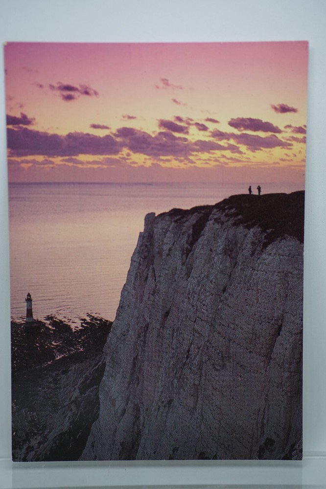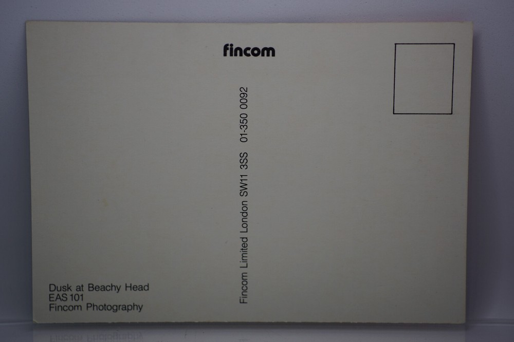 Postcard Dusk at Beachy Head Chalk Headland Striped Cliffs Lighthouse Eastbourne Fincom Limited London SW11 3SS 01-350 0092 Dusk at Beachy Head EAS 101 Fincom Photography Unposted. Good vintage condition. No visible damage to any of the edges. All corners slightly bent. Dirt spots, discoloration, creasing, scratches, missing paint and stains marks may be visible on single or both sides of the postcard. Good condition for its age. Please look at the photos for condition details. Keywords: Shore