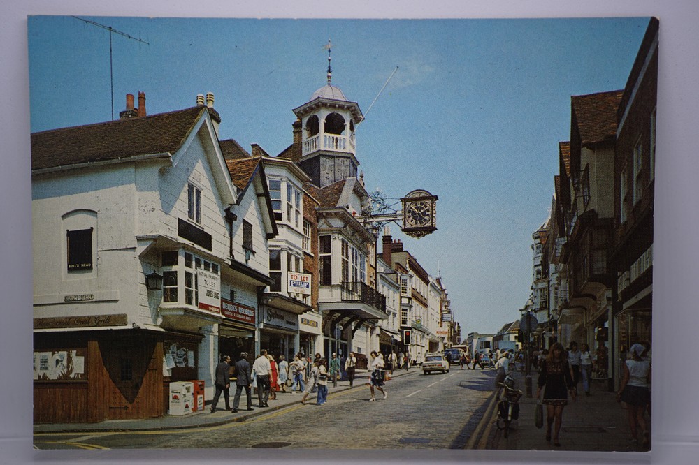 Postcard High Street Guildford Surrey Busy People Shopping Pederastian Walking Unposted. Good vintage condition. No visible damage to any of the edges. All corners slightly bent. Dirt spots, discoloration, creasing, scratches, missing paint and stains marks may be visible on single or both sides of the postcard. Good condition for its age. Please look at the photos for condition details. Additional details : Guildford is a town in southern England. In the centre is the medieval Guildford Castle, with landscaped gardens and views from its square tower. Guildford House, a 17th-century town home, has a gallery with rotating exhibitions. Southwest, Loseley Park features a 16th-century manor house with a walled garden. Nearby is Watts Gallery - Artists’ Village, showing Victorian paintings and sculptures.