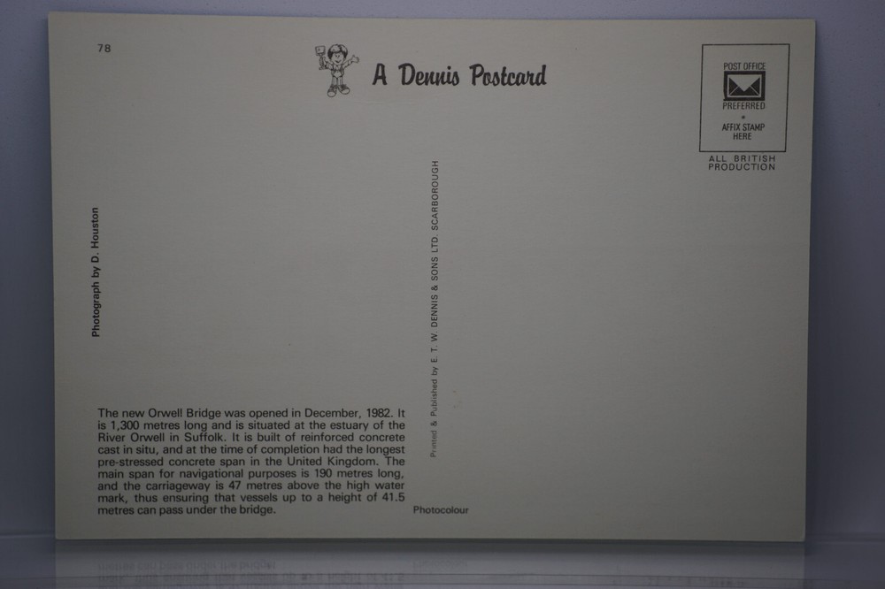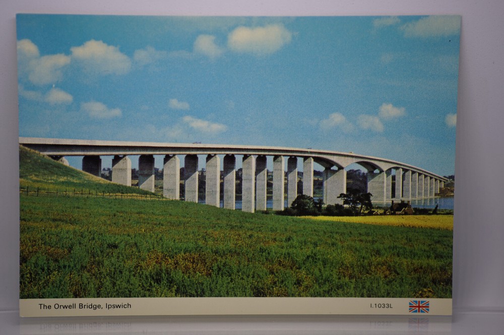 Postcard Orwell Bridge Estuary Carriageway Ipswich Suffolk Coast Anglia England The new Orwell Bridge was opened in December, 1982. It is 1,300 metres long and is situated at the estuary of the River Orwell in Suffolk. It is built of reinforced concrete cast in situ, and at the time of completion had the longest pre-stressed concrete span in the United Kingdom. The main span for navigational purposes is 190 metres long. and the carriageway is 47 metres above the high water mark, thus ensuring that vessels up to a height of 41.5 metres can pass under the bridge. Photograph by D. Houston Printed & Published By E.T.W. Dennis & Sons Ltd. Scarborough Unposted. Good vintage condition. No visible damage to any of the edges. All corners slightly bent. Dirt spots, discoloration, creasing, scratches, missing paint and stains marks may be visible on single or both sides of the postcard. Good condition for its age. Please look at the photos for condition details. Additional details : Ipswich is a town in Suffolk, a county in eastern England. Set on the River Orwell, its waterfront is lined with cafes, galleries and shops, and the 19th-century Old Custom House, which recalls the city’s maritime history. Next to Christchurch Park, the 500-year-old Christchurch Mansion has a Tudor kitchen and the Wolsey Art Gallery. Ipswich Museum and Gallery, in a Victorian building, has natural history exhibits. Suffolk is a ceremonial county in the East of England and East Anglia. It is bordered by Norfolk to the north, the North Sea to the east, Essex to the south, and Cambridgeshire to the west. Ipswich is the largest settlement and the county town. The county has an area of 3,798 km² and a population of 758,556.
