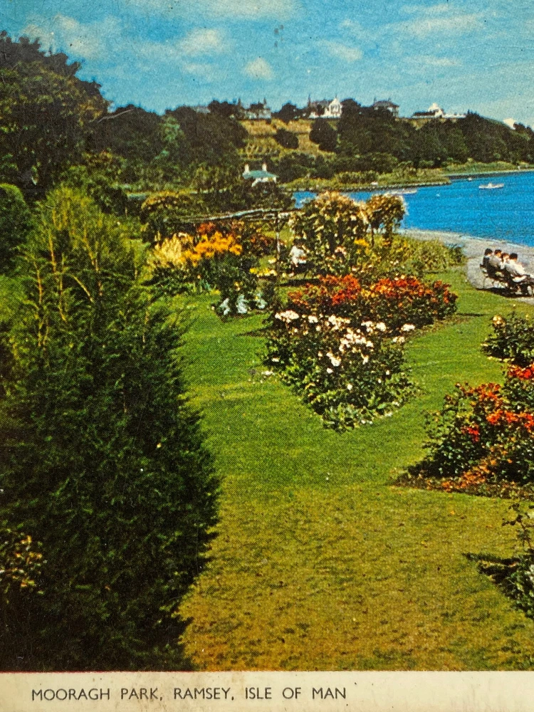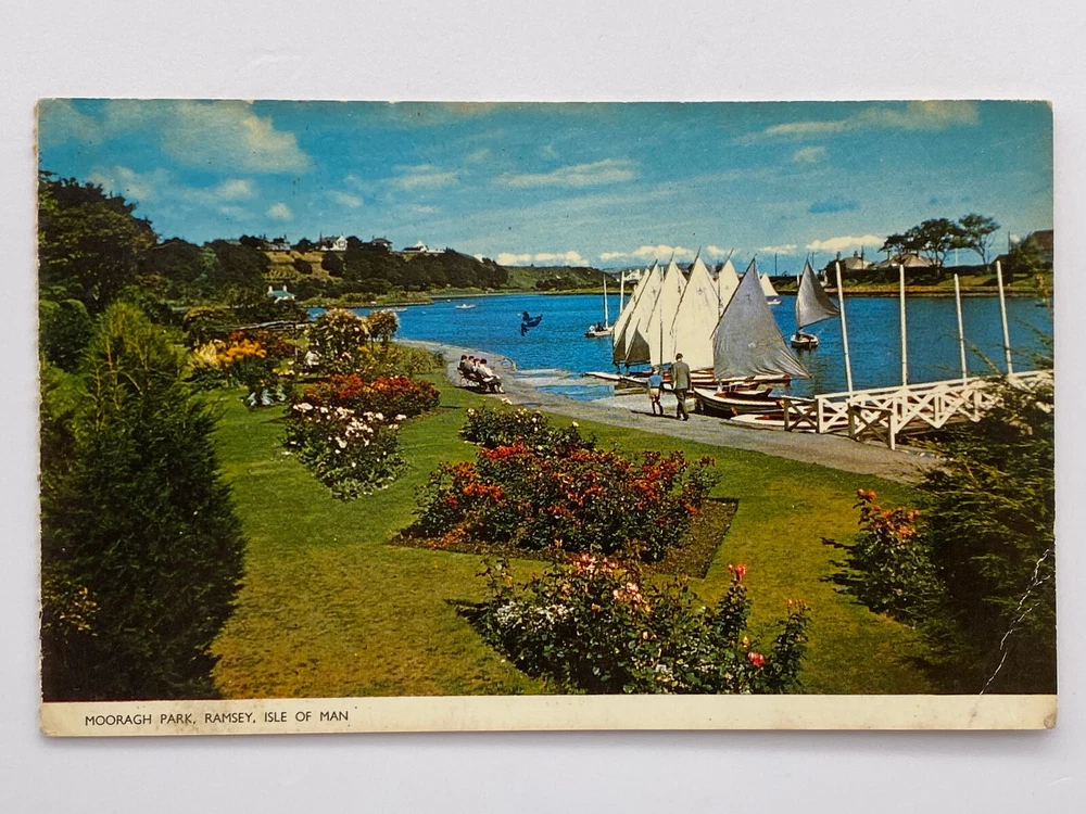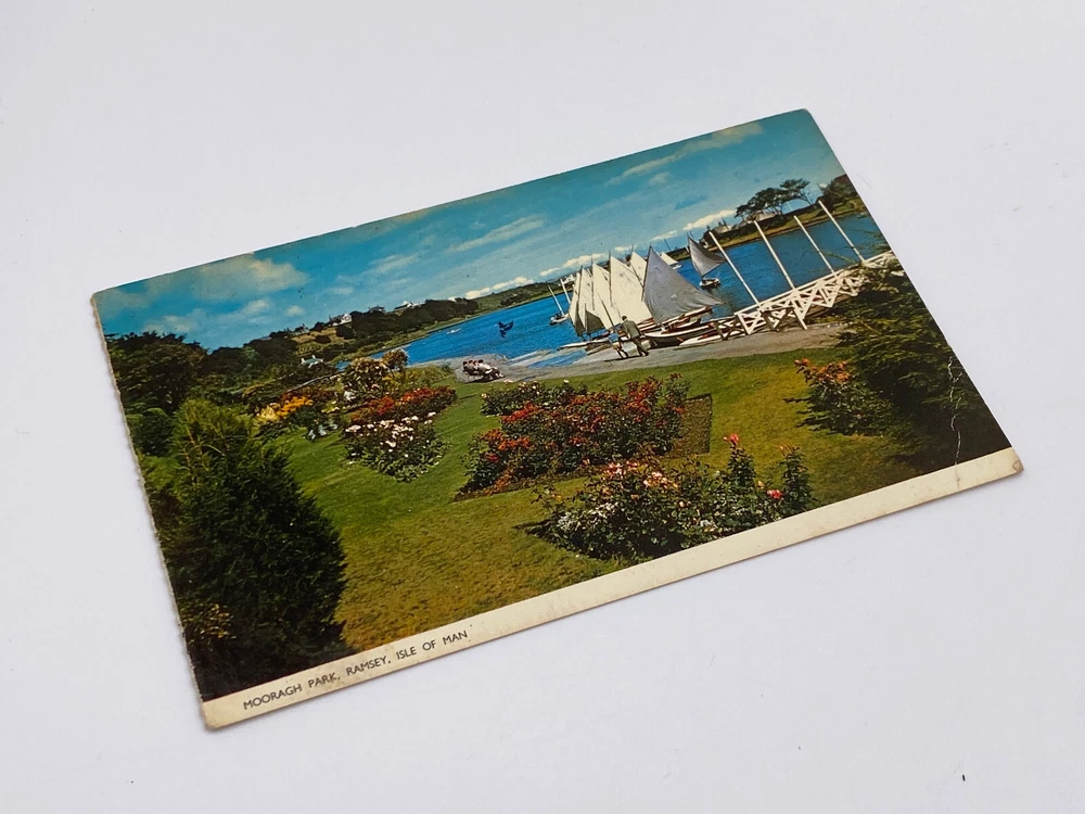 Postcard Ramsey Mooragh Park Isle of Man Garden Sailboats Summer Holiday RPPC Posted. Good vintage condition. No visible damage to any of the edges. All corners slightly bent. Dirt spots, discoloration, scratches, missing paint and stains marks may be visible on single or both sides of the postcard. Pen writing on the back of the postcard. Good condition for its age . Please look at the photos for condition details.