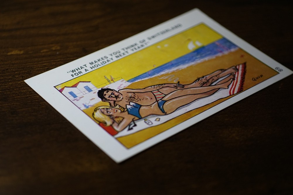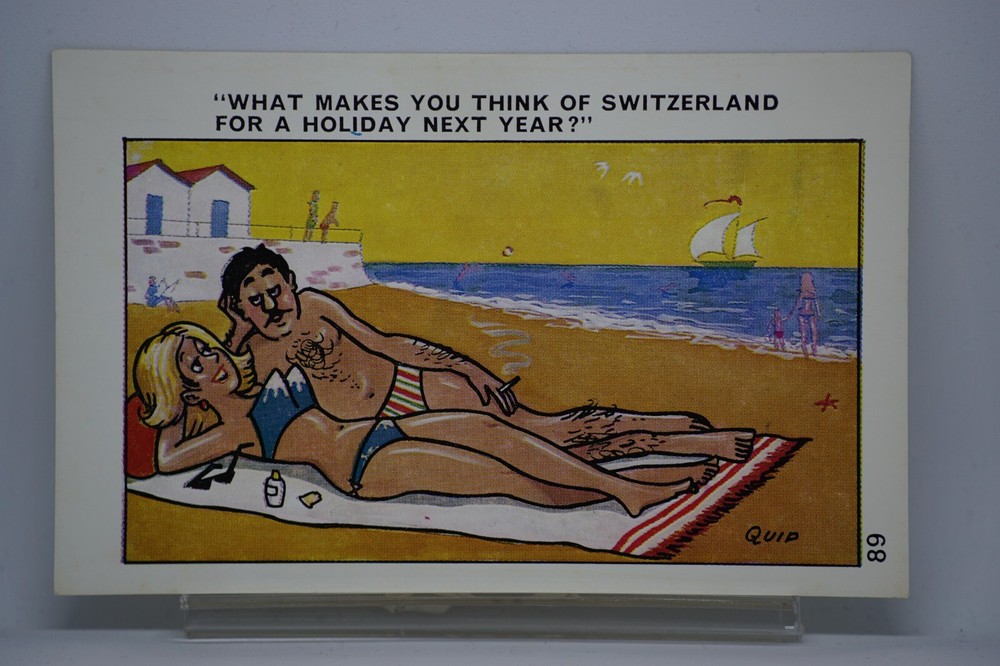 Postcard Seaside Comic Saucy Risqué Beach Bikini Bathing Boxes Quip Sapphire 89 "What Makes You Think Of Switzerland For A Holiday Next Year?" Sapphire Publications Ltd. Quip Series No. 89 Unposted. Good vintage condition. No visible damage to any of the edges. All corners slightly bent. Dirt spots, discoloration, creasing, scratches, missing paint and stains marks may be visible on single or both sides of the postcard. Good condition for its age. Please look at the photos for condition details. Additional details : Postcard is also quite far from what we know as English humour, marked by fine irony. The card was published in 1973, is signed by Pedro, belongs to the Sunny Pedro Series. What do we mean by saucy seaside postcards? The name was coined for cards featuring risqué images and innuendo. These often include images of figures scantily clad and in precarious positions. Many of these designs would not be deemed appropriate today and even at the time, as we will discover, people questioned their impact on the morality of their audience. Pedro, Fitzpatrick, Chas, Quip, L.B. Martin, Ajw, Trow, Donald McGill were all an English graphic artists for seaside, risqué, comic satire, humour whose names has become synonymous with the genre of saucy postcards, particularly associated with the seaside (though they were sold throughout the UK). This cards mostly featured an array of attractive young women, fat old ladies, drunken middle-aged men, honeymoon couples and vicars. Many artists behind the designs were influenced by the one who has been called 'the king of the saucy postcard', Donald Fraser Gould McGill (28 January 1875 ? 13 October 1962) 'Saucy Postcards' are often collected and appreciated for artistic skill, its power of social observation and earthy sense of humour. Even at the height of fame top artists only earned three guineas a design, but by the 2000s original artwork could fetch thousands of pounds. Keywords: Artist drawn illustration ; Early colour ; Double entendre ; Innuendo ; Toilet humour ; Dirty jokes ; Rude joke ; Cheeky ; Funny situations ; Novelty ; Big boobs ; Buxom ; Plump ; Thicc ; Busty ; R andy ; Bawdy ; Foreplay ; Courting ; Pretty girl ; Sexy lady ; Sex ; Nude ; Nudes ; Nudist club ; Naturist club ; Naked women ; Naked man ; Naked couple ; Topless ; Nylons ; Stockings ; Wedding ; Marriage ; Wife ; Husband ; Hubby ; Breezybums ; Koolbums ; Fabric ; Cloth ; Rag ; Towel Roller ; Blind garden fence ; Neighbour ; On bed ; On spoon ; Erectile dysfunction ; Bikini ; Holiday ; Beach ; Bathing beauty ; Mouse trap ; Hole ; Plumber ; Engineer ; Deckchair ; Pub Inn ; Boomers