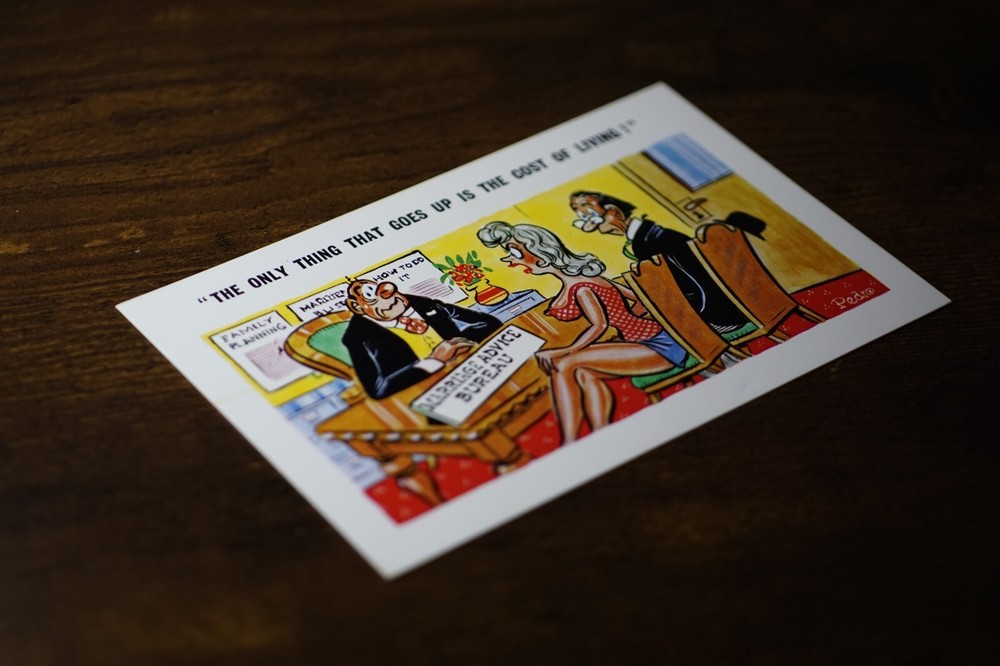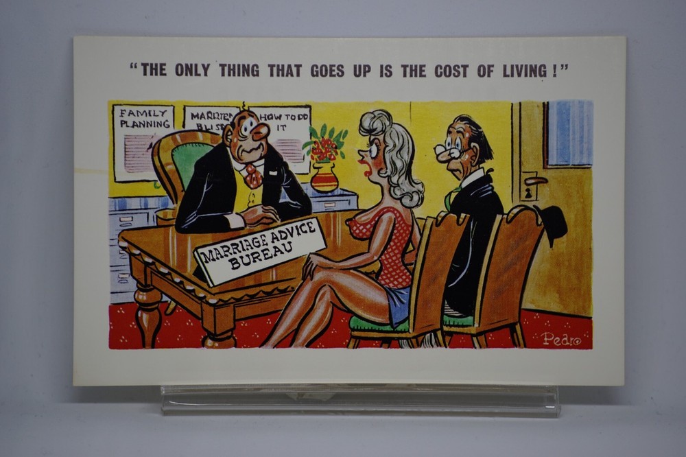 Postcard Seaside Comic Saucy Risqué Family Cost of Living Sunny Pedro Series 178 "The Only Thing That Goes Up Is The Cost Of Living!" Sunny Pedro Series No 178 Unposted. Good vintage condition. No visible damage to any of the edges. All corners slightly bent. Dirt spots, discoloration, creasing, scratches, missing paint and stains marks may be visible on single or both sides of the postcard. Good condition for its age. Please look at the photos for condition details. Additional details : Postcard is also quite far from what we know as English humour, marked by fine irony. The card was published in 1973, is signed by Pedro, belongs to the Sunny Pedro Series. What do we mean by saucy seaside postcards? The name was coined for cards featuring risqué images and innuendo. These often include images of figures scantily clad and in precarious positions. Many of these designs would not be deemed appropriate today and even at the time, as we will discover, people questioned their impact on the morality of their audience. Pedro, Fitzpatrick, Donald McGill were English seaside, risqué, comic satire, humour graphic artists whose names has become synonymous with the genre of saucy postcards, particularly associated with the seaside (though they were sold throughout the UK). This cards mostly featured an array of attractive young women, fat old ladies, drunken middle-aged men, honeymoon couples and vicars. Many artists behind the designs were influenced by the one who has been called 'the king of the saucy postcard', Donald Fraser Gould McGill (28 January 1875 – 13 October 1962) 'Saucy Postcards' are often collected and appreciated for artistic skill, its power of social observation and earthy sense of humour. Even at the height of fame top artists only earned three guineas a design, but by the 2000s original artwork could fetch thousands of pounds. Keywords: Artist Drawn Illustration Humour Funny Situations Novelty Big Boobs Sexy Nudist Club Naturist Club Wedding Marriage Naked Women Naked Man Breezybums Koolbums Family Planning How To Dd It Marriage Advice Bureau