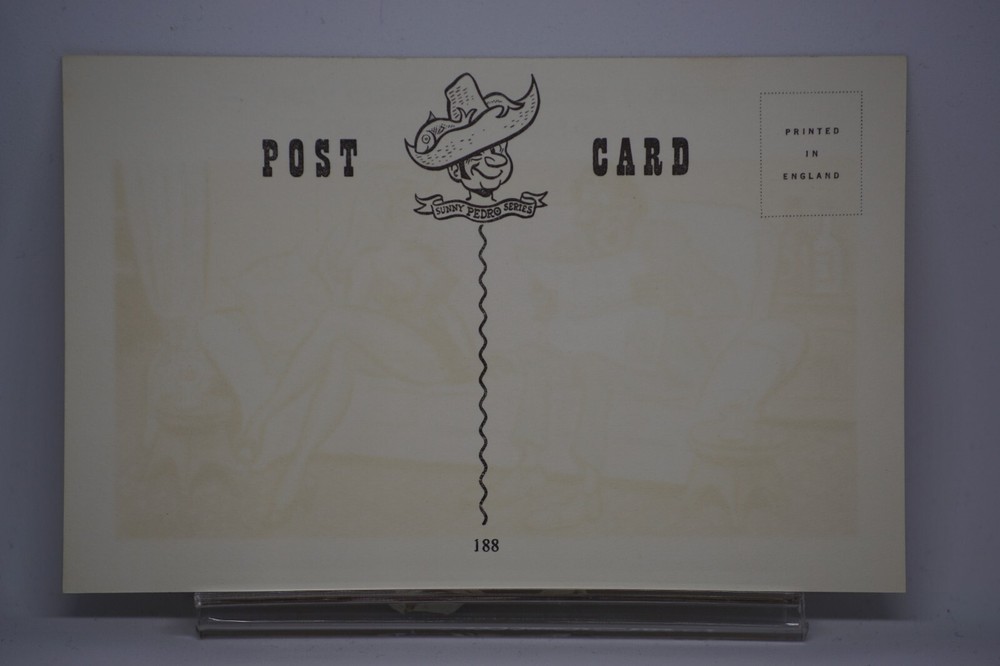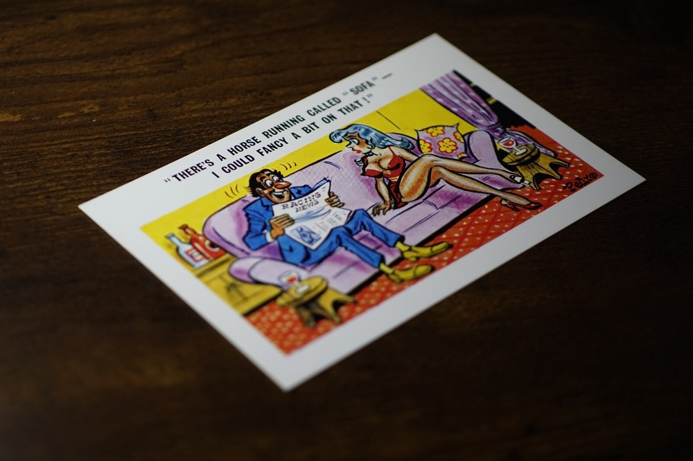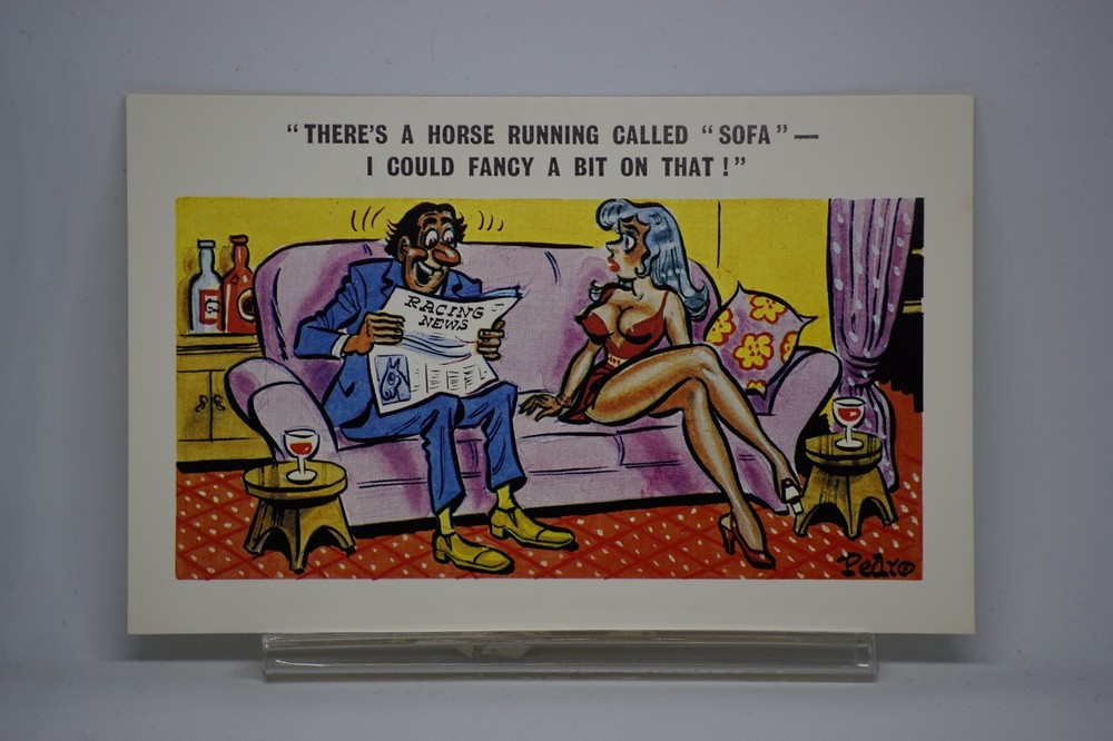 Postcard Seaside Comic Saucy Risqué Horse Racing News Sunny Pedro Series No 188 "There’s a horse running called Sofa I could fancy a bit on that!" Sunny Pedro Series No 188 Unposted. Good vintage condition. No visible damage to any of the edges. All corners slightly bent. Dirt spots, discoloration, creasing, scratches, missing paint and stains marks may be visible on single or both sides of the postcard. Good condition for its age. Please look at the photos for condition details. Additional details : Postcard is also quite far from what we know as English humour, marked by fine irony. The card was published in 1973, is signed by Pedro, belongs to the Sunny Pedro Series. What do we mean by saucy seaside postcards? The name was coined for cards featuring risqué images and innuendo. These often include images of figures scantily clad and in precarious positions. Many of these designs would not be deemed appropriate today and even at the time, as we will discover, people questioned their impact on the morality of their audience. Pedro, Fitzpatrick, Donald McGill were English seaside, risqué, comic satire, humour graphic artists whose names has become synonymous with the genre of saucy postcards, particularly associated with the seaside (though they were sold throughout the UK). This cards mostly featured an array of attractive young women, fat old ladies, drunken middle-aged men, honeymoon couples and vicars. Many artists behind the designs were influenced by the one who has been called 'the king of the saucy postcard', Donald Fraser Gould McGill (28 January 1875 – 13 October 1962) 'Saucy Postcards' are often collected and appreciated for artistic skill, its power of social observation and earthy sense of humour. Even at the height of fame top artists only earned three guineas a design, but by the 2000s original artwork could fetch thousands of pounds. Keywords: Artist Drawn Illustration Humour Novelty Big Boobs Nudist Club Naturist Club Wedding Marriage Naked Women Naked Man Breezybums Koolbums Glass of Wine