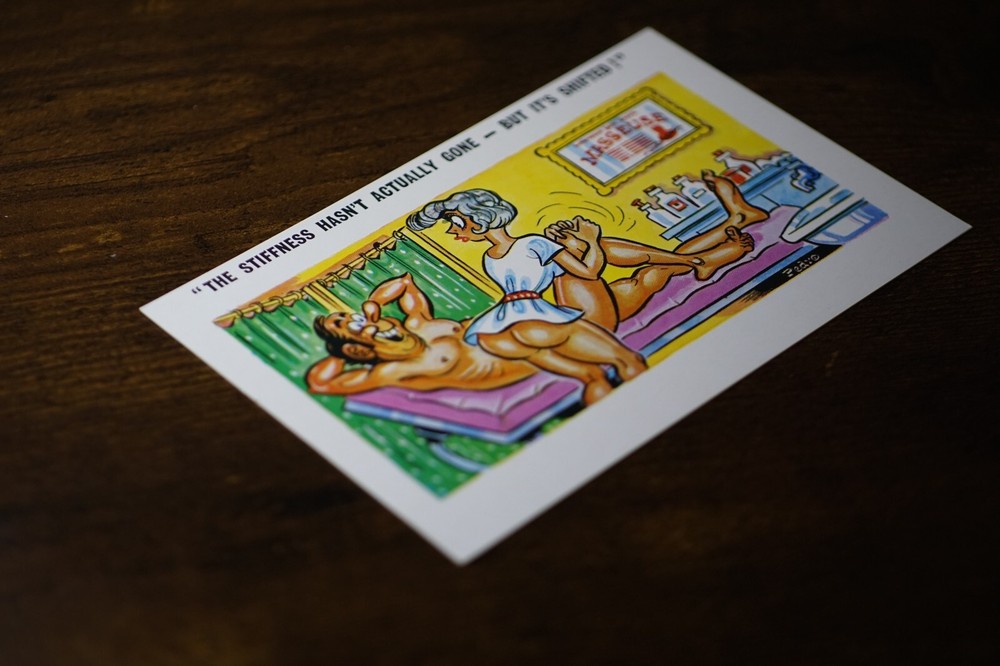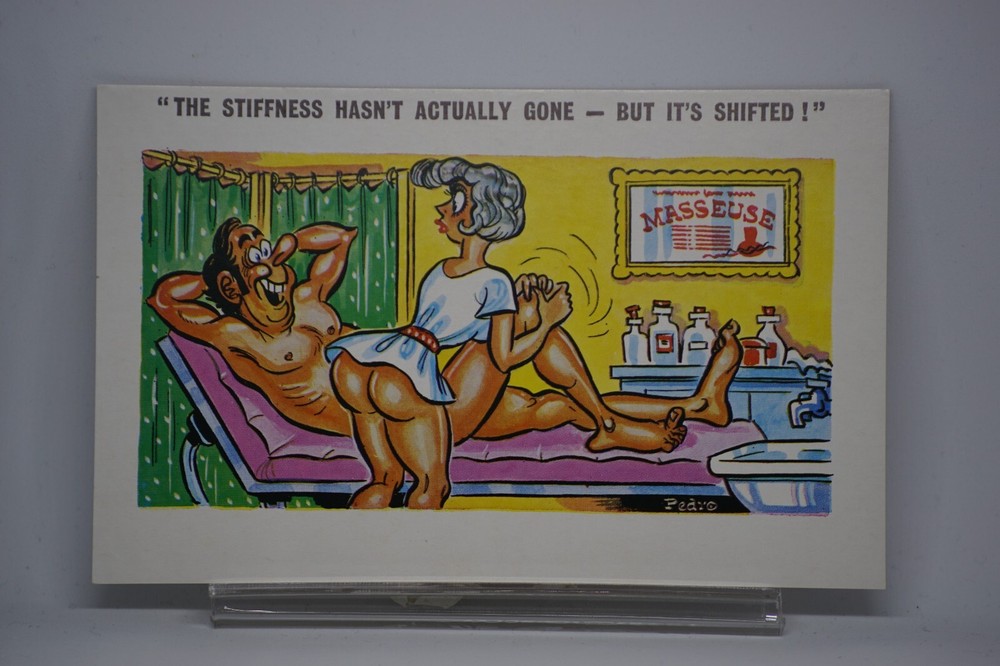 Postcard Seaside Comic Saucy Risqué Masseuse Shifted Stiffness Sunny Pedro 177 "The Stiffness Hasn't Actually Gone - But It's Shifted!" Sunny Pedro Series No 177 Unposted. Good vintage condition. No visible damage to any of the edges. All corners slightly bent. Dirt spots, discoloration, creasing, scratches, missing paint and stains marks may be visible on single or both sides of the postcard. Good condition for its age. Please look at the photos for condition details. Additional details : Postcard is also quite far from what we know as English humour, marked by fine irony. The card was published in 1973, is signed by Pedro, belongs to the Sunny Pedro Series. What do we mean by saucy seaside postcards? The name was coined for cards featuring risqué images and innuendo. These often include images of figures scantily clad and in precarious positions. Many of these designs would not be deemed appropriate today and even at the time, as we will discover, people questioned their impact on the morality of their audience. Pedro, Fitzpatrick, Donald McGill were English seaside, risqué, comic satire, humour graphic artists whose names has become synonymous with the genre of saucy postcards, particularly associated with the seaside (though they were sold throughout the UK). This cards mostly featured an array of attractive young women, fat old ladies, drunken middle-aged men, honeymoon couples and vicars. Many artists behind the designs were influenced by the one who has been called 'the king of the saucy postcard', Donald Fraser Gould McGill (28 January 1875 – 13 October 1962) 'Saucy Postcards' are often collected and appreciated for artistic skill, its power of social observation and earthy sense of humour. Even at the height of fame top artists only earned three guineas a design, but by the 2000s original artwork could fetch thousands of pounds. Keywords: Artist Drawn Illustration Toilet Humour Dirty Jokes Funny Situations Novelty Big Boobs Busty Sexy Sex Nude Nudist Club Naturist Club Wedding Marriage Naked Women Naked Man Breezybums Koolbums Parlour Massage Salon Miniskirt