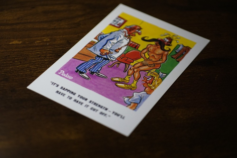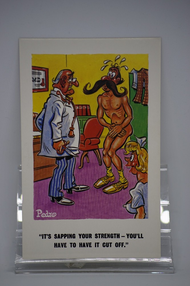 Postcard Seaside Comic Saucy Risqué Nurse Moustache Shave Constance Pedro 220 "It's Sapping Your Strength - You'll Have To Have It Cut Off." D. Constance Pedro Series No 220 Unposted. Good vintage condition. No visible damage to any of the edges. All corners slightly bent. Dirt spots, discoloration, creasing, scratches, missing paint and stains marks may be visible on single or both sides of the postcard. Good condition for its age. Please look at the photos for condition details. Additional details : Postcard is also quite far from what we know as English humour, marked by fine irony. The card was published in 1973, is signed by Pedro, belongs to the Sunny Pedro Series. What do we mean by saucy seaside postcards? The name was coined for cards featuring risqué images and innuendo. These often include images of figures scantily clad and in precarious positions. Many of these designs would not be deemed appropriate today and even at the time, as we will discover, people questioned their impact on the morality of their audience. Pedro, Fitzpatrick, Chas, Quip, Donald McGill were all an English graphic artists for seaside, risqué, comic satire, humour whose names has become synonymous with the genre of saucy postcards, particularly associated with the seaside (though they were sold throughout the UK). This cards mostly featured an array of attractive young women, fat old ladies, drunken middle-aged men, honeymoon couples and vicars. Many artists behind the designs were influenced by the one who has been called 'the king of the saucy postcard', Donald Fraser Gould McGill (28 January 1875 ? 13 October 1962) 'Saucy Postcards' are often collected and appreciated for artistic skill, its power of social observation and earthy sense of humour. Even at the height of fame top artists only earned three guineas a design, but by the 2000s original artwork could fetch thousands of pounds. Keywords: Artist Drawn Illustration ; Early Colour ; Double Entendre ; Innuendo ; Toilet Humour ; Dirty Jokes ; Rude Joke ; Funny Situations ; Novelty ; Big Boobs ; Buxom ; Plump ; Thicc ; Busty ; Sexy Lady; Sex ; Nude ; Nudes ; Nudist Club ; Naturist Club ; Naked Women ; Naked Man ; Naked Couple ; Topless Girl ; Wedding ; Marriage ; Breezybums ; Koolbums ; Fabric ; Cloth ; Rag ; Towel Roller ; Blind Garden Fence ; Neighbour ; On bed ; On Spoon ; Erectile Dysfunction ; Bikini ; Bathing Beauty ; Mouse Trap ; Hole ; Plumber ; Engineer ; Handlebar ; Doctor ; Md ; Patient ; Hospital