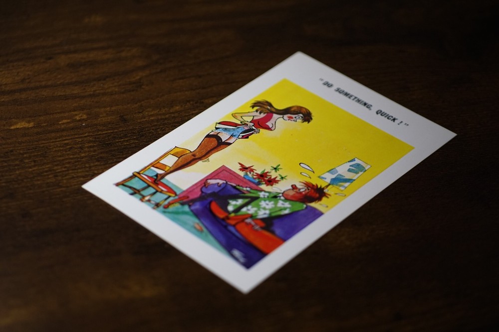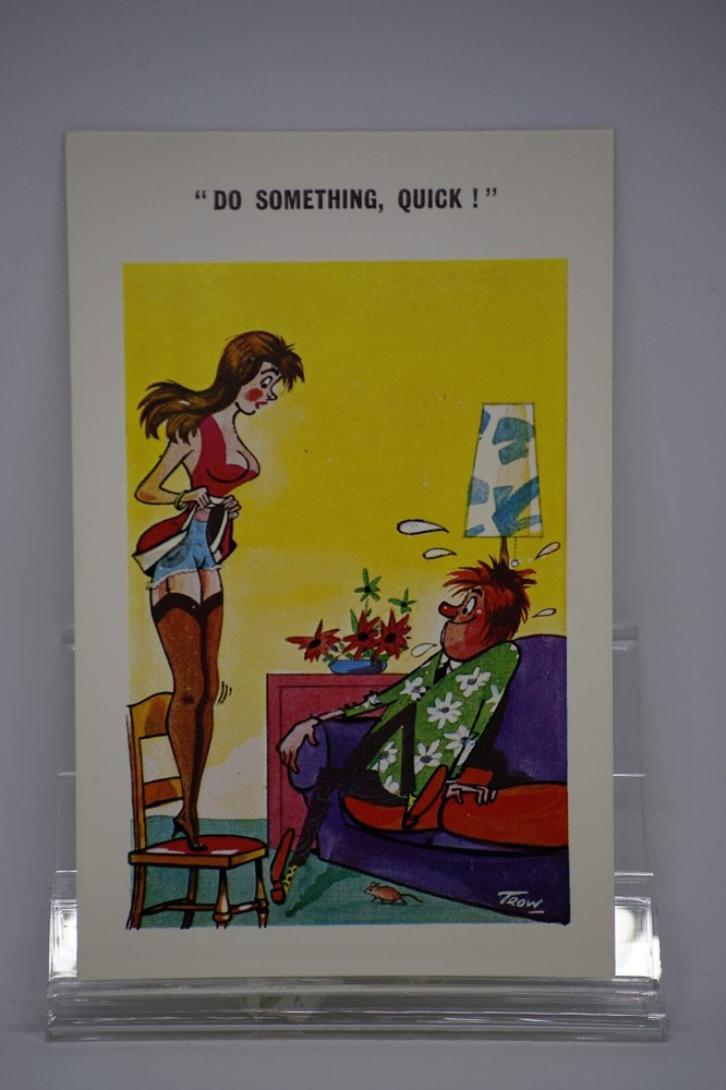 Postcard Seaside Comic Saucy Risqué Nylons Stockings Mouse Trow Constance C 4742 "Do Something, Quick!" D. Constance Quip Series No. C 4742 Unposted. Good vintage condition. No visible damage to any of the edges. All corners slightly bent. Dirt spots, discoloration, creasing, scratches, missing paint and stains marks may be visible on single or both sides of the postcard. Good condition for its age. Please look at the photos for condition details. Additional details : Postcard is also quite far from what we know as English humour, marked by fine irony. The card was published in 1973, is signed by Pedro, belongs to the Sunny Pedro Series. What do we mean by saucy seaside postcards? The name was coined for cards featuring risqué images and innuendo. These often include images of figures scantily clad and in precarious positions. Many of these designs would not be deemed appropriate today and even at the time, as we will discover, people questioned their impact on the morality of their audience. Pedro, Fitzpatrick, Chas, Quip, L.B. Martin, Ajw, Trow, Donald McGill were all an English graphic artists for seaside, risqué, comic satire, humour whose names has become synonymous with the genre of saucy postcards, particularly associated with the seaside (though they were sold throughout the UK). This cards mostly featured an array of attractive young women, fat old ladies, drunken middle-aged men, honeymoon couples and vicars. Many artists behind the designs were influenced by the one who has been called 'the king of the saucy postcard', Donald Fraser Gould McGill (28 January 1875 ? 13 October 1962) 'Saucy Postcards' are often collected and appreciated for artistic skill, its power of social observation and earthy sense of humour. Even at the height of fame top artists only earned three guineas a design, but by the 2000s original artwork could fetch thousands of pounds. Keywords: Artist drawn illustration ; Early colour ; Double entendre ; Innuendo ; Toilet humour ; Dirty jokes ; Rude joke ; Cheeky ; Funny situations ; Novelty ; Big boobs ; Buxom ; Plump ; Thicc ; Busty ; R andy ; Bawdy ; Foreplay ; Courting ; Pretty girl ; Sexy lady ; Sex ; Nude ; Nudes ; Nudist club ; Naturist club ; Naked women ; Naked man ; Naked couple ; Topless ; Nylons ; Stockings ; Wedding ; Marriage ; Wife ; Husband ; Hubby ; Breezybums ; Koolbums ; Fabric ; Cloth ; Rag ; Towel Roller ; Blind garden fence ; Neighbour ; On bed ; On spoon ; Erectile dysfunction ; Bikini ; Holiday ; Beach ; Bathing beauty ; Mouse trap ; Hole ; Plumber ; Engineer ; Deckchair ; Pub Inn ; Boomers