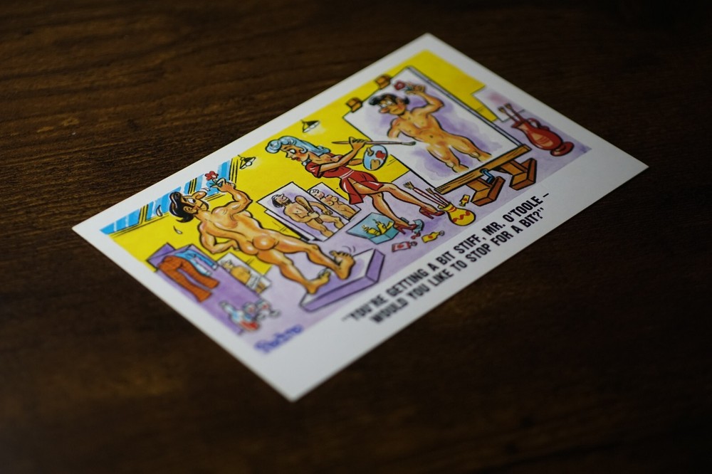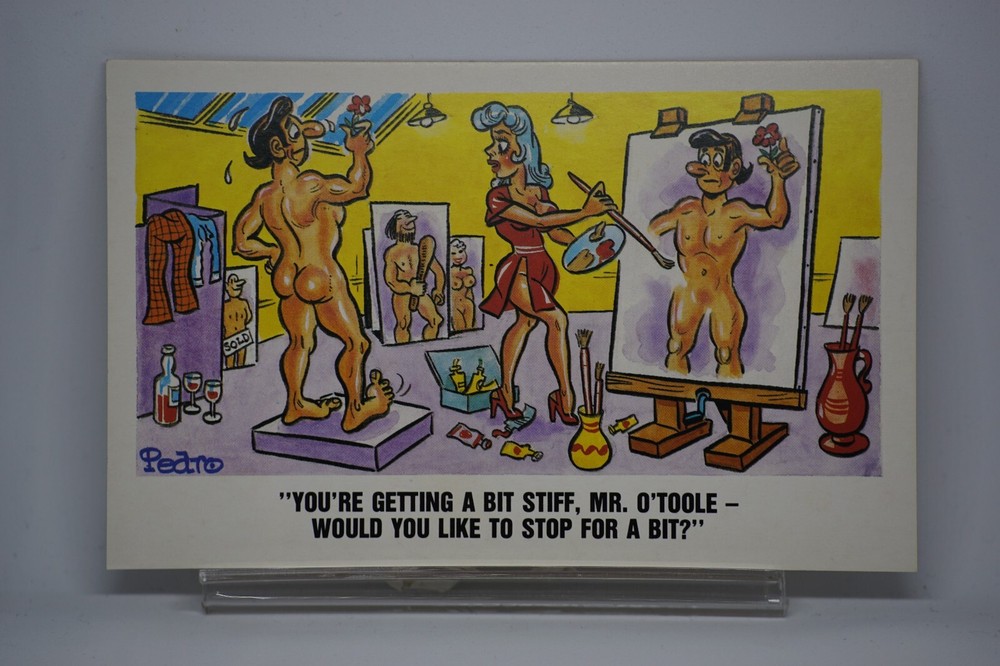Postcard Seaside Comic Saucy Risqué Painting Studio Art Atelier Sunny Pedro 255 "You're Getting A Bit Stiff, Mr. O'Toole - Would You Like To Stop For A Bit?" Sunny Pedro Series No 255 Unposted. Good vintage condition. No visible damage to any of the edges. All corners slightly bent. Dirt spots, discoloration, creasing, scratches, missing paint and stains marks may be visible on single or both sides of the postcard. Good condition for its age. Please look at the photos for condition details. Additional details : Postcard is also quite far from what we know as English humour, marked by fine irony. The card was published in 1973, is signed by Pedro, belongs to the Sunny Pedro Series. What do we mean by saucy seaside postcards? The name was coined for cards featuring risqué images and innuendo. These often include images of figures scantily clad and in precarious positions. Many of these designs would not be deemed appropriate today and even at the time, as we will discover, people questioned their impact on the morality of their audience. Pedro, Fitzpatrick, Chas, Quip, L.B. Martin, Ajw, Trow, Donald McGill were all an English graphic artists for seaside, risqué, comic satire, humour whose names has become synonymous with the genre of saucy postcards, particularly associated with the seaside (though they were sold throughout the UK). This cards mostly featured an array of attractive young women, fat old ladies, drunken middle-aged men, honeymoon couples and vicars. Many artists behind the designs were influenced by the one who has been called 'the king of the saucy postcard', Donald Fraser Gould McGill (28 January 1875 ? 13 October 1962) 'Saucy Postcards' are often collected and appreciated for artistic skill, its power of social observation and earthy sense of humour. Even at the height of fame top artists only earned three guineas a design, but by the 2000s original artwork could fetch thousands of pounds. Keywords: Artist drawn illustration ; Early colour ; Double entendre ; Innuendo ; Toilet humour ; Dirty jokes ; Rude joke ; Cheeky ; Funny situations ; Novelty ; Big boobs ; Buxom ; Plump ; Thicc ; Busty ; R andy ; Bawdy ; Foreplay ; Courting ; Pretty girl ; Sexy lady ; Sex ; Nude ; Nudes ; Nudist club ; Naturist club ; Naked women ; Naked man ; Naked couple ; Topless ; Nylons ; Stockings ; Wedding ; Marriage ; Wife ; Husband ; Hubby ; Breezybums ; Koolbums ; Fabric ; Cloth ; Rag ; Towel Roller ; Blind garden fence ; Neighbour ; On bed ; On spoon ; Erectile dysfunction ; Bikini ; Holiday ; Beach ; Bathing beauty ; Mouse trap ; Hole ; Plumber ; Engineer ; Deckchair ; Pub Inn ; Boomers ; Art ; Painting