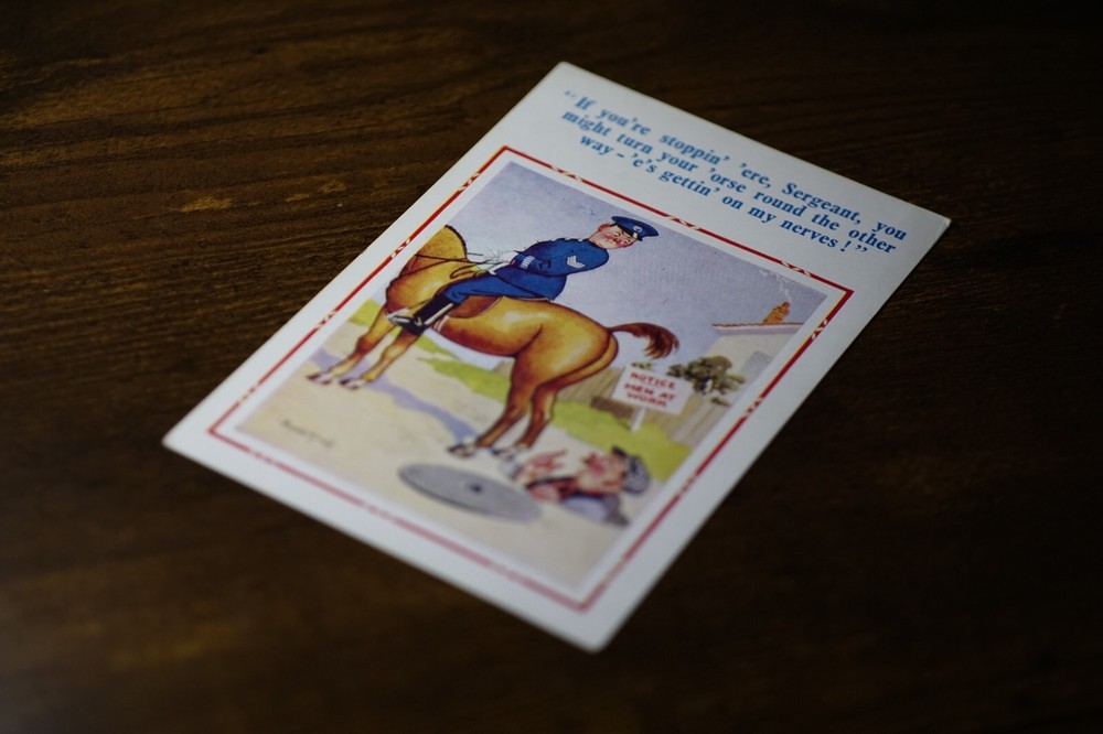Postcard Seaside Comic Saucy Risqué Police Manhole Constance Donald McGill 1632 "If you're stoppin' 'ere, sergeant, you might turn your 'orse round the other way -'e's gettin' on my nerves!" D. Constance Ltd. 22 Christchurch Rd. London Sw2 New Donald McGill Comic Series No 1632 Unposted. Good vintage condition. No visible damage to any of the edges. All corners slightly bent. Dirt spots, discoloration, creasing, scratches, missing paint and stains marks may be visible on single or both sides of the postcard. Good condition for its age. Please look at the photos for condition details. Additional details : This postcard is quite far from what we know as English humour, marked by fine irony. What do we mean by saucy seaside postcards? The name was coined for cards featuring risqué images and innuendo. These often include images of figures scantily clad and in precarious positions. Many of these designs would not be deemed appropriate today and even at the time, as we will discover, people questioned their impact on the morality of their audience. Pedro, Fitzpatrick, Chas, Quip, L.B. Martin, Maurice, Ajw, Trow, Donald McGill were all an English graphic artists for seaside, risqué, comic satire, humour whose names has become synonymous with the genre of saucy postcards, particularly associated with the seaside (though they were sold throughout the UK). This cards mostly featured an array of attractive young women, fat old ladies, drunken middle-aged men, honeymoon couples and vicars. Many artists behind the designs were influenced by the one who has been called 'the king of the saucy postcard', Donald Fraser Gould McGill (28 January 1875 - 13 October 1962) 'Saucy Postcards' are often collected and appreciated for artistic skill, its power of social observation and earthy sense of humour. Even at the height of fame top artists only earned three guineas a design, but by the 2000s original artwork could fetch thousands of pounds. Keywords: Artist drawn illustration ; Edwardian ; Victorian ; Antique ; Early colour ; Double entendre ; Humorous ; Amusing ; Entertaining ; Innuendo ; Toilet humour ; Dirty jokes ; Rude joke ; Cheeky ; Funny situations ; Novelty ; Big boobs ; Buxom ; Plump ; Thicc ; Busty ; R andy ; Bawdy ; Foreplay ; Courting ; Pretty girl ; Sexy lady ; Sex ; Nude ; Nudes ; Nudist club ; Naturist club ; Naked women ; Naked man ; Naked couple ; Topless ; Nylons ; Stockings ; Love ; Romance ; Wedding ; Marriage ; Wife ; Husband ; Hubby ; Breezybums ; Koolbums ; Fabric ; Cloth ; Rag ; Towel Roller ; Blind garden fence ; Neighbour ; On bed ; On spoon ; Erectile dysfunction ; Holiday ; Bikini ; Beach ; Sand ; Bathing beauty ; Mouse trap ; Hole ; Plumber ; Engineer ; Deckchair ; Pub Inn ; Boomers ; Policeman ; Mounted police ; Notice men at work ; Horse ; Workman in street ; Workman ; Nervous
