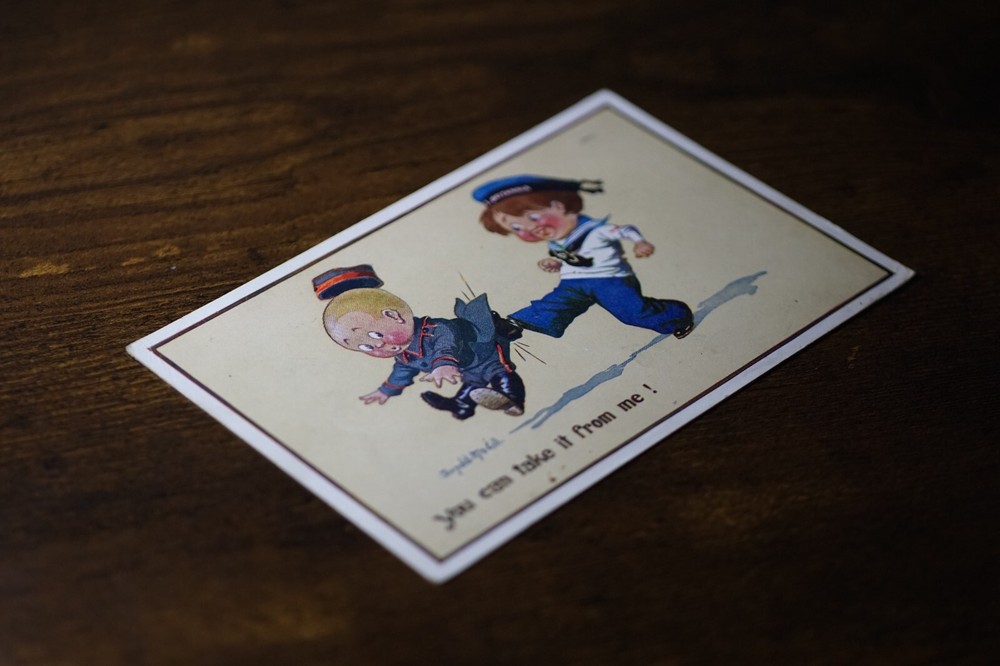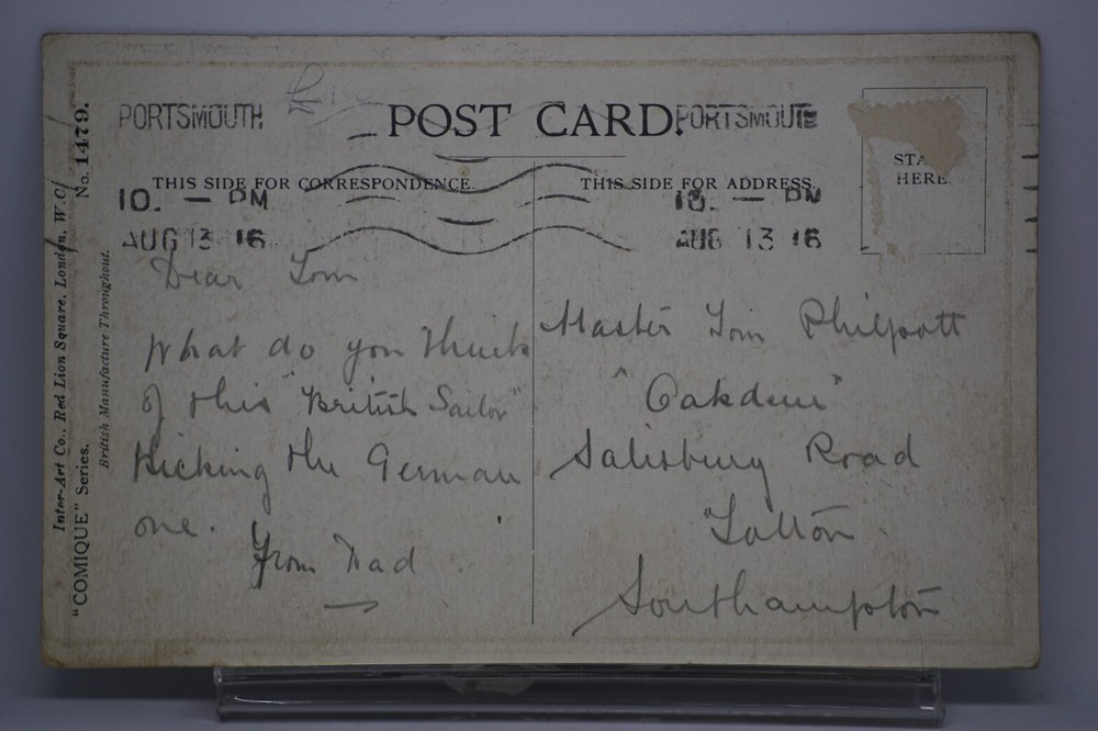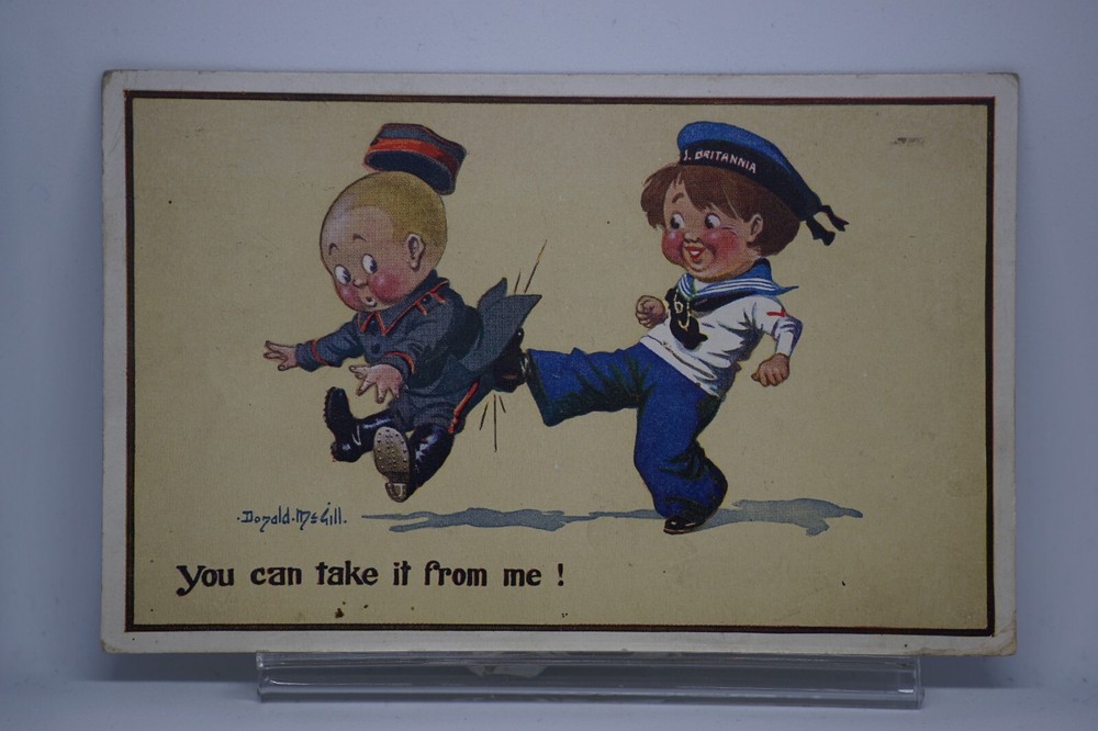 Postcard Seaside Comic Saucy Risqué Propaganda Cap Inter-Art Donald McGill 1479 " You can take it from me ! " Inter-Art Co. Florence House, Barnes, London, S.W. "Comique" Series No 1479 Posted. No stamp. Good vintage condition. No visible damage to any of the edges. All corners slightly bent. Dirt spots, discoloration, creasing, scratches, missing paint and stains marks may be visible on single or both sides of the postcard. Good condition for its age. Please look at the photos for condition details. Additional details : This postcard is quite far from what we know as English humour, marked by fine irony. What do we mean by saucy seaside postcards? The name was coined for cards featuring risqué images and innuendo. These often include images of figures scantily clad and in precarious positions. Many of these designs would not be deemed appropriate today and even at the time, as we will discover, people questioned their impact on the morality of their audience. Pedro, Fitzpatrick, Chas, Quip, L.B. Martin, Maurice, Ajw, Trow, Donald McGill were all an English graphic artists for seaside, risqué, comic satire, humour whose names has become synonymous with the genre of saucy postcards, particularly associated with the seaside (though they were sold throughout the UK). This cards mostly featured an array of attractive young women, fat old ladies, drunken middle-aged men, honeymoon couples and vicars. Many artists behind the designs were influenced by the one who has been called 'the king of the saucy postcard', Donald Fraser Gould McGill (28 January 1875 - 13 October 1962) 'Saucy Postcards' are often collected and appreciated for artistic skill, its power of social observation and earthy sense of humour. Even at the height of fame top artists only earned three guineas a design, but by the 2000s original artwork could fetch thousands of pounds. Keywords: Artist drawn illustration ; Edwardian ; Victorian ; Antique ; Early colour ; Double entendre ; Humorous ; Amusing ; Entertaining ; Innuendo ; Toilet humour ; Dirty jokes ; Rude joke ; Cheeky ; Funny situations ; Novelty ; Big boobs ; Buxom ; Plump ; Thicc ; Busty ; R andy ; Bawdy ; Foreplay ; Courting ; Pretty girl ; Sexy lady ; Sex ; Nude ; Nudes ; Nudist club ; Naturist club ; Naked women ; Naked man ; Naked couple ; Topless ; Nylons ; Stockings ; Love ; Romance ; Wedding ; Marriage ; Wife ; Husband ; Hubby ; Breezybums ; Koolbums ; Fabric ; Cloth ; Rag ; Towel Roller ; Blind garden fence ; Neighbour ; On bed ; On spoon ; Erectile dysfunction ; Bikini ; Holiday ; Beach ; Bathing beauty ; Mouse trap ; Hole ; Plumber ; Engineer ; Deckchair ; Pub Inn ; Boomers ; Tripp ; Luggage