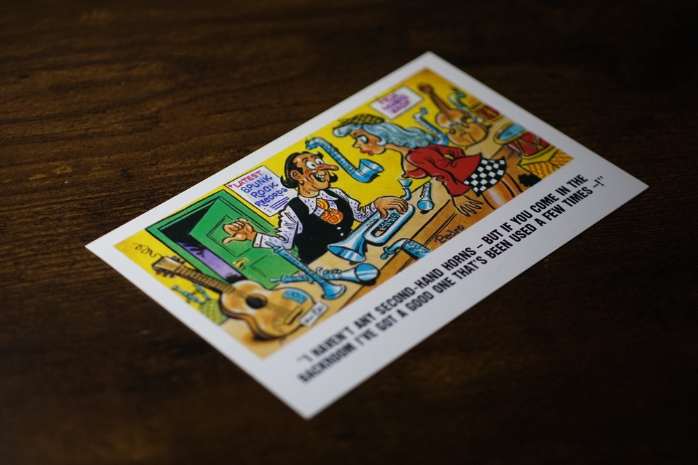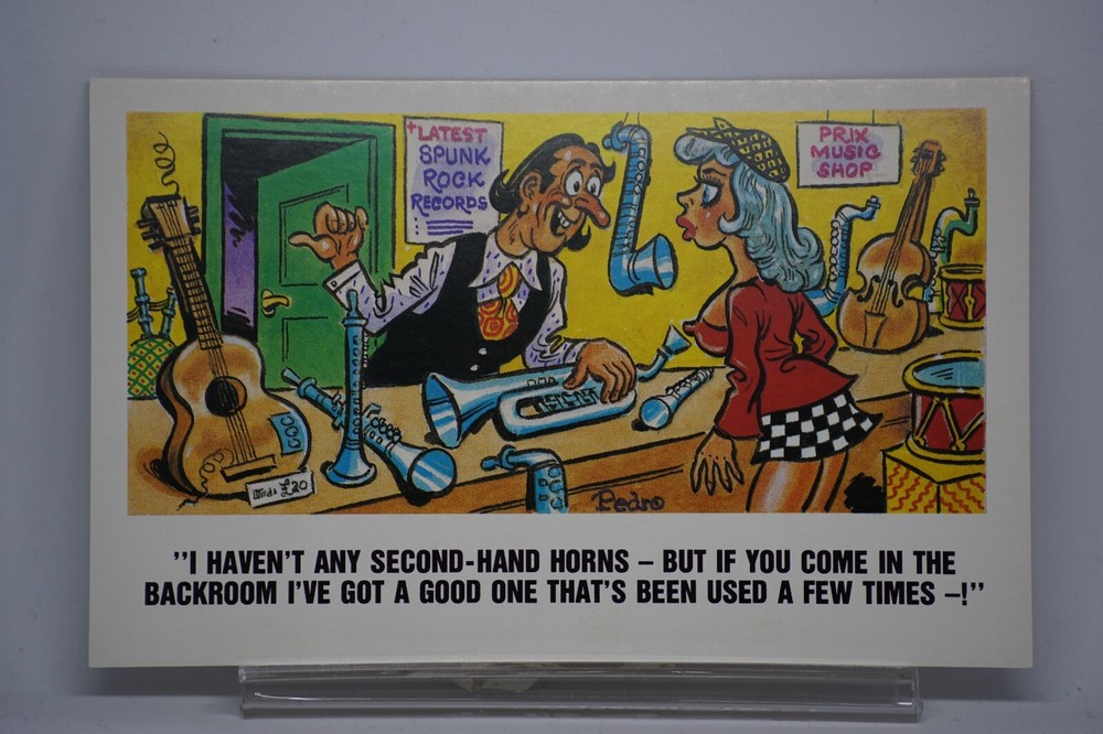 Postcard Seaside Comic Saucy Risqué Record Guitar Shop Sunny Pedro Series 254 "I Haven't Any Second-hand Horns - But If You Come In The Backroom I've Got A Good One That's Been Used A Few Times -!" Latest Spunk Rock Records Prix Music Shop Sunny Pedro Series No 254 Unposted. Good vintage condition. No visible damage to any of the edges. All corners slightly bent. Dirt spots, discoloration, creasing, scratches, missing paint and stains marks may be visible on single or both sides of the postcard. Good condition for its age. Please look at the photos for condition details. Additional details : Postcard is also quite far from what we know as English humour, marked by fine irony. The card was published in 1973, is signed by Pedro, belongs to the Sunny Pedro Series. What do we mean by saucy seaside postcards? The name was coined for cards featuring risqué images and innuendo. These often include images of figures scantily clad and in precarious positions. Many of these designs would not be deemed appropriate today and even at the time, as we will discover, people questioned their impact on the morality of their audience. Pedro, Fitzpatrick, Donald McGill were English seaside, risqué, comic satire, humour graphic artists whose names has become synonymous with the genre of saucy postcards, particularly associated with the seaside (though they were sold throughout the UK). This cards mostly featured an array of attractive young women, fat old ladies, drunken middle-aged men, honeymoon couples and vicars. Many artists behind the designs were influenced by the one who has been called 'the king of the saucy postcard', Donald Fraser Gould McGill (28 January 1875 – 13 October 1962) 'Saucy Postcards' are often collected and appreciated for artistic skill, its power of social observation and earthy sense of humour. Even at the height of fame top artists only earned three guineas a design, but by the 2000s original artwork could fetch thousands of pounds. Keywords: Artist Drawn Illustration Toilet Humour Funny Situations Novelty Big Boobs Sexy Sex Nudist Club Naturist Club Wedding Marriage Naked Women Naked Man Breezybums Koolbums Music Instrument Punk Rock