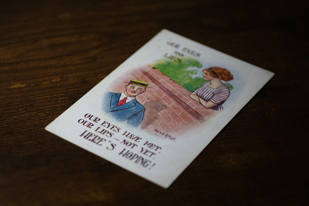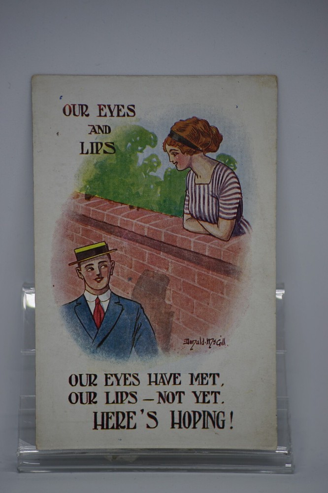 Postcard Seaside Comic Saucy Risqué Wall Fence c1920s WB Donald McGill No 19 "Our Eyes Have Met, Our Lips-not Yet. Here's Hoping! " W B. Donald McGill Series No 19 Unposted. Good vintage condition. No visible damage to any of the edges. All corners slightly bent. Dirt spots, discoloration, creasing, scratches, missing paint and stains marks may be visible on single or both sides of the postcard. Good condition for its age. Please look at the photos for condition details. Additional details : This postcard is what we know as English humour, marked by fine irony. What do we mean by saucy seaside postcards? The name was coined for cards featuring risqué images and innuendo. These often include images of figures scantily clad and in precarious positions. Many of these designs would not be deemed appropriate today and even at the time, as we will discover, people questioned their impact on the morality of their audience. Pedro, Fitzpatrick, Chas, Quip, L.B. Martin, Maurice, Ajw, Trow, Donald McGill were all an English graphic artists for seaside, risqué, comic satire, humour whose names has become synonymous with the genre of saucy postcards, particularly associated with the seaside (though they were sold throughout the UK). This cards mostly featured an array of attractive young women, fat old ladies, drunken middle-aged men, honeymoon couples and vicars. Many artists behind the designs were influenced by the one who has been called 'the king of the saucy postcard', Donald Fraser Gould McGill (28 January 1875 - 13 October 1962) 'Saucy Postcards' are often collected and appreciated for artistic skill, its power of social observation and earthy sense of humour. Even at the height of fame top artists only earned three guineas a design, but by the 2000s original artwork could fetch thousands of pounds. Keywords: Artist drawn illustration ; Edwardian ; Victorian ; Antique ; Early colour ; Double entendre ; Humorous ; Amusing ; Entertaining ; Innuendo ; Toilet humour ; Dirty jokes ; Rude joke ; Cheeky ; Funny situations ; Novelty ; Big boobs ; Buxom ; Plump ; Thicc ; Busty ; R andy ; Bawdy ; Foreplay ; Courting ; Pretty girl ; Sexy lady ; Sex ; Nude ; Nudes ; Nudist club ; Naturist club ; Naked women ; Naked man ; Naked couple ; Topless ; Nylons ; Stockings ; Love ; Romance ; Wedding ; Marriage ; Wife ; Husband ; Hubby ; Breezybums ; Koolbums ; Fabric ; Cloth ; Rag ; Towel Roller ; Blind garden fence ; Neighbour ; On bed ; On spoon ; Erectile dysfunction ; Bikini ; Holiday ; Beach ; Bathing beauty ; Mouse trap ; Hole ; Plumber ; Engineer ; Deckchair ; Pub Inn ; Boomers ; Tripp ; Luggage
