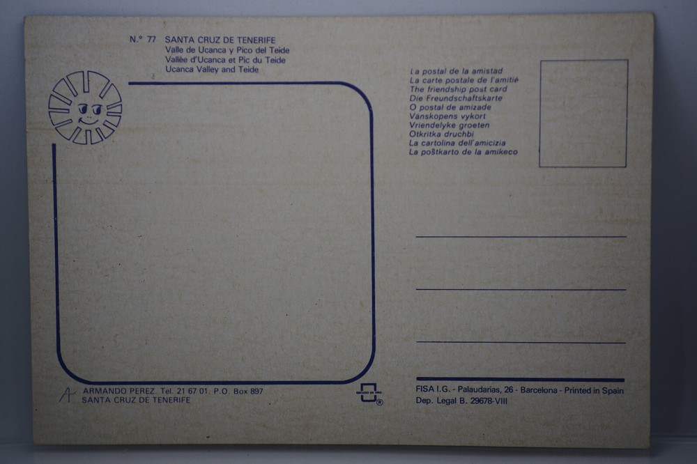 Postcard Spain Canary Islands Santa Cruz de Tenerife Volcano Teide Ucana Valley Unposted. Average vintage condition. Scratches marks throughout the surface of the face of the postcard. No visible damage to any of the edges. All corners slightly bent. Age related dirt spots, discoloration, creasing, scratches, missing paint and stains marks may be visible on single or both sides of the postcard. Average condition for its age. Please look at the photos for condition details.