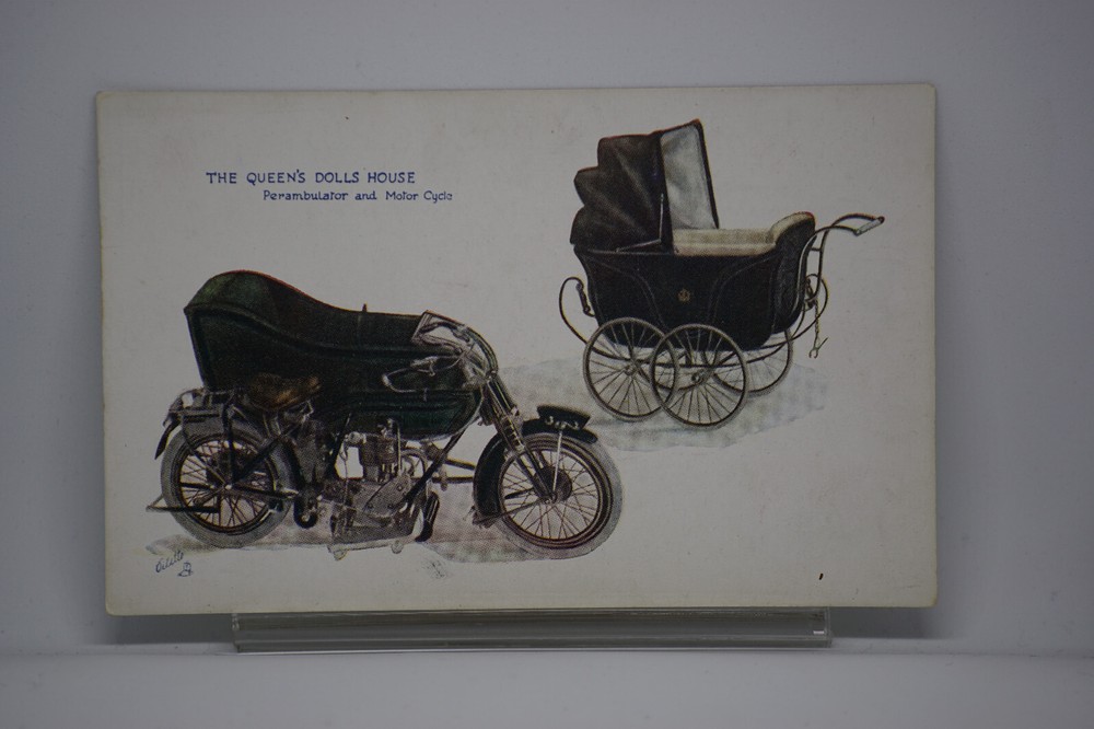 Postcard The Queen's Dolls' House Perambulator (Pram) and Motor Cycle Tuck 4505 Oilette colour lithograph Raphael Tuck & Sons Series VI No. 4505 The Queen's Dolls' House Perambulator and Motor Cycle. One of a series of postcards illustrating aspects on The Queen's Dolls' House, published by Raphael Tuck, 1920s. Queen Mary's Dolls' House is a doll's house built in the early 1920s, completed in 1924, for Queen Mary, the wife of King George V. Boudoir wall designs by Edmund Dulac. It is kept at Windsor Castle. Unposted. Good vintage condition. No visible damage to any of the edges. All corners slightly bent. Dirt spots, discoloration, creasing, scratches, missing paint and stains marks may be visible on single or both sides of the postcard. Good condition for its age. Please look at the photos for condition details.