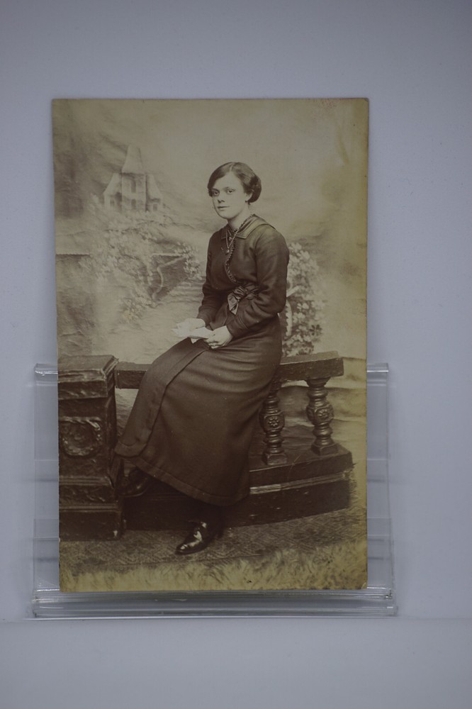 Postcard Woman Lady Portrait Hairstyle Studio Long Dress Edwardian Fashion RPPC Unposted. Good vintage condition. No visible damage to any of the edges. All corners slightly bent. Dirt spots, discoloration, creasing, scratches, missing paint and stains marks may be visible on single or both sides of the postcard. Good condition for its age. Please look at the photos for condition details. Details: RPPC - Real Photo Postcard