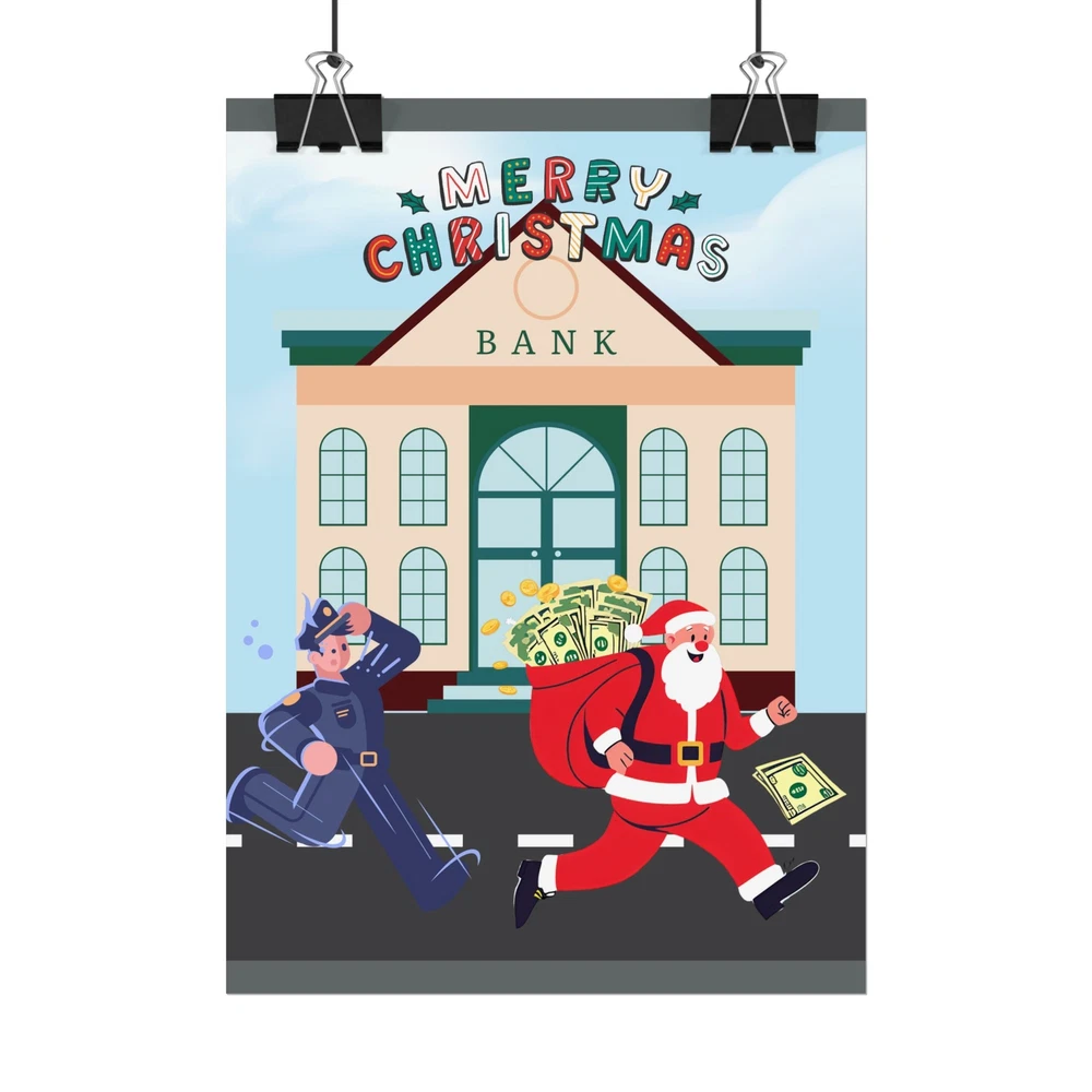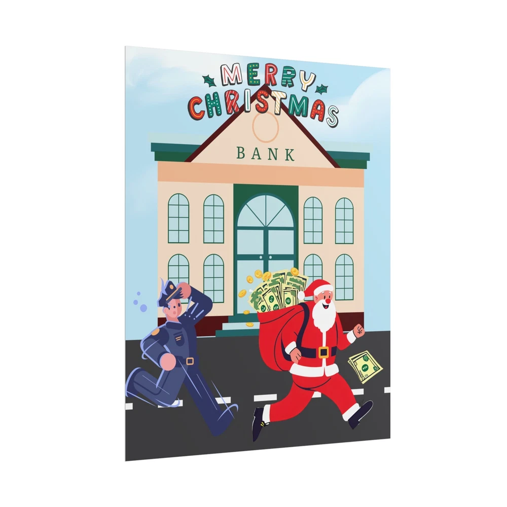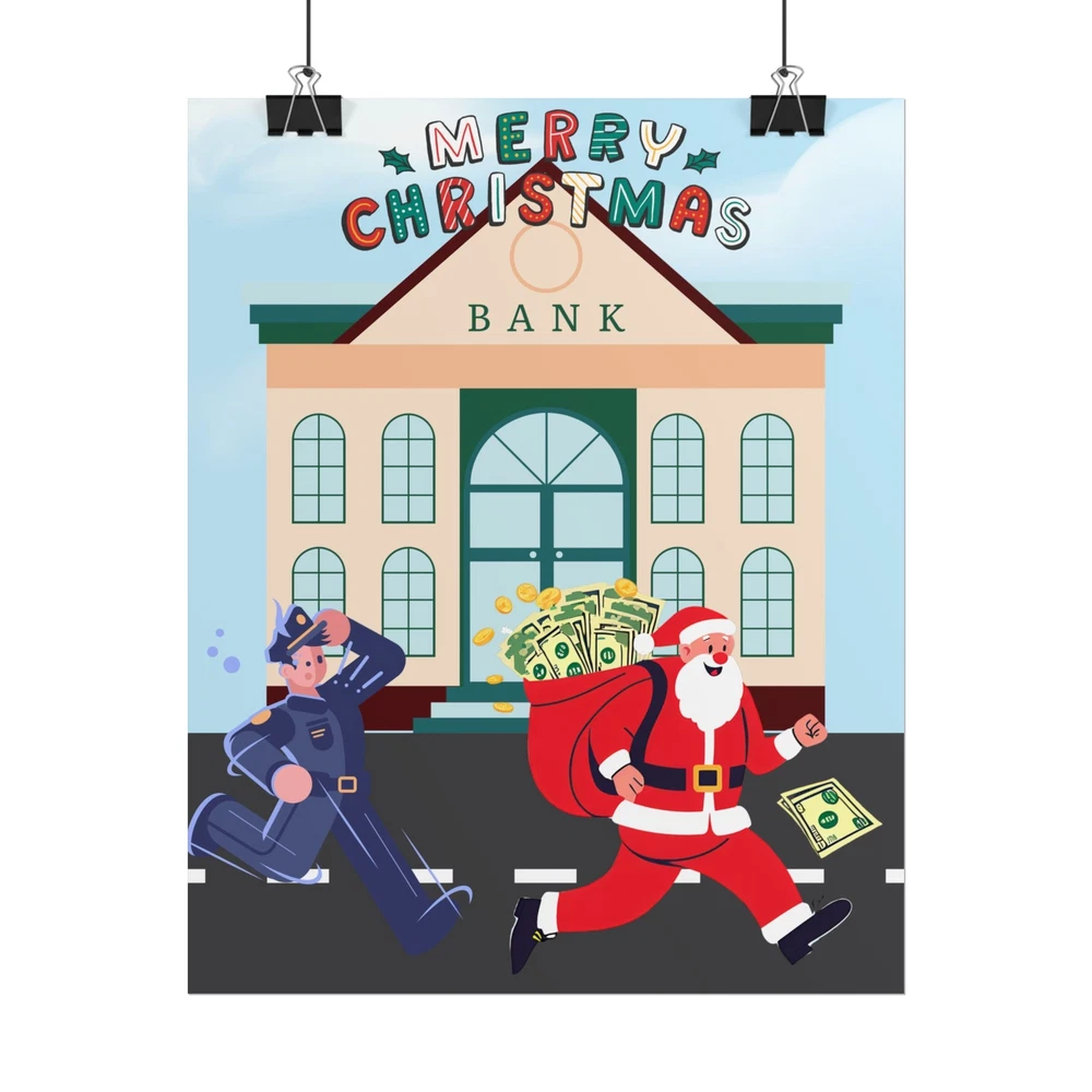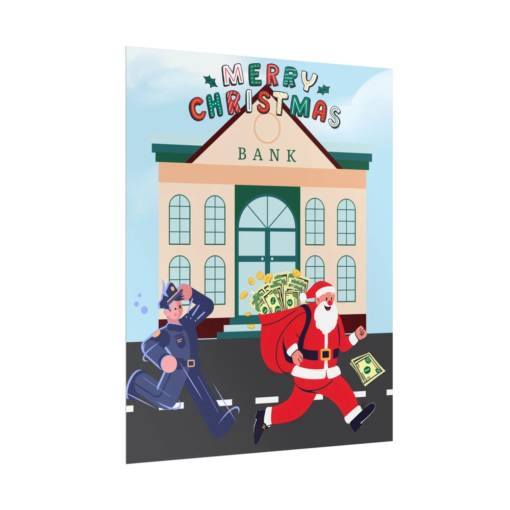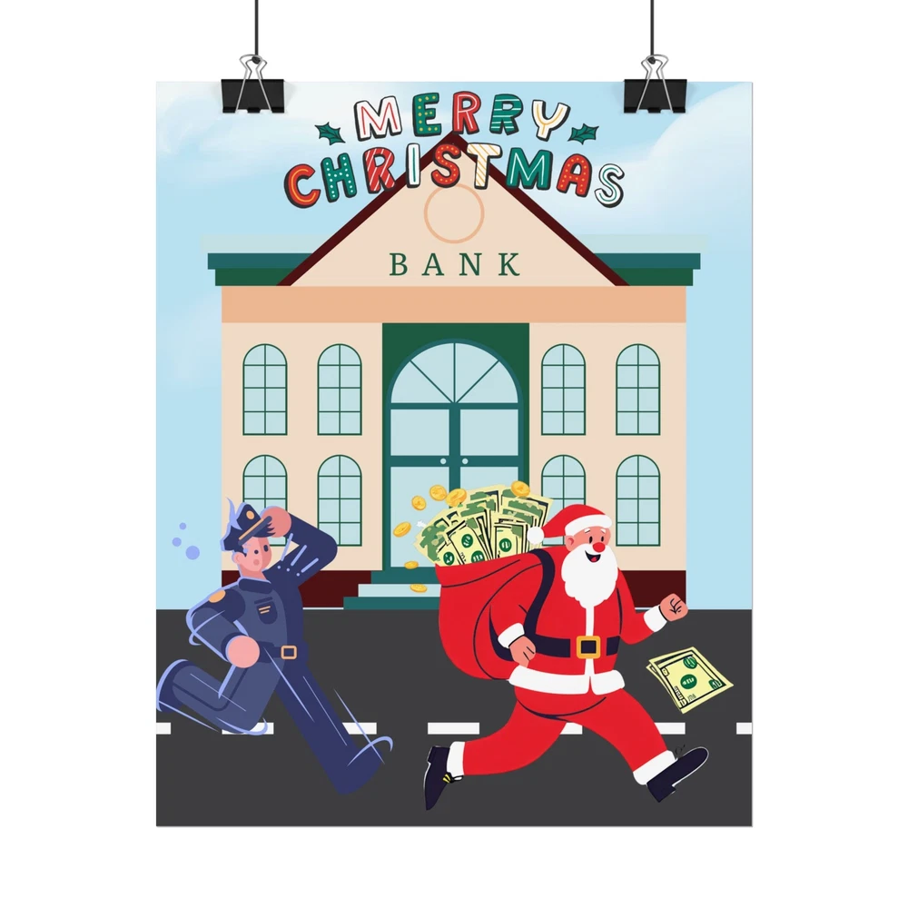 A funny poster featuring a design of Santa Claus running away from a bank with his sack full of money while being chased by a police officer. This poster adds a humorous and festive vibe to any room during the holiday season. Perfect for those who enjoy unique and quirky decor. Product features - Two paper options - semi-gloss and matte - Multiple sizes to choose from - Giclée print for bright and intense colors - Archival quality paper for long-lasting design - Satin finish for full sharp color fidelity Care instructions - If the print does gather any dust, you may wipe it off gently with a clean, dry cloth.
