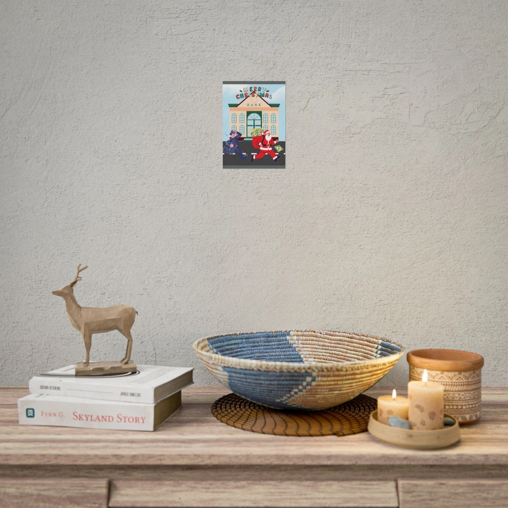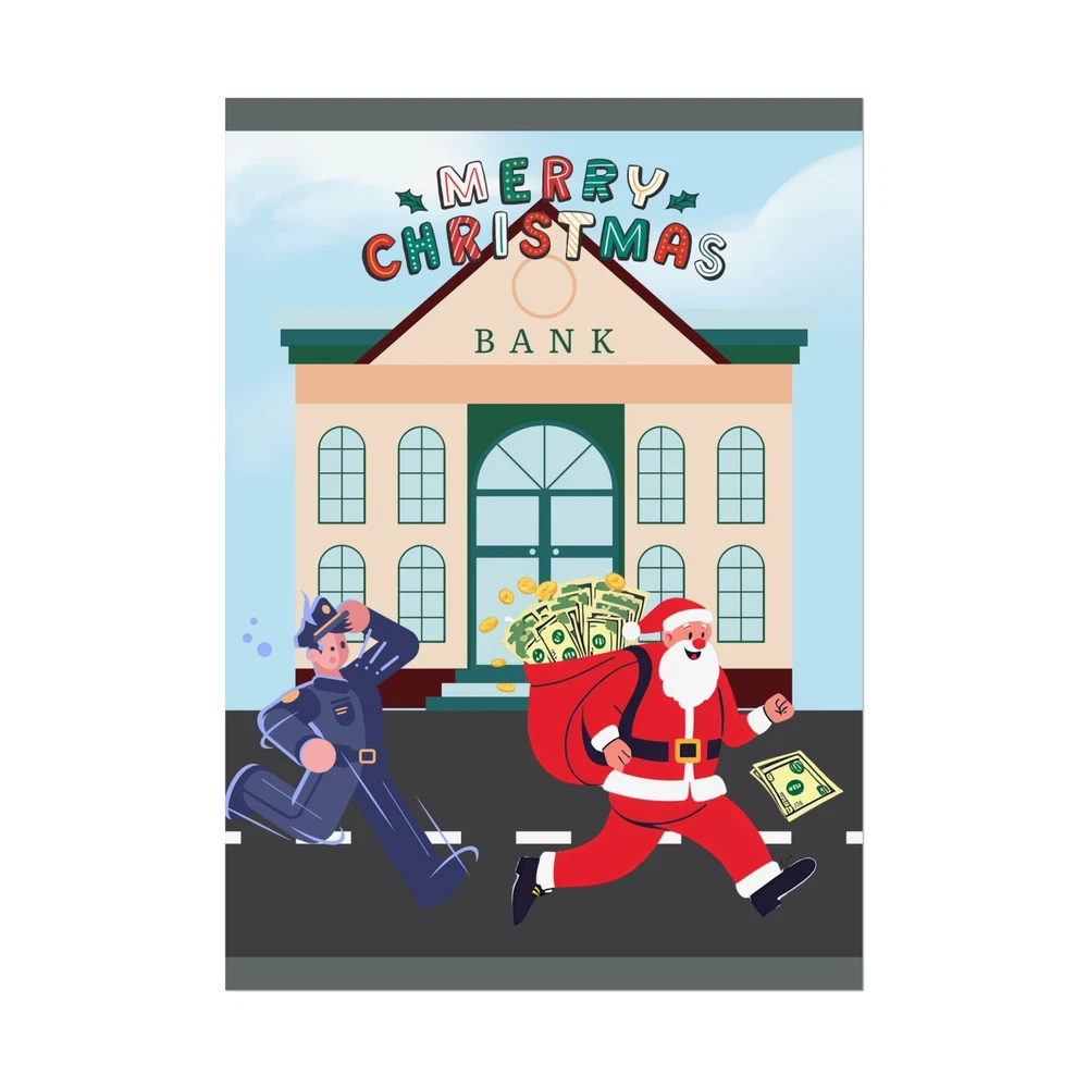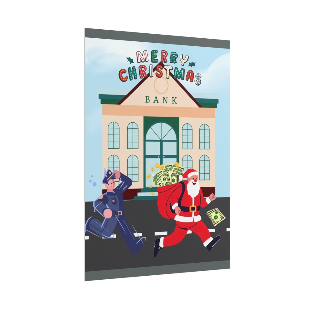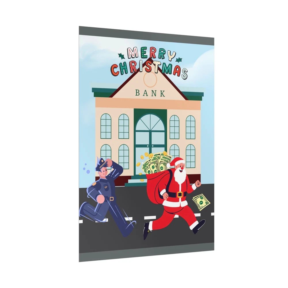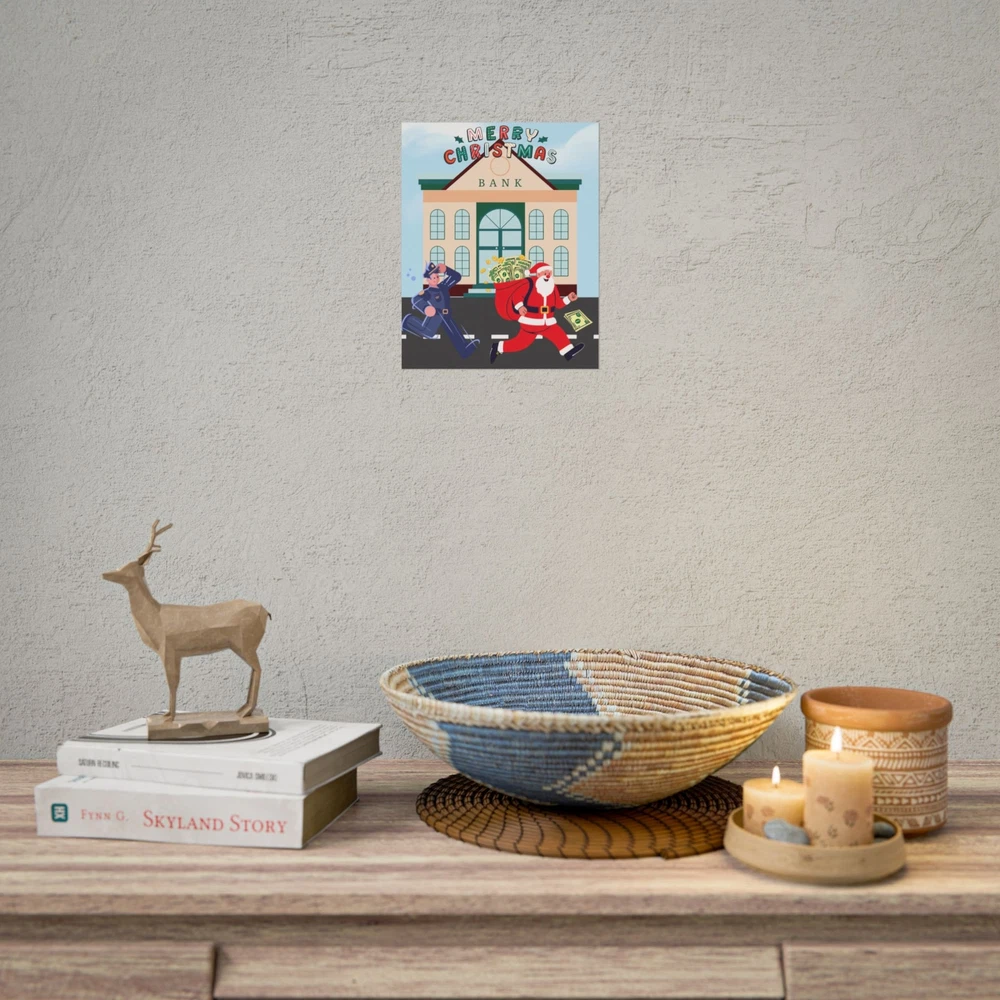 A funny poster featuring a design of Santa Claus running away from a bank with his sack full of money while being chased by a police officer. This poster adds a humorous and festive vibe to any room during the holiday season. Perfect for those who enjoy unique and quirky decor. Product features - Two paper options - semi-gloss and matte - Multiple sizes to choose from - Giclée print for bright and intense colors - Archival quality paper for long-lasting design - Satin finish for full sharp color fidelity Care instructions - If the print does gather any dust, you may wipe it off gently with a clean, dry cloth.