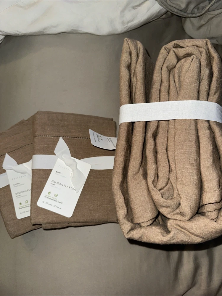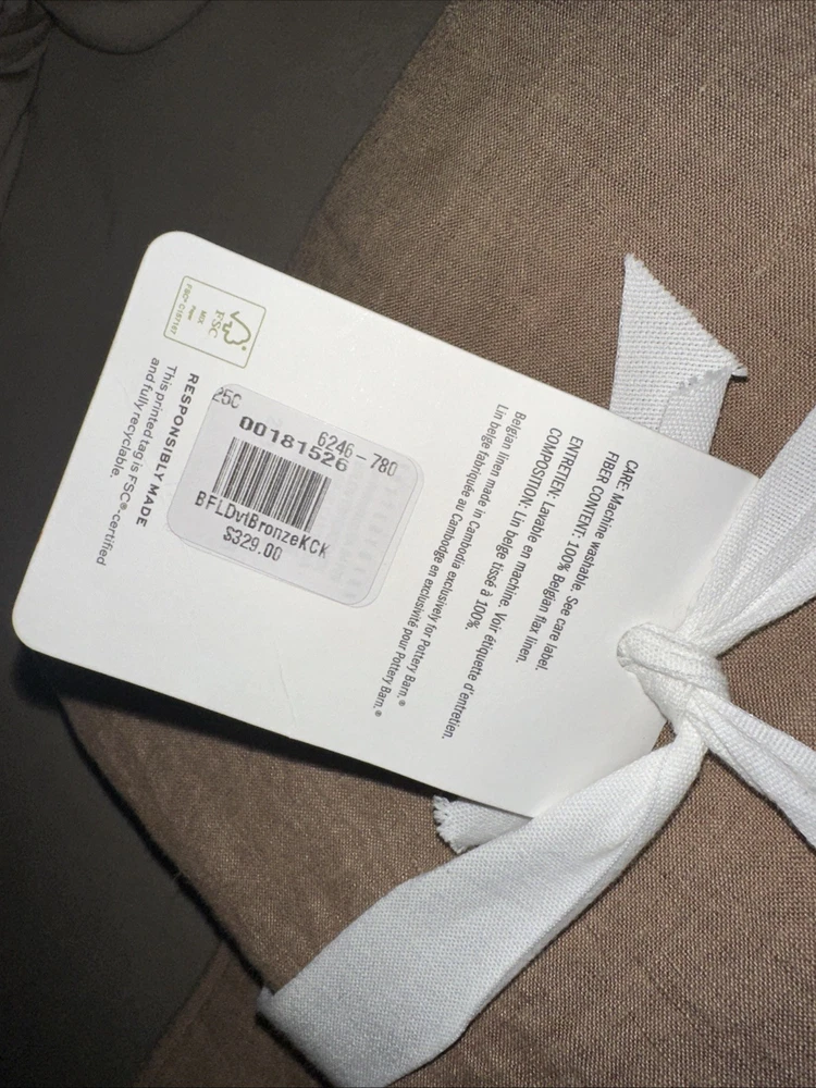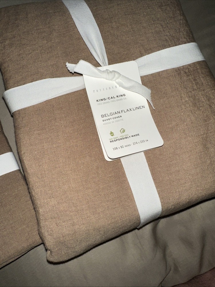 POTTERY BARN Belgian Flax Linen Duvet-White-King/California king 2 euro shams Linen woven from 100% Belgian flax. Reverses to same. prewashed for a supersoft hand feel. Ideal for warm or cool temperatures. Duvet features a hidden button closure with inner ties that keep insert in place. King/Cal. King: 92" l x 108" w
