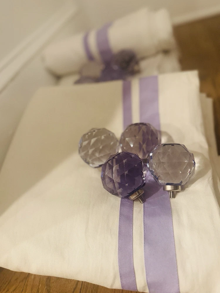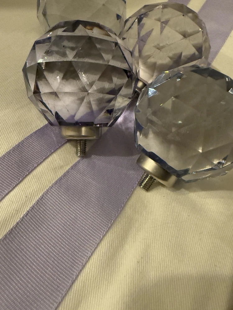 Enhance your child’s bedroom with these Pottery Barn Kids Harper Grosgrain Ribbon Blackout Drape Panels in white with purple trim. Made of 100% cotton, these stylish panels provide complete privacy and light control—perfect for naptime! • Includes: 4 panels (Buy 2, get 2 FREE! Open to selling just 2.) • Size: 44” W x 84” L each • Features: Blackout design, rod pocket heading, easy clampable installation PLEASE NOTE: 1 panel is slightly damaged and needs some TLC. Bonus Option: Also selling a beautiful set of 8 purple finials to add a stylish touch to your curtain rods! Great pre-owned condition and ready for a new home!