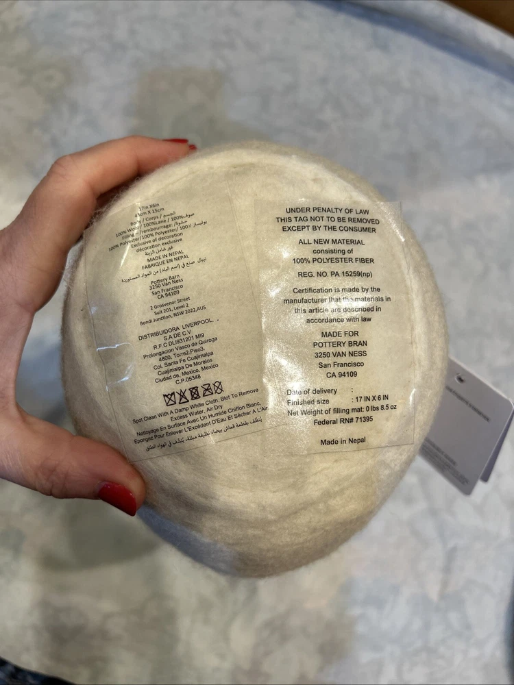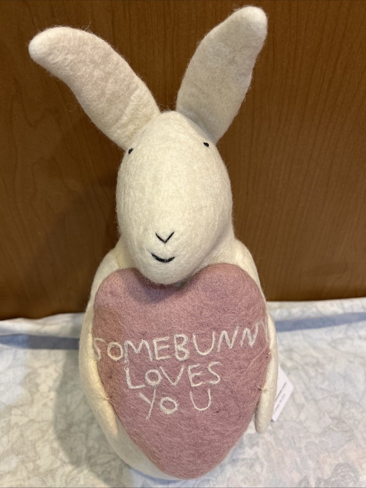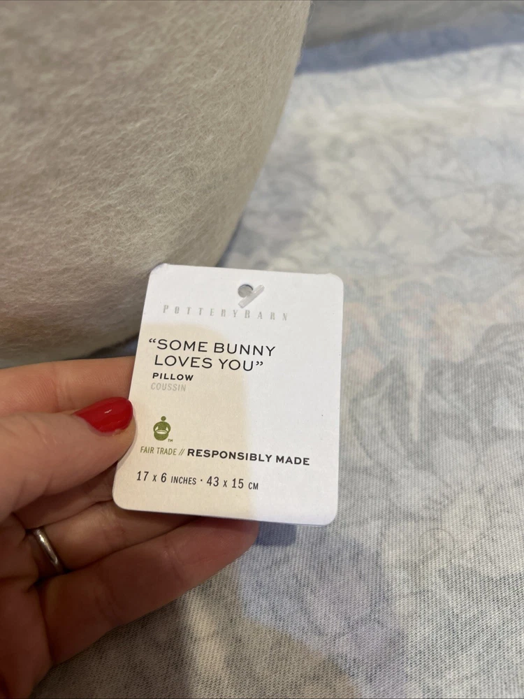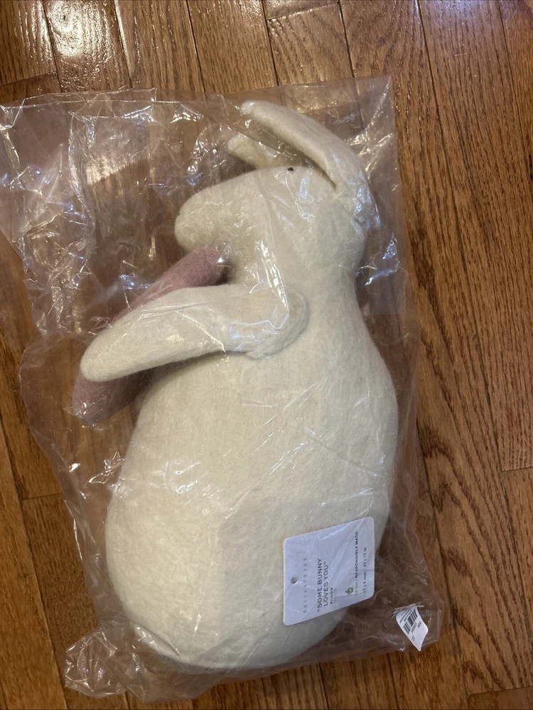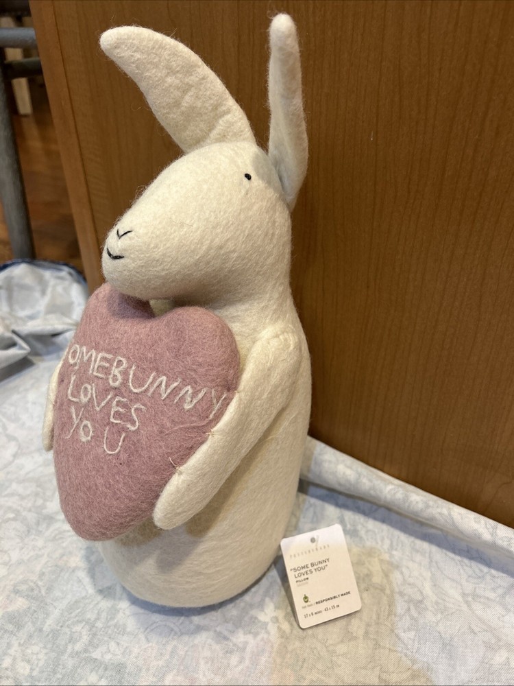 The product is a charming Pottery Barn Bunny Shaped Pillow featuring a hand-stitched design of an Easter bunny, perfect for adding a touch of whimsy to your home decor. The pillow is made of 100% wool in a white color, with a size of 6" wide by 17" high, making it a lovely decorative piece for the Easter season. The bunny theme and character of the pillow make it a delightful addition for those who love rabbits and Easter decorations.