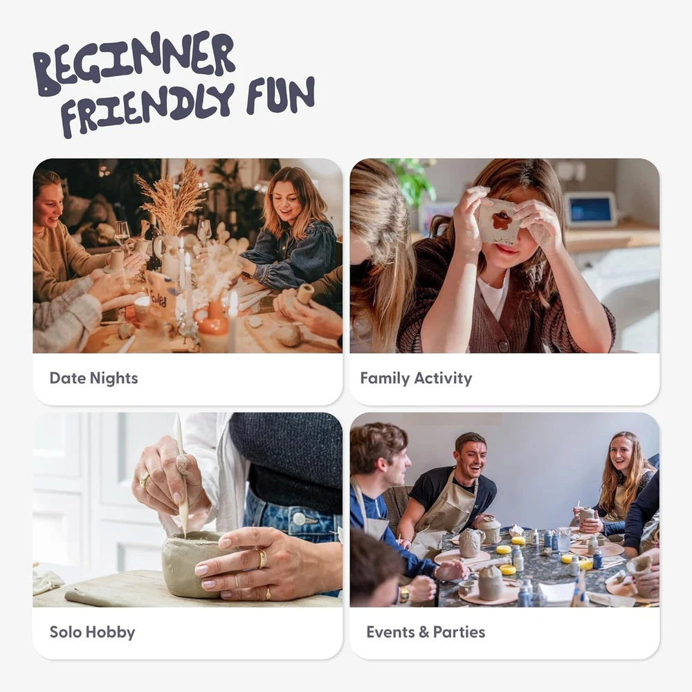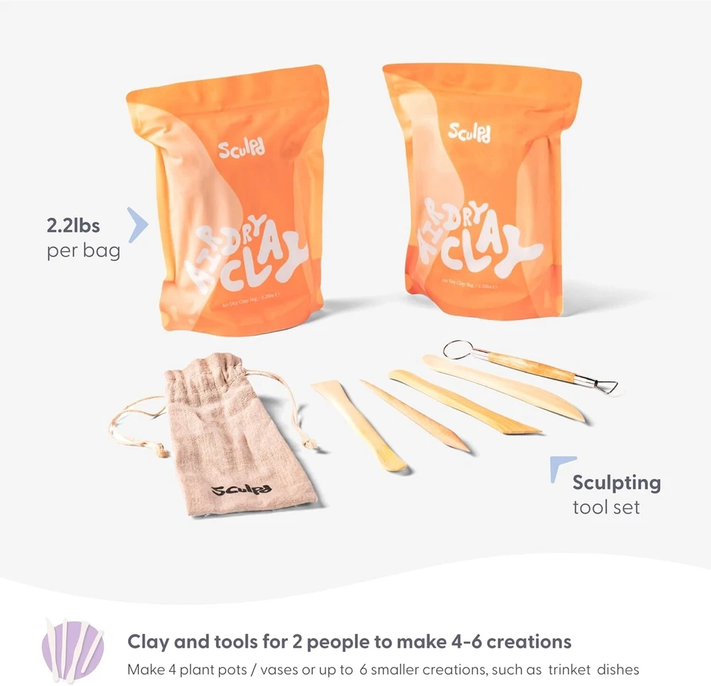 Pottery Starter Kit - Complete Air Dry Clay Beginner Set for 2 Adults: Includes Sculpting Tools, Gloss Varnish, Paint Brushes, Guide, Video Tutorials & More - Date Night Gift, Arts Crafts Hobby COMPLETE AIR DRY CLAY KIT: Your Home Pottery Set contains everything for 2 people to easily sculpt, paint, varnish, and finish beautiful waterproof plant pots, sculptures, vases, and more. WHAT YOU GET: premium air-dry clay, 5 piece sculpting tool set, white acrylic paint kit with 2 fine brushes, waterproof gloss varnish, potter's sponge, step-by-step guide & video tutorials. THE BEST AIR DRY CLAY: We use only the highest-quality British air-drying pottery clay. It's natural, soft, light & very easy to shape. 's premium air drying clay doesn't need any oven or pottery kiln. Enjoy a beautiful, natural stone-grey color with a smooth and easy-to-paint surface. PLENTY TO SHARE FOR TWO: Experience the perfect pottery gift, date night kit & hobby crafting set. Our video tutorials make clay sculpting & painting fun and easy for everybody including beginners. NEW GLOSS VARNISH: 's exclusive varnish is designed specifically for air-dry clay. It gives your pottery pieces a ceramic-looking glossy finish and makes them 100% waterproof!