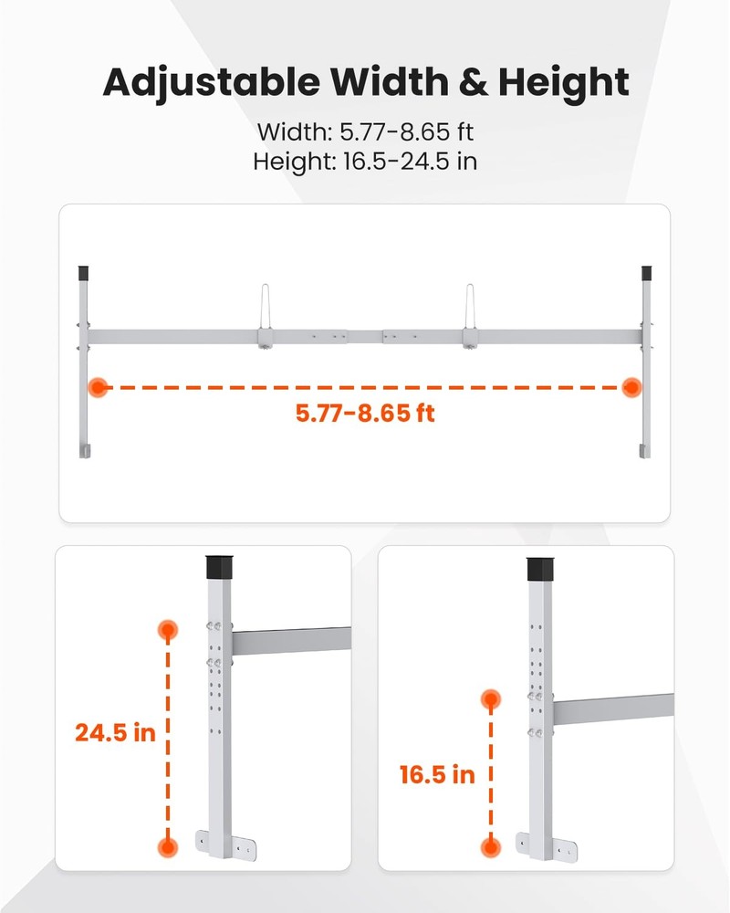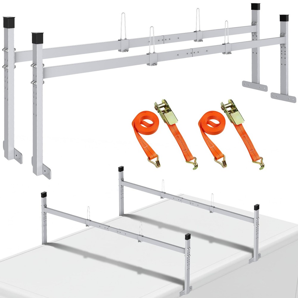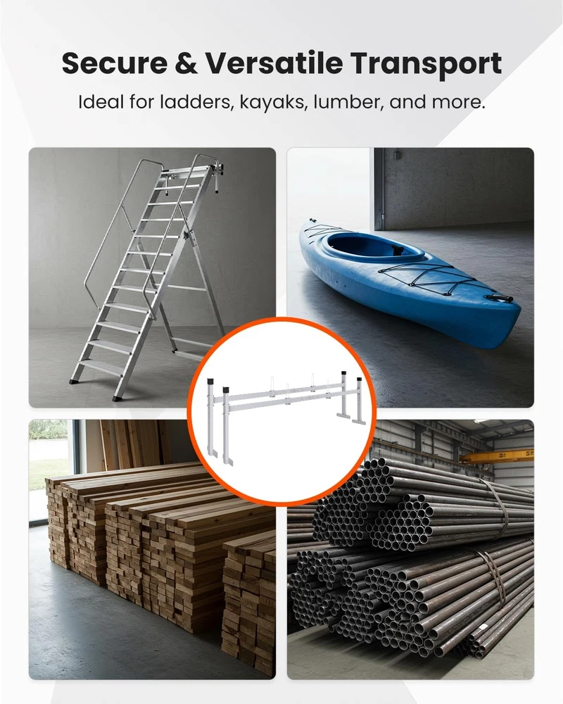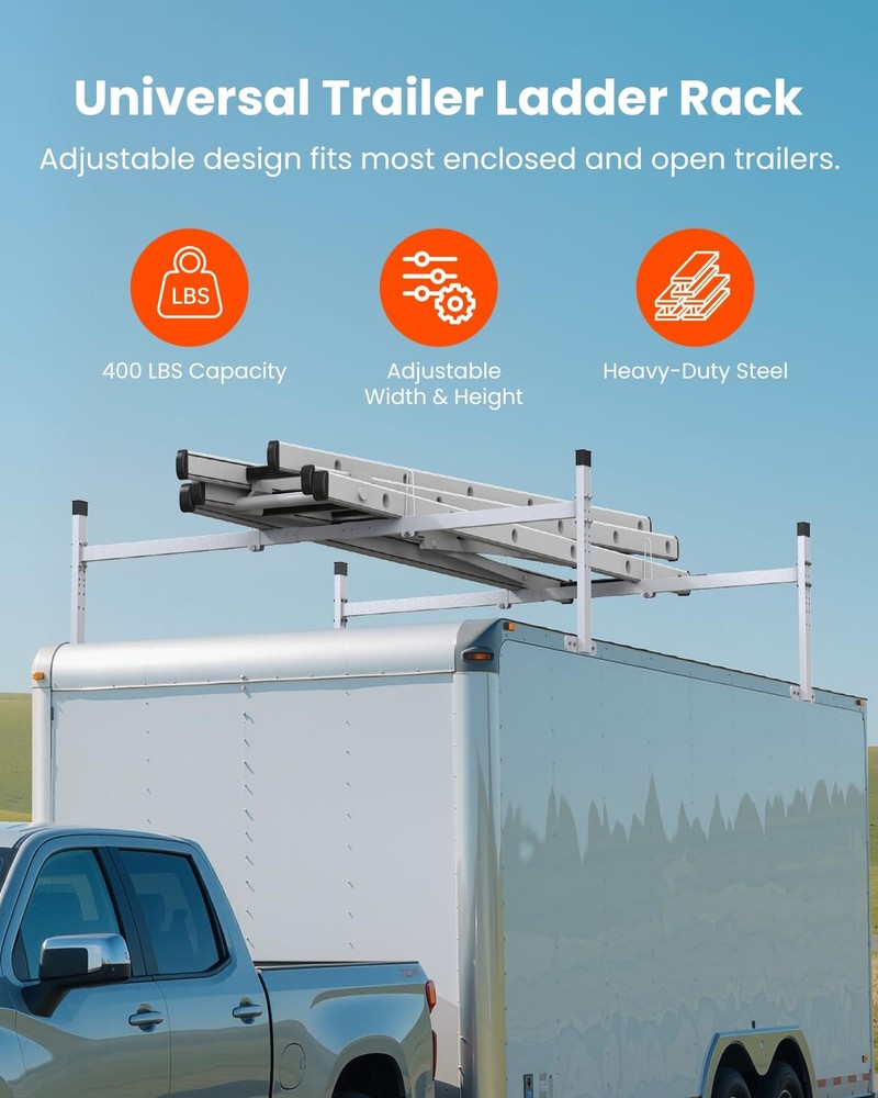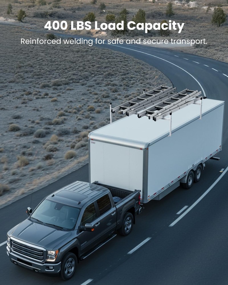 Heavy-Duty Steel Construction: Trailer ladder rack built with heavy-duty steel offers outstanding strength and durability. Finished with a sliver powder-coated surface, it's made to withstand harsh outdoor conditions 400 LBS Load Capacity: Dual-rack design with reinforced welding supports up to 400 lbs of evenly distributed weight. Perfect for carrying ladders, lumber, pipes, and more Adjustable Width and Height: Ladder Rack adjusts from 5.77 ft to 8.65 ft in width and 16.5 inch to 24.5 inch in height, allowing flexible installation on most enclosed and open trailers. Easy to trim and fit as needed Easy Installation: Comes with all mounting hardware and clear instructions for quick setup. Self-tapping screws and heavy-duty bolts ensure secure attachment Secure and Versatile Transport: Ladder Rack built-in ladder stoppers prevent shifting during transit. Ideal for transporting ladders, kayaks, lumber, or other oversized items On Nov 3, 2025 at 11:10:10 PST, seller added the following information: